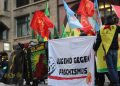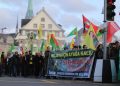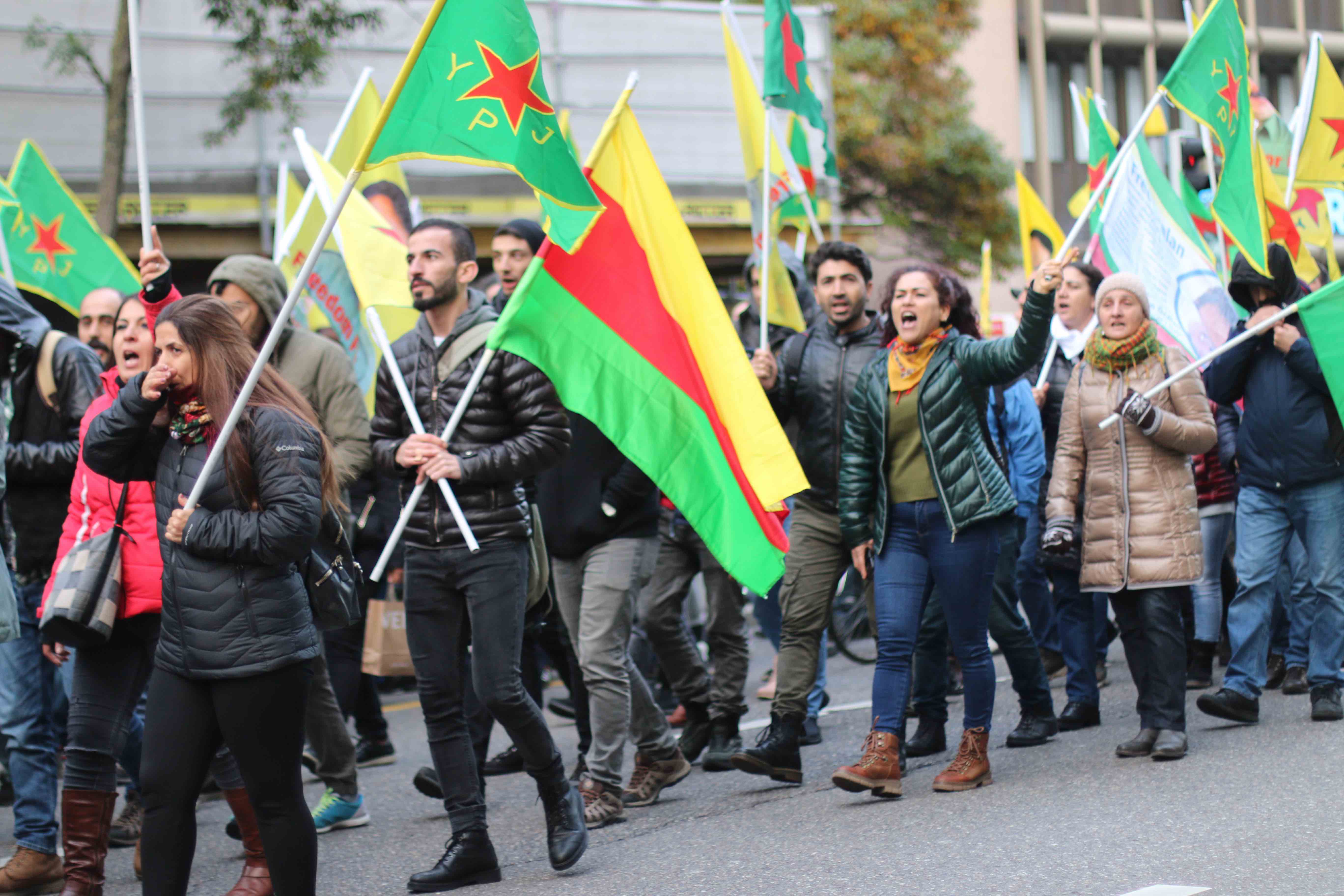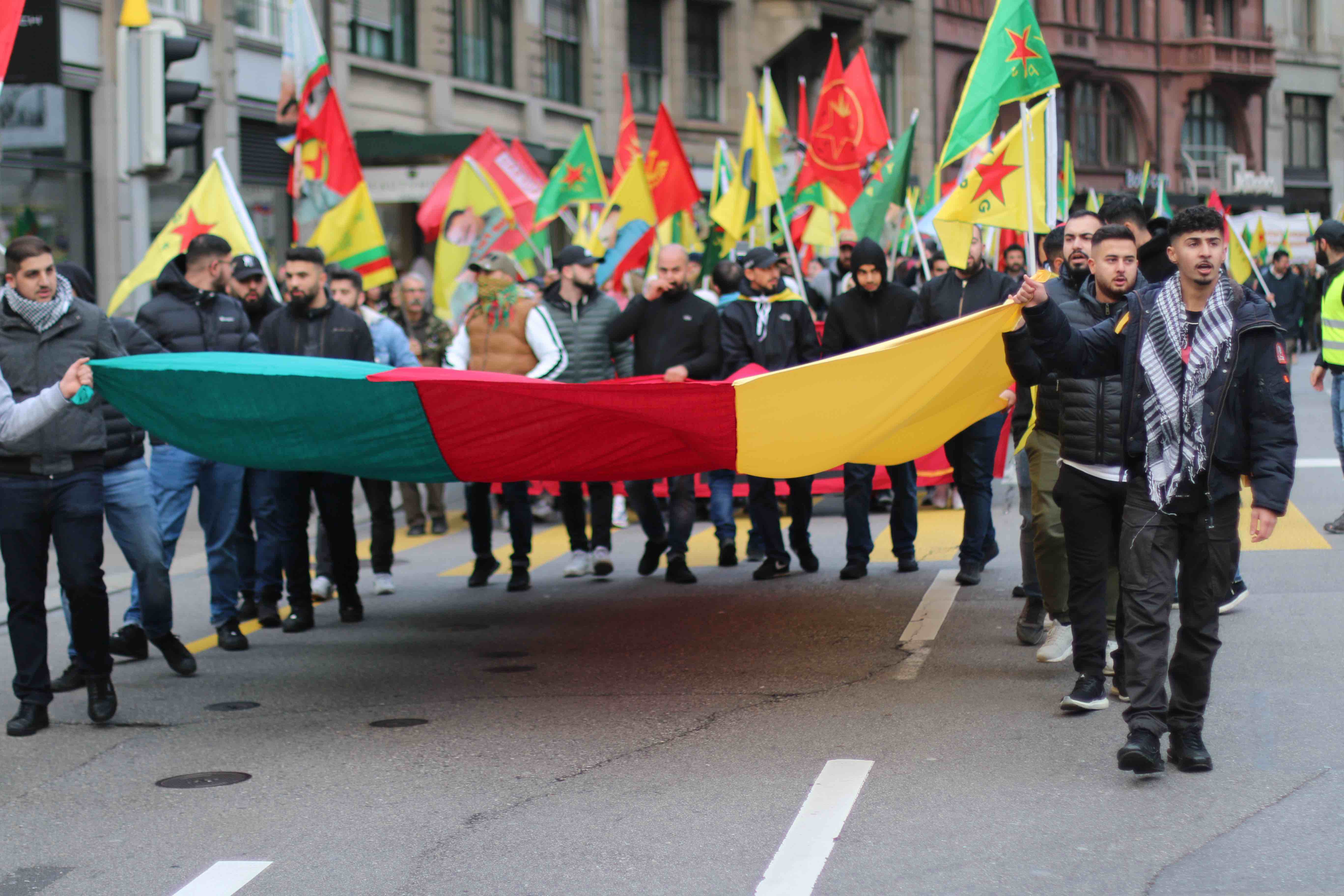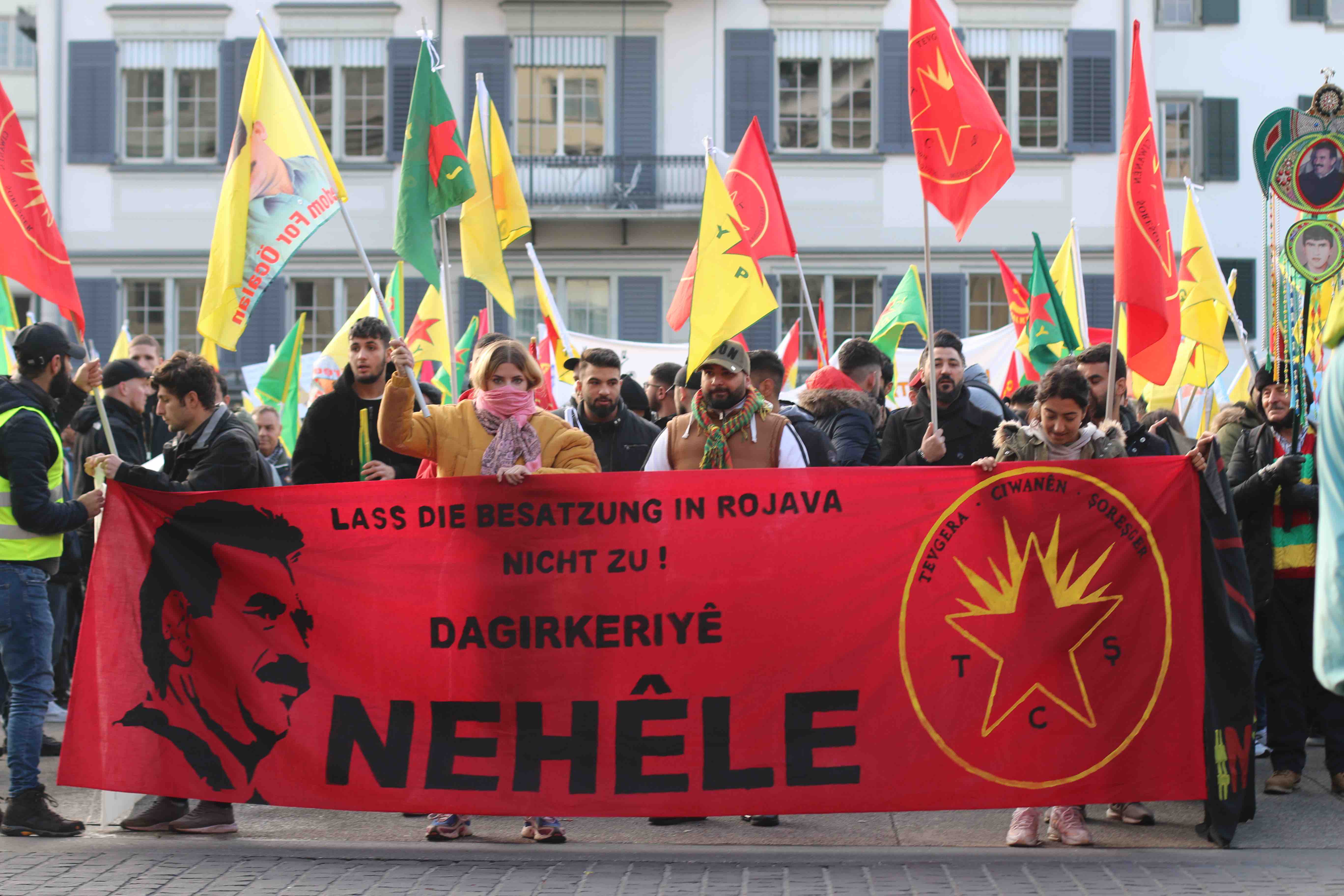 ZÜRİH – İnsanlık düşmanı Türk devletinin Rojava’ya dönük işgal ve soykırım saldırılarını protesto etmek, Onur Direnişi’nin sesini yükseltmek için TCŞ ve JCA’nın öncülüğünde bir eylem düzenlendi. Saat 14.30’da Zürih Rathausbrücke’de bir araya gelen binin üzerinde Kürdistanlı ve enternasyonalist, Onur Direnişi şehitleri anısına yapılan saygı duruşu ile yürüyüşe başladı. Üzerinde Almanca ve Kürtçe ‘İşgale İzin Verme!’ yazan pankart ile başlayan yürüyüşte, yüzlerce YPG-YPJ, TCŞ ve Halklar Önderi Abdullah Öcalan’ın bayrak ve posterleri taşındı.