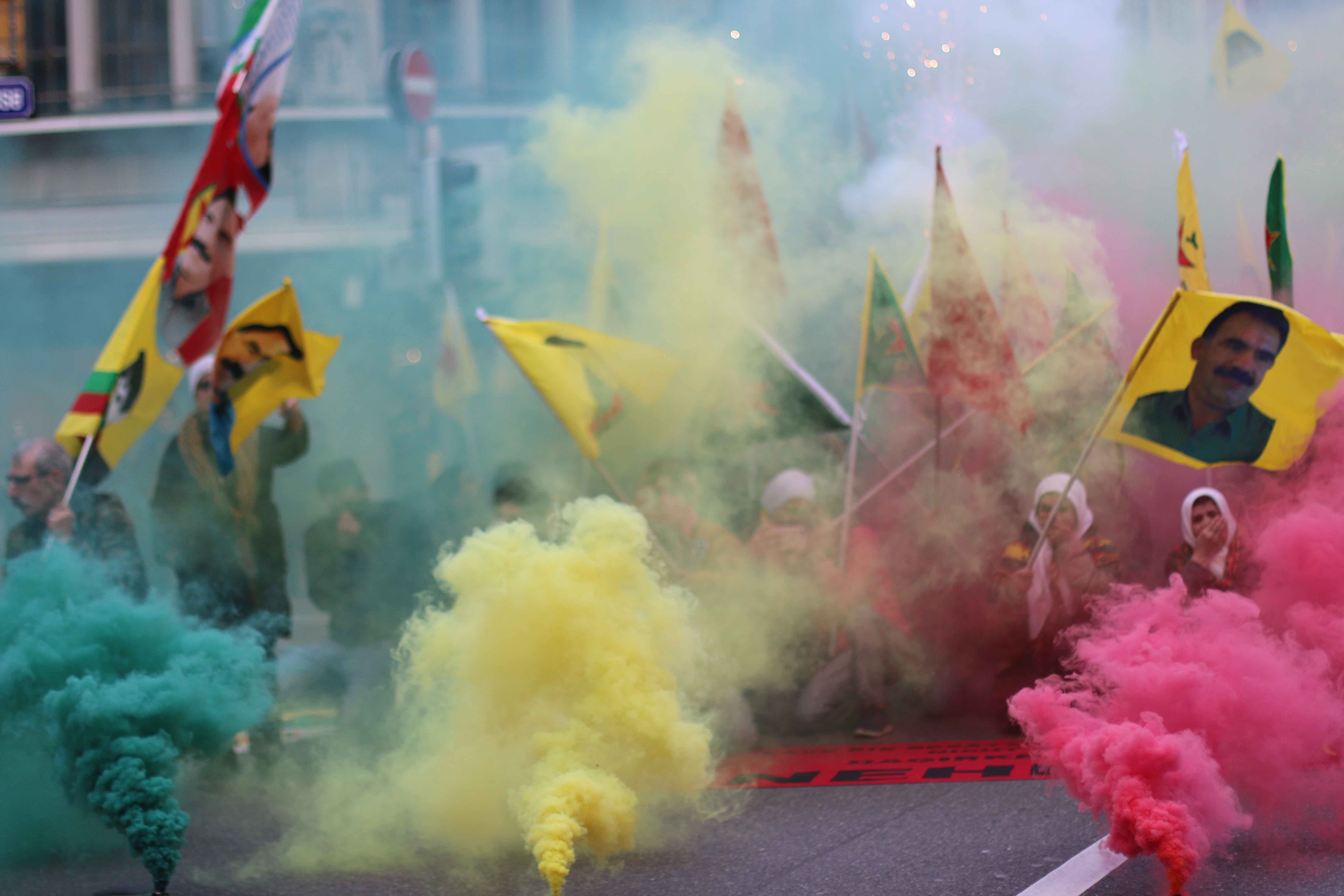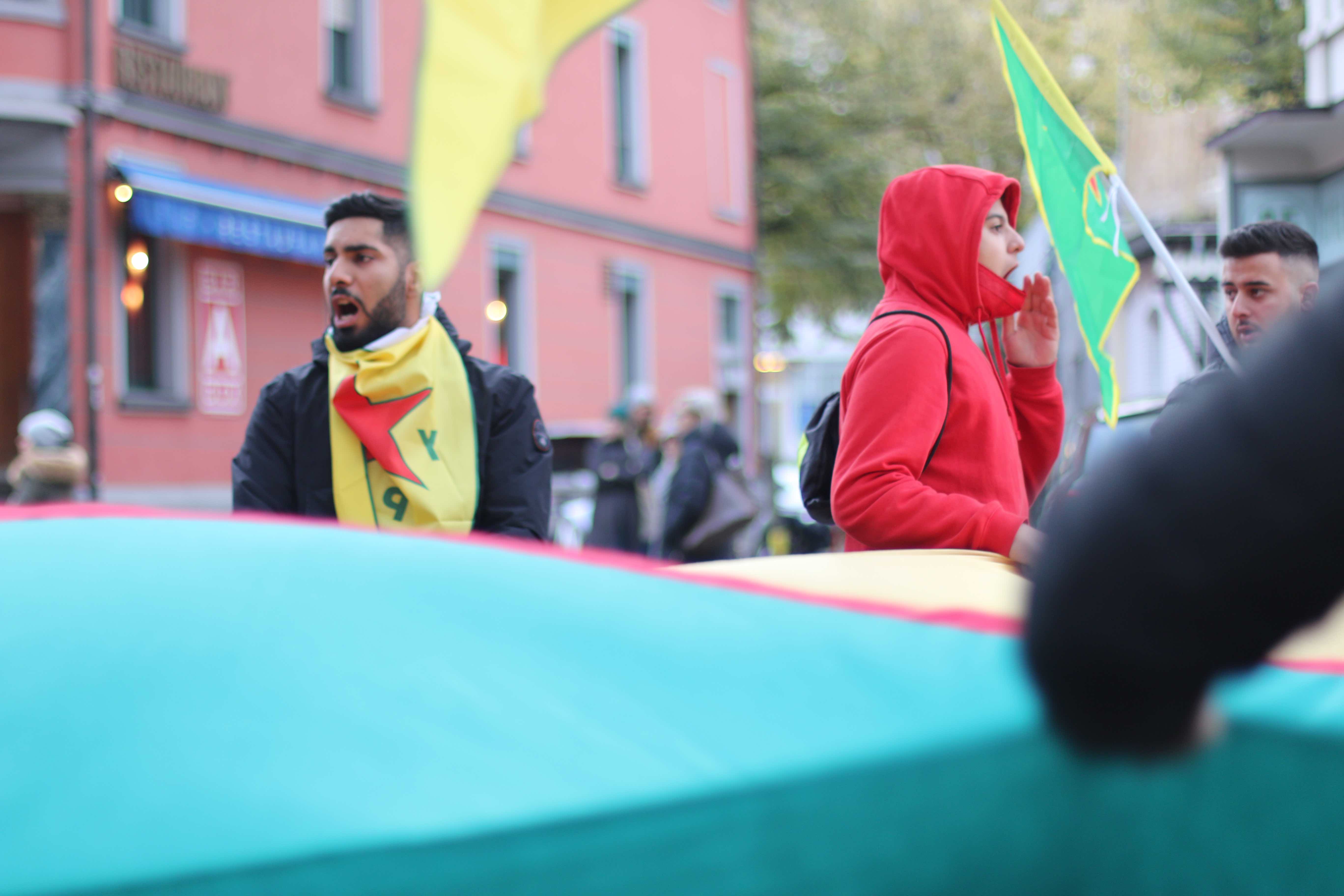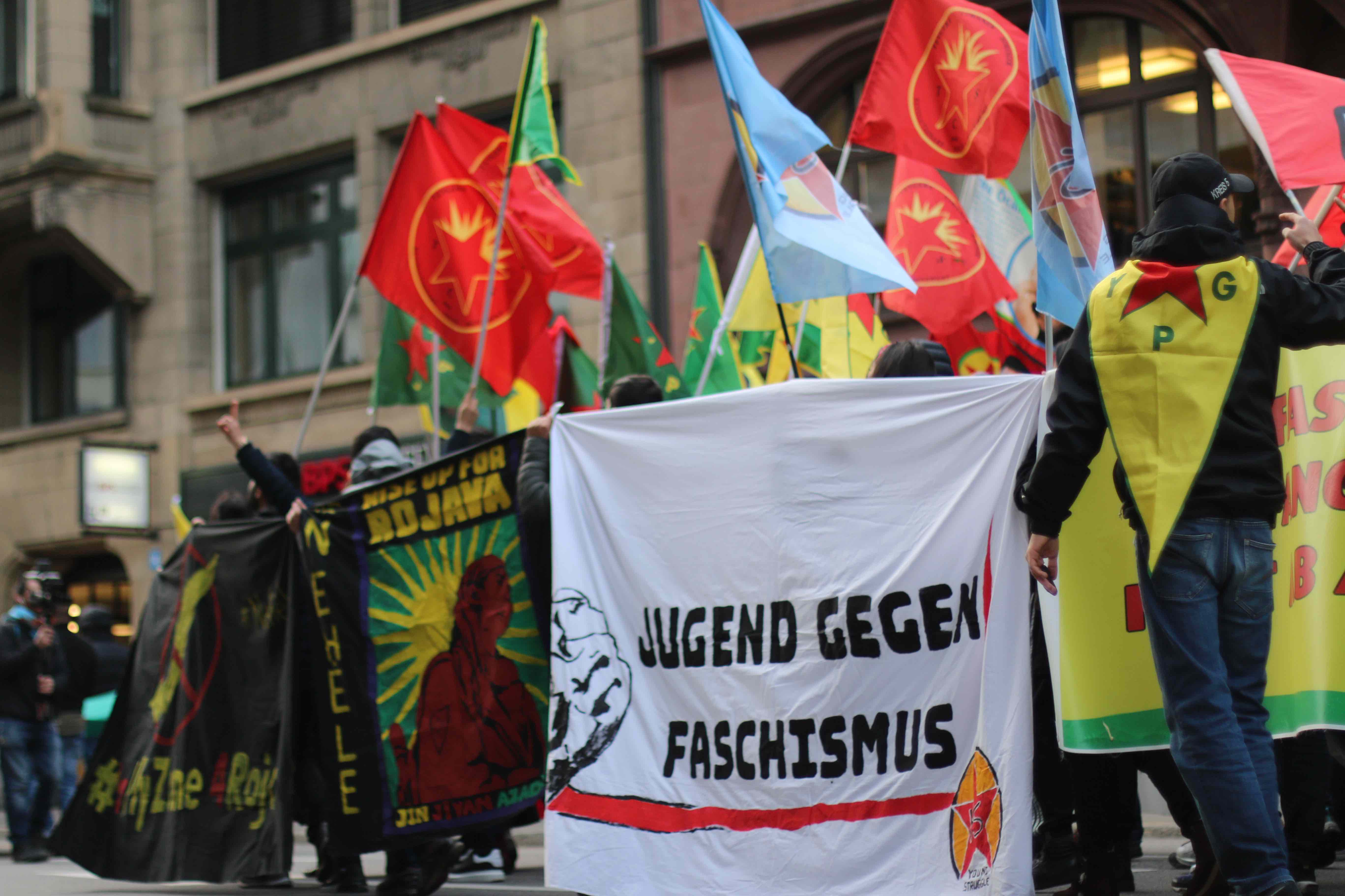 Eyleme 12 Ekim’de TCŞ ve JCA tarafından ilanı yapılan ‘Nehêle’ eylem hamlesi damgasını vurdu. Pankart ve sloganlarda sık sık ‘İşgale, faşizme, tecride İzin Verme!’ sloganları atılırken, gençlerdeki öfke dikkat çekti. Yürüyüşte gençler sık sık havai fişekler attı  ve renkli sisler yaktı. Gençler yürüyüş boyunca Almanca, faşist Türk devletinin Rojava yönelik işgali ve burada işlediği savaş suçlarını teşhir eden bildiriler dağıttı.