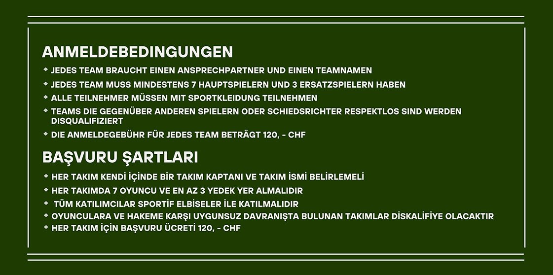 5 Mayıs’ta Luzern’de bulunan Allmend Süd’te gerçekleşecek olan turnuva için, başvuran takımlar arasında kura çekimi yapılacak. Yarı final ve devamında final maçları oynayacak olan takımların arasından 1. olan takım 25 Mayıs’ta Freiburg’da gerçekleşecek olan festivalde, Almanya, Fransa, Belçika, Hollanda gibi ülkelerden 1. olan takımlar ile şampiyonluk mücadelesi verecek.