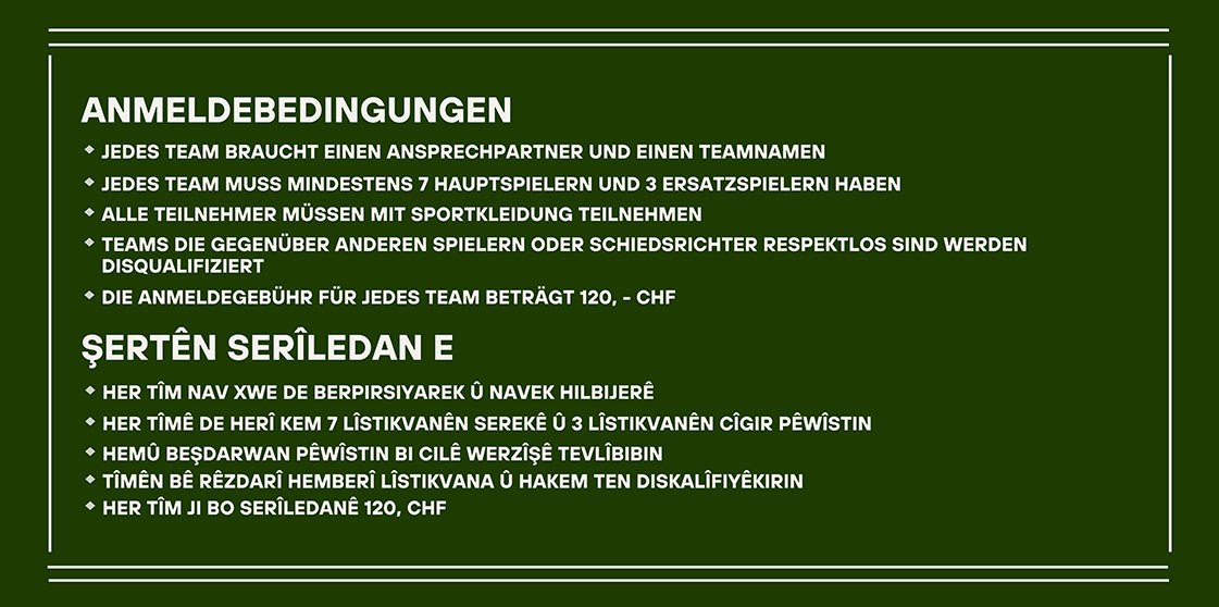 LUZERN – Almanya’nın Freiburg kentinde 25 Mayıs’ta gerçekleşecek olan Kurdistan Gençlik Kültür ve Spor Festivali kapsamında gençlerin hazırlıkları başladı. Her yıl geleneksel olarak Kurdistan Gençlik Festivali kapsamında yapılan futbol turnuvaları da, gençlerin yüksek katılımı ile devam ediyor.