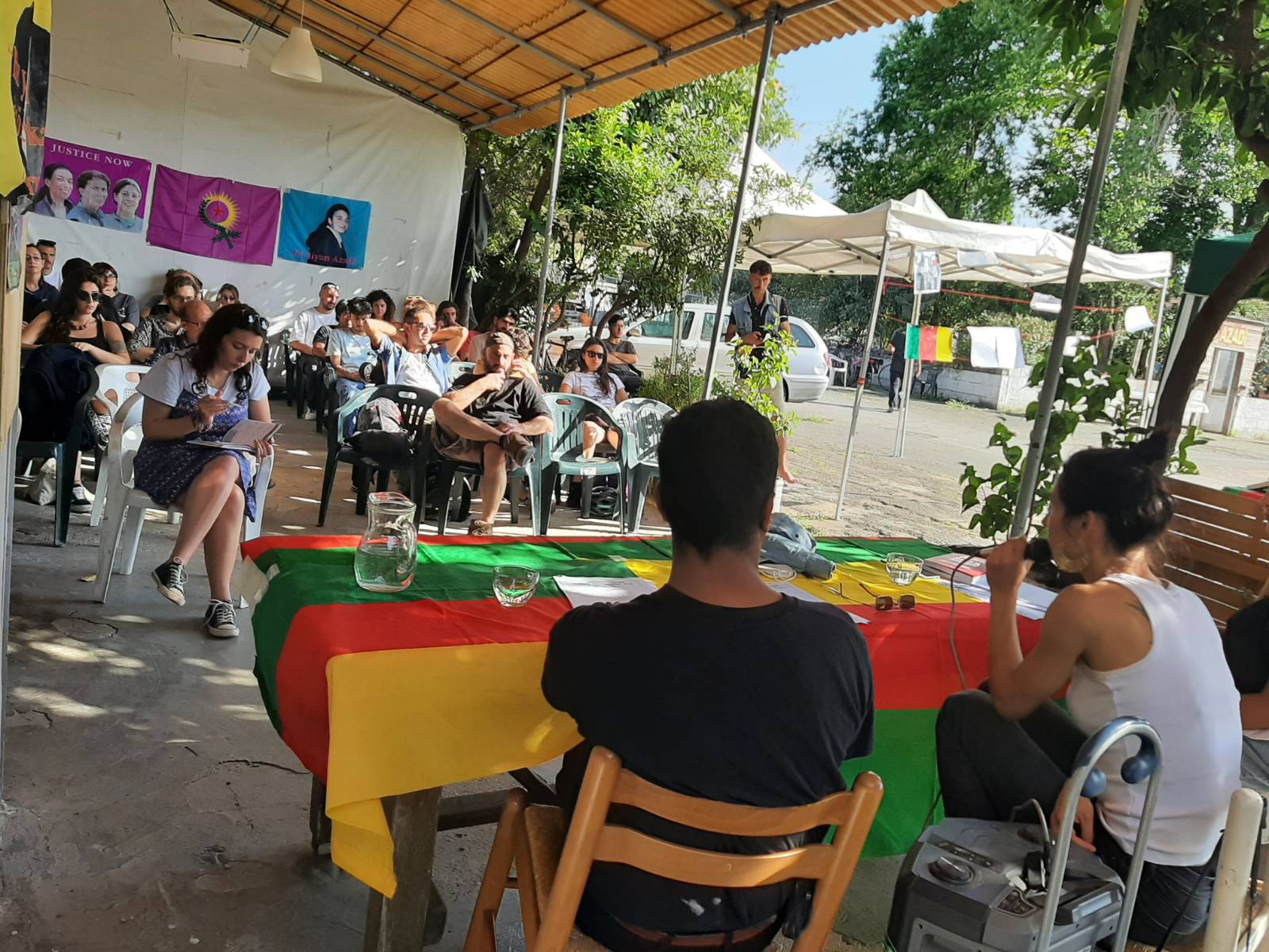 Toplantıdan önce Maria Edgarda Marcucci’nin kitabı “Rabbıa Proteggımı” tanıtıldı. Maria Edgarda Marcucci, Rojava’da Kadın Savunma Güçleri (YPJ) ’ne katıldığı gerekçesiyle 2020 mart ayında İtalyan yargısı tarafından iki yıl “özel ev hapsi” cezasına çarptırılmıştı.