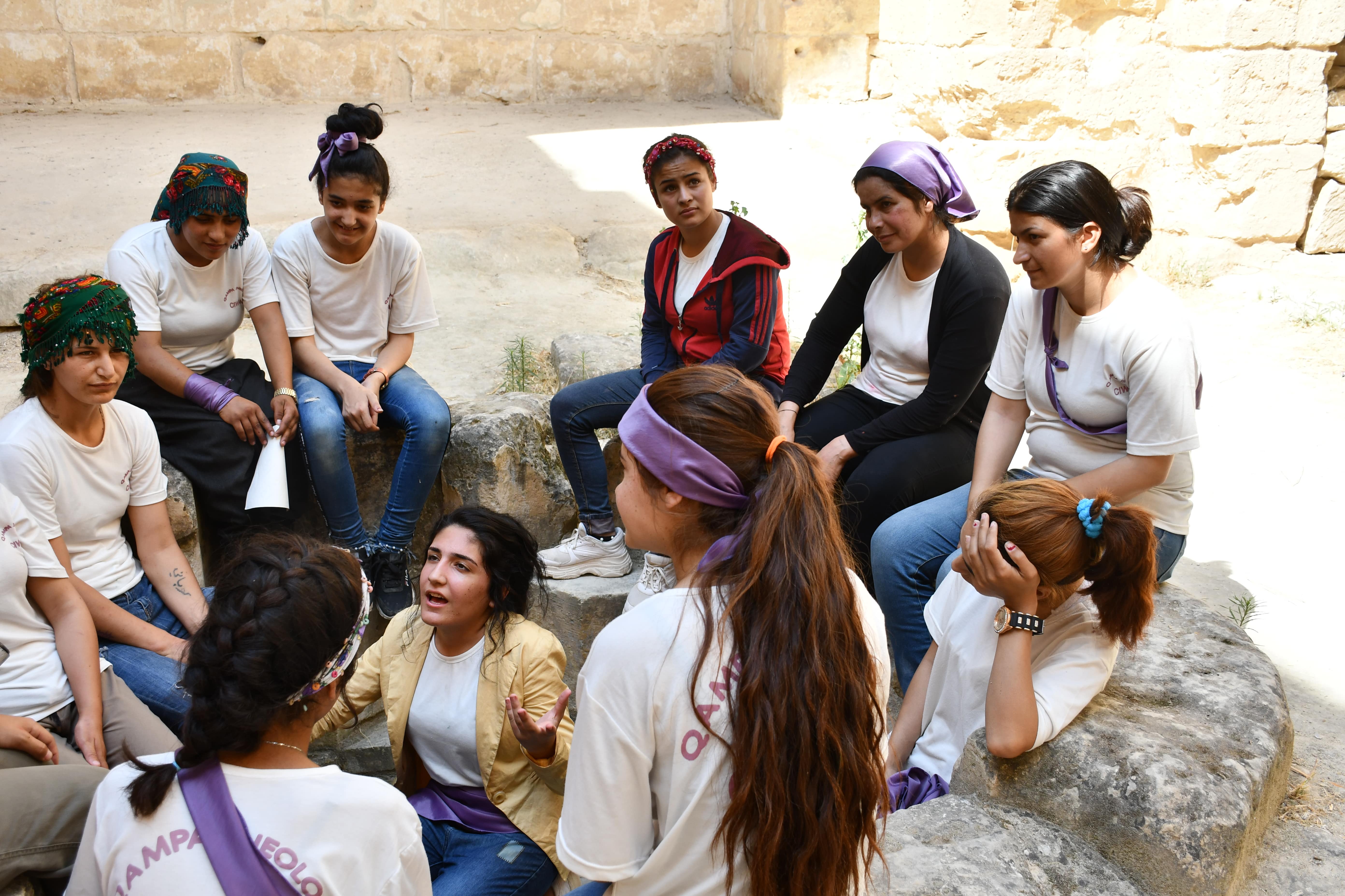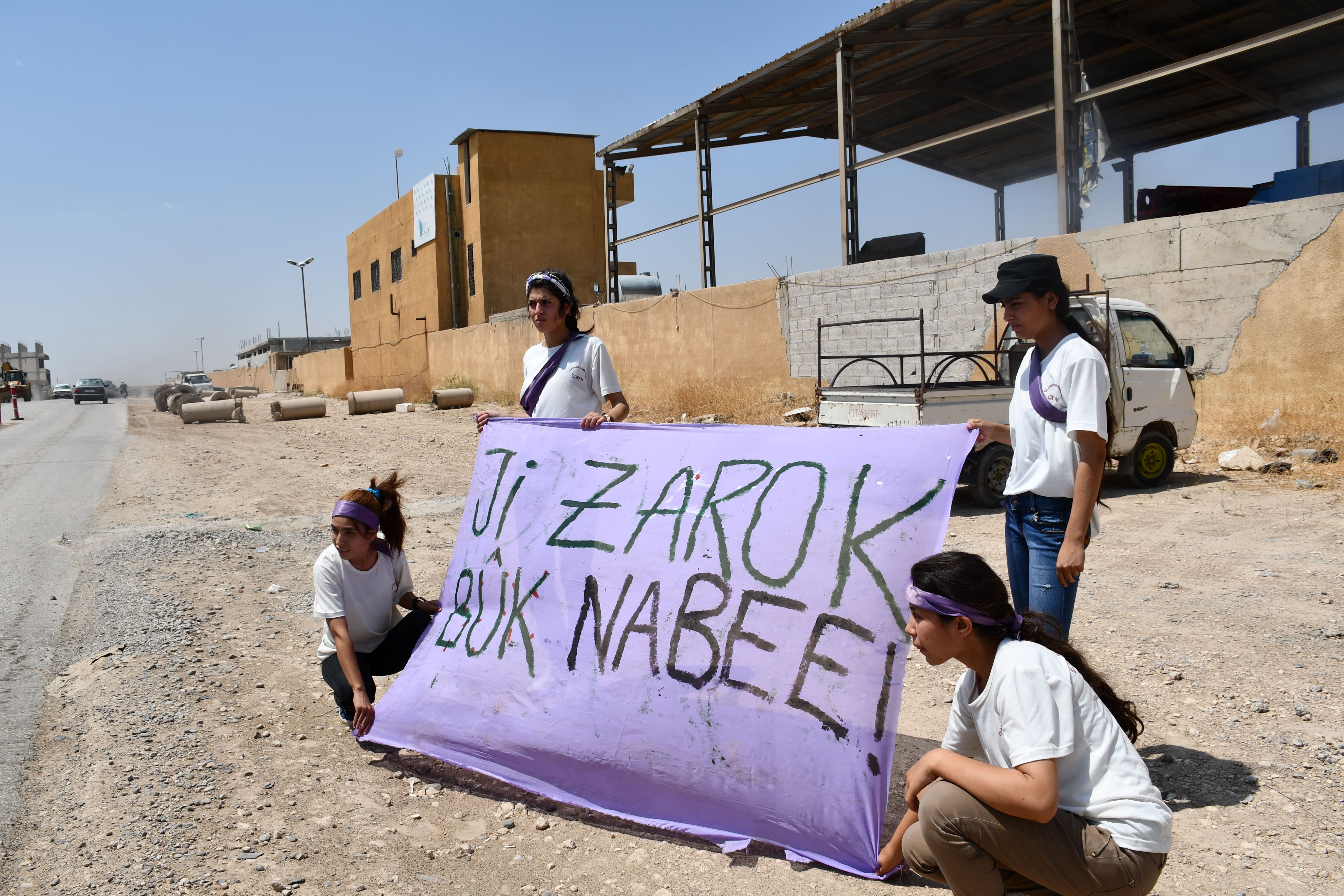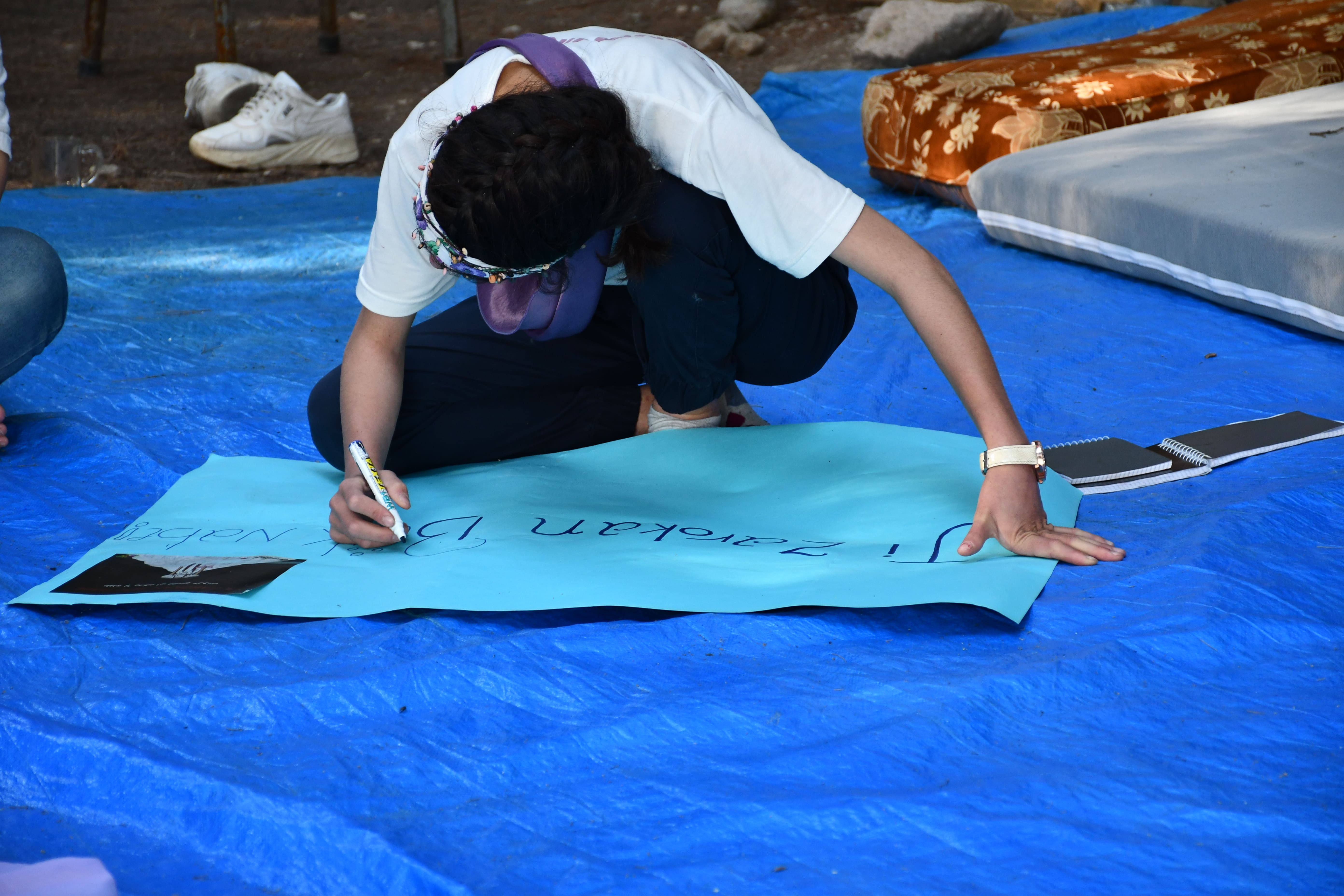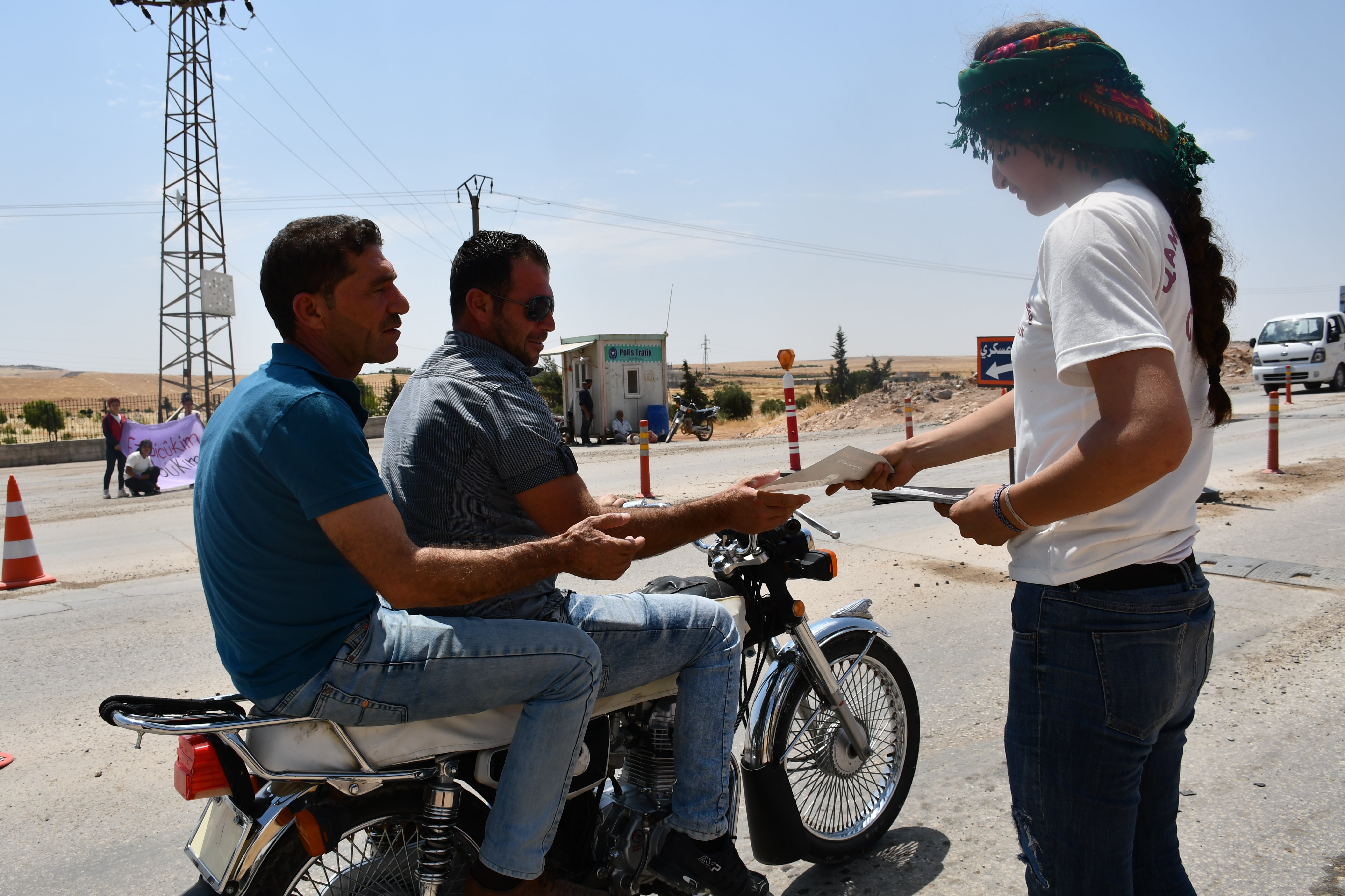 Kale gezisinden sonra, yollara koyuluyoruz trafiğin olduğu her yerde durup farkındalık uyandırmak adına sticker dağıtılıyor. Dün kampta elleriyle hazırladıkları pankartları açmış ‘çocuk gelinleri’ kabul etmediklerini tepkileriyle bir kez daha gösteriyorlar. Genç kadınlar her şeye rağmen toplumu değiştirmek adına Arapça ve Kürtçe yazlan bu stickerları her yere dağıtıyor ve asıyor.