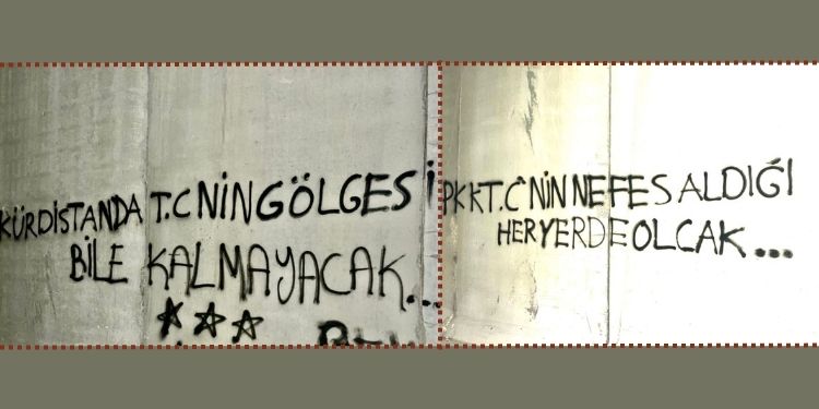 Duvarlara, “Kürdistan’da TC’nin gölgesi bile kalmayacak” ve “PKK, TC’nin nefes aldığı her yerde olacak” ve “Bijî Berxwedana Gerîla” yazıldı.