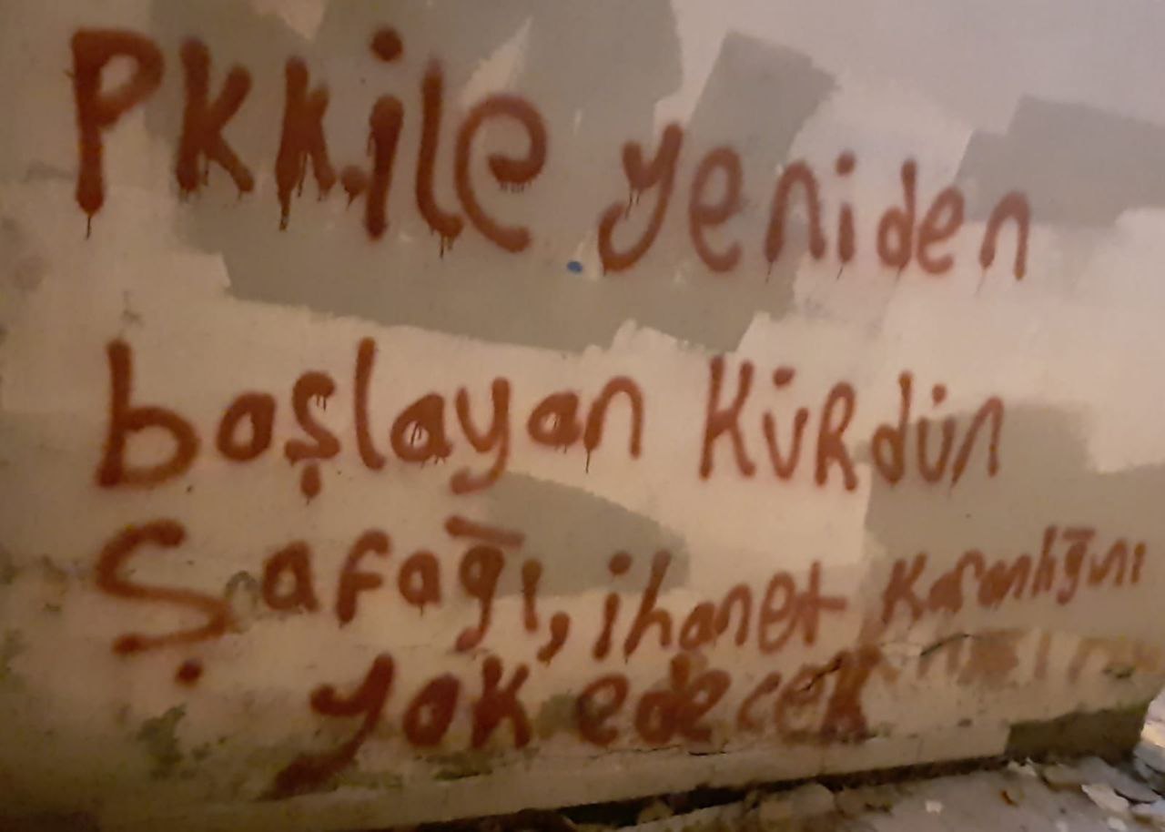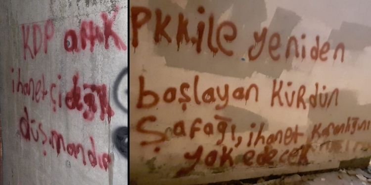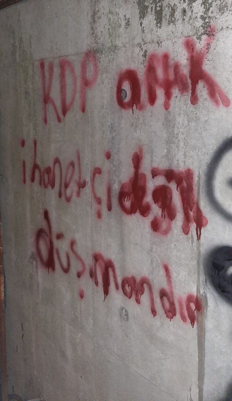 Duvarlara “KDP İhanetçi Değil Düşmandır” ve “PKK ile Yeniden Başlayan Kürdün Şafağı İhanet Karanlığı Yıkılacak” yazıldı.