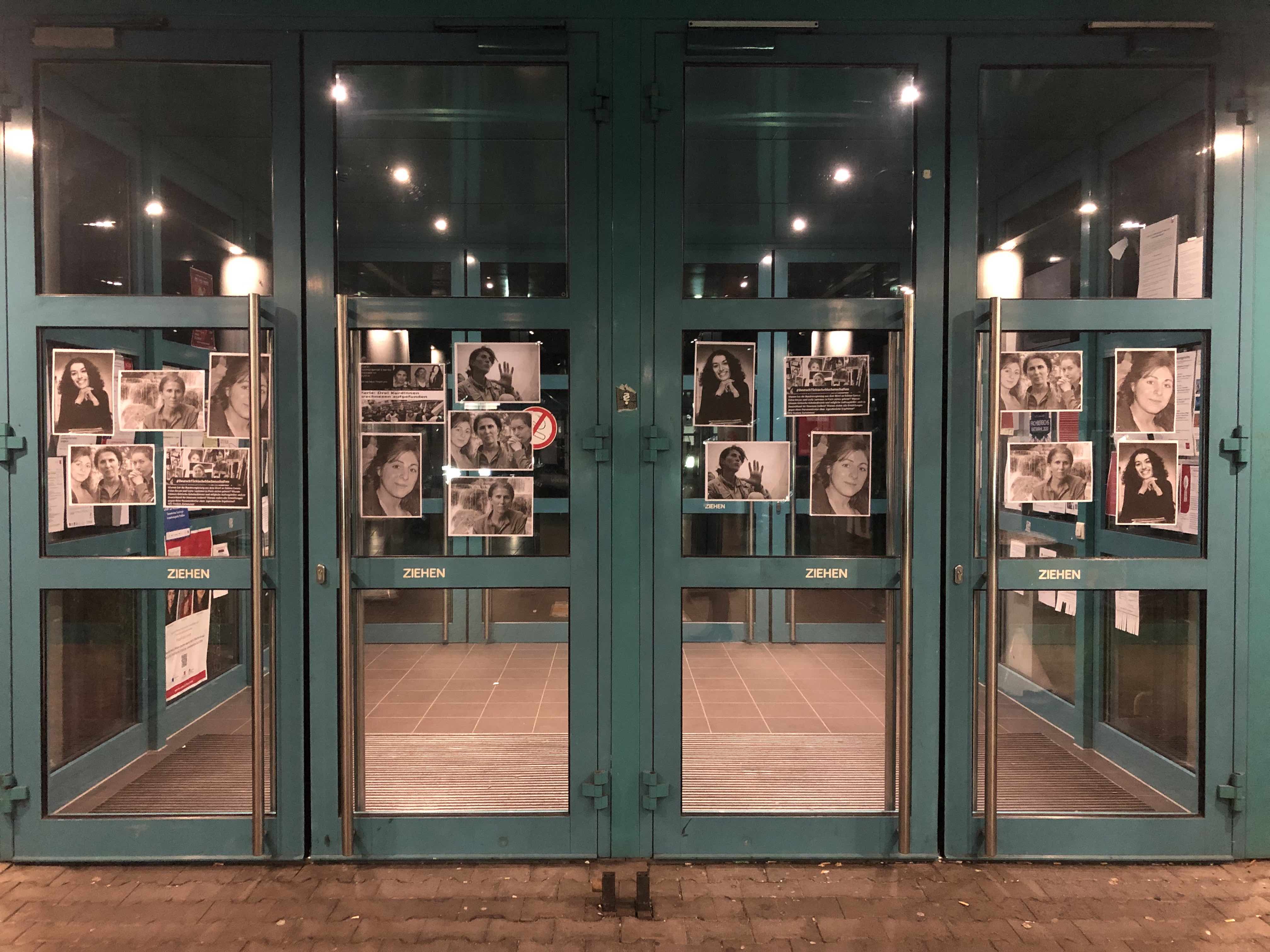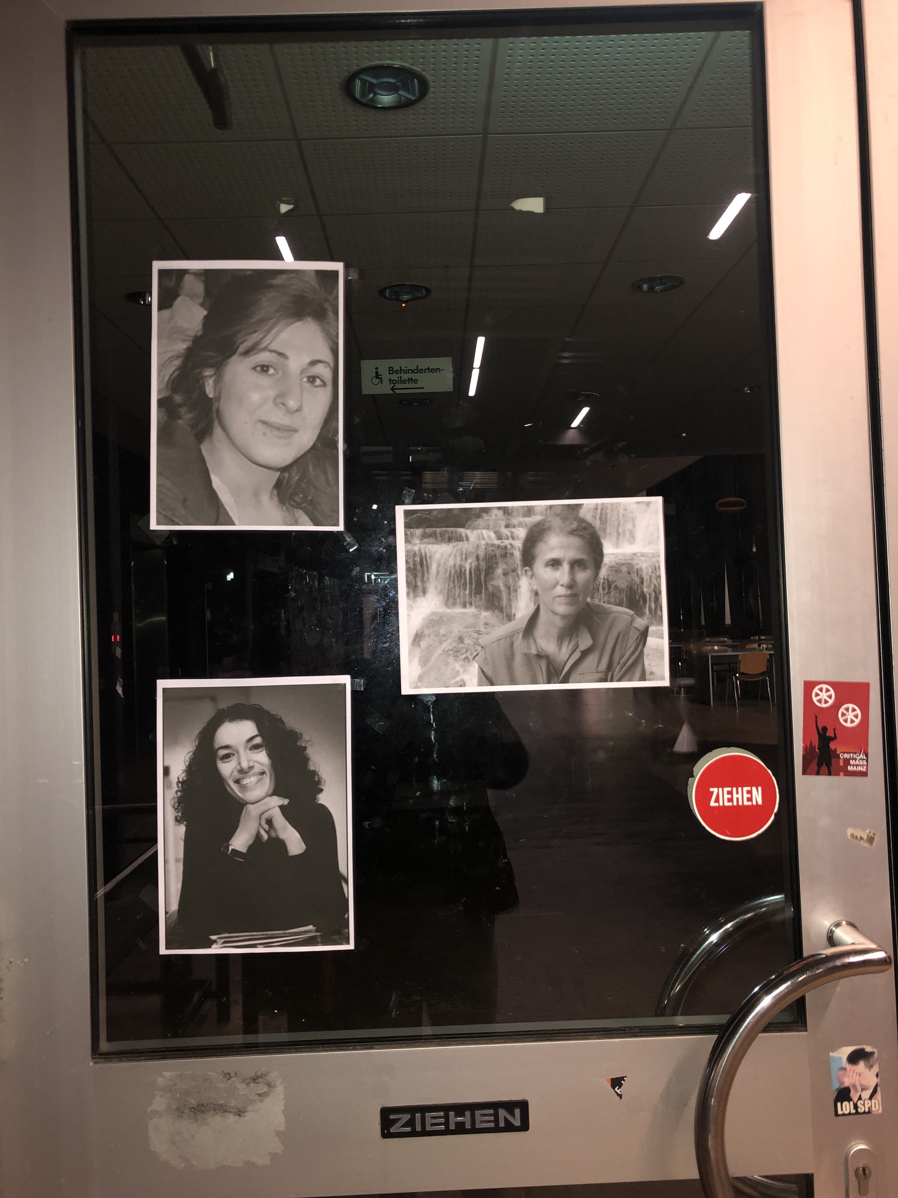 Katliama dikkat çekmek için 3 kadının fotoğrafları Johannes Gutenberg üniversitesinin girişlerine yapıştırıldı.