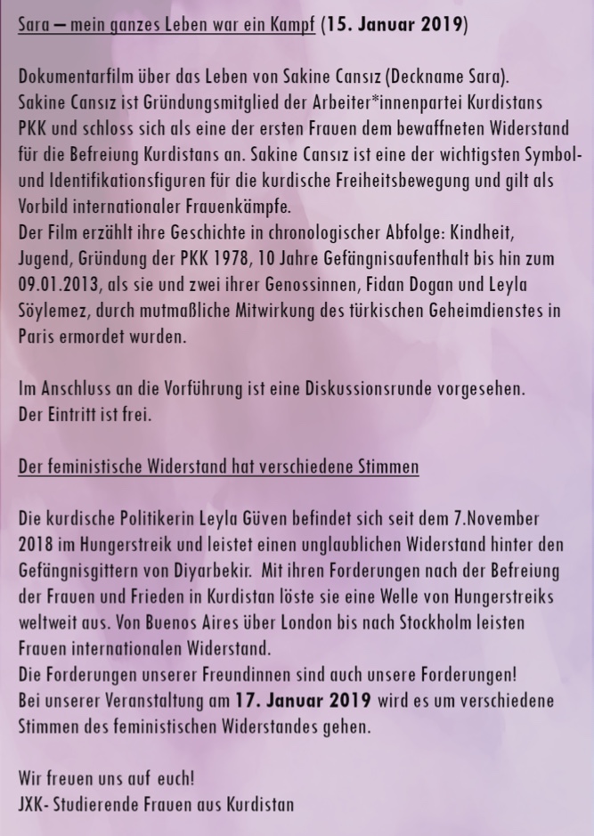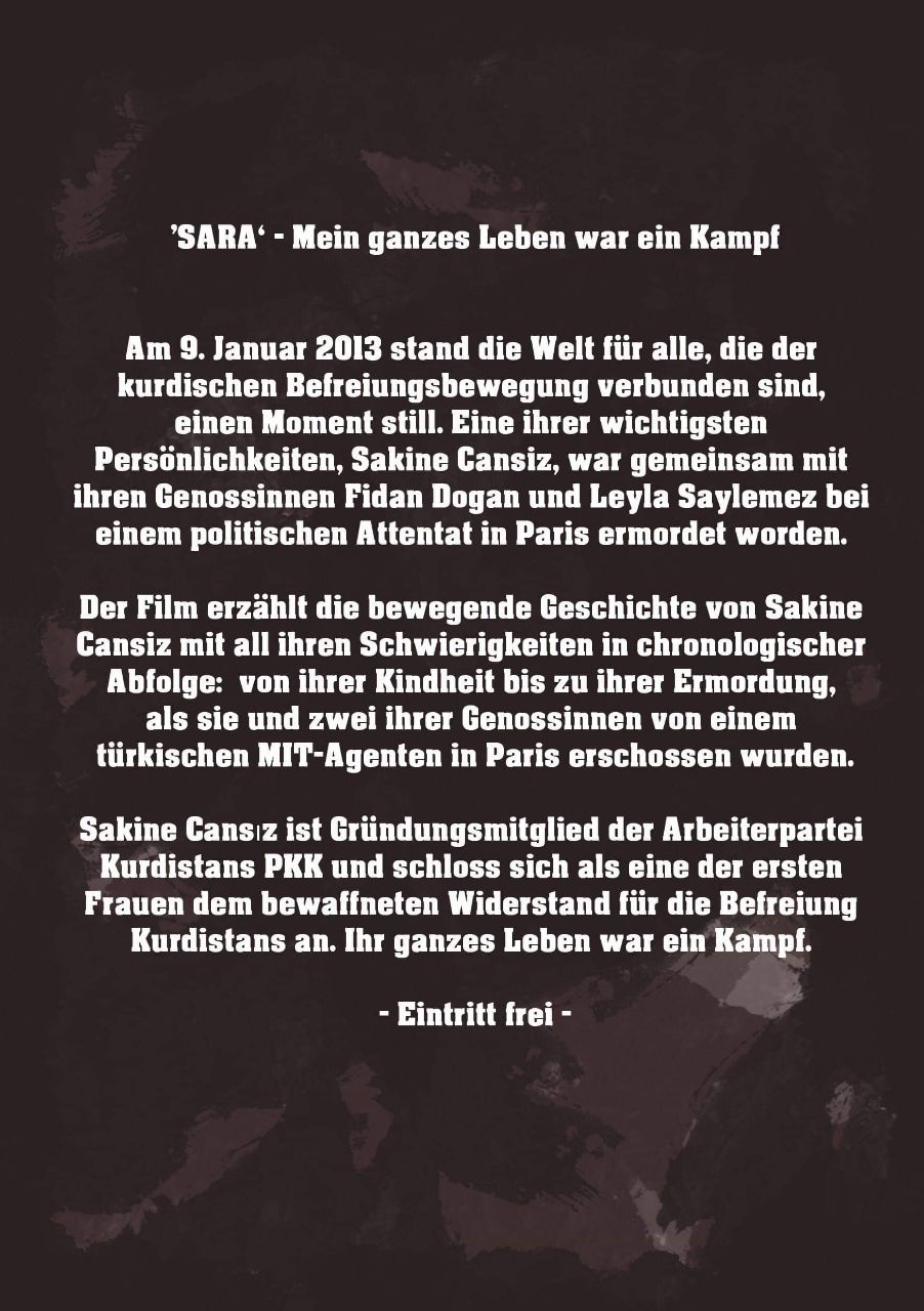 Kürdistanlı Kadın Öğrenciler birliği JXK, 2013’te Paris’te katledilen Sakine Cansız’ın hayatını ve mücadelesini anlatan belgesel filmin gösterimini Almanya’nın 4 şehrinde gerçekleştirecek. Şehit Sara’nın “Hep Kavgaydı Yaşamım” isimli kitaplarından esinlenerek çekilen film Köln, Bielefeld, Berlin ve Bochum’da ücretsiz olarak gösterilecek.