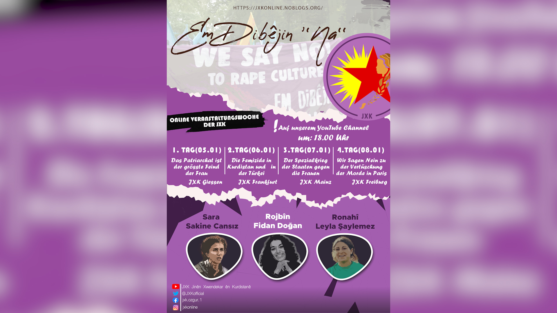 “Em dibejin NA” kampanyası çerçevesinde Almanya’nın güneyinde yaşayan Kürdistanlı Kadın Öğrenciler (JXK) olarak, 9 Ocak’ta Paris’ta katledilen siyasetçi, akademisyen ve kadın özgürlük savunucuları Sakine Cansız, Fidan Doğan ve Leyla Şaylemez’i anmak ve özellikle son dönemlerde gelişen kadın kırımına, şiddete, katliama karşı tepkimizi dile getirme amacıyla Online seminer haftası düzenleyeceğiz.