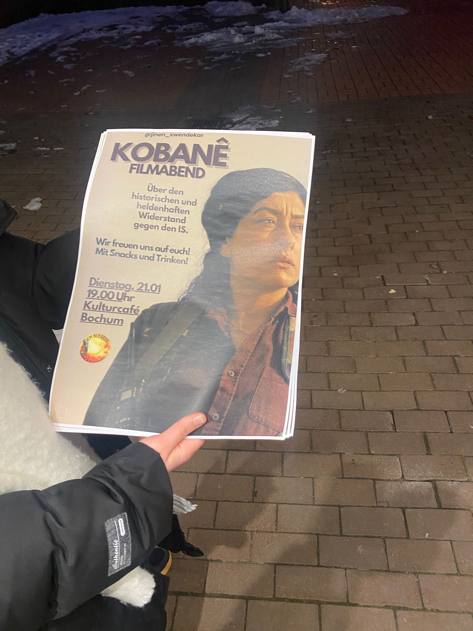 BOCHUM – Jinên Xwendekarên Kurdistan (JXK) üyesi genç kadınlar öncülüğünde “EM BERNADIN-Köklere Dönüş” kampanyası çerçevesinde, Bochum Üniversitesi’nde Kobanê’nin kurtuluşunun 10. yıldönümü vesilesiyle Kobanê filminin gösterimi gerçekleştirildi.