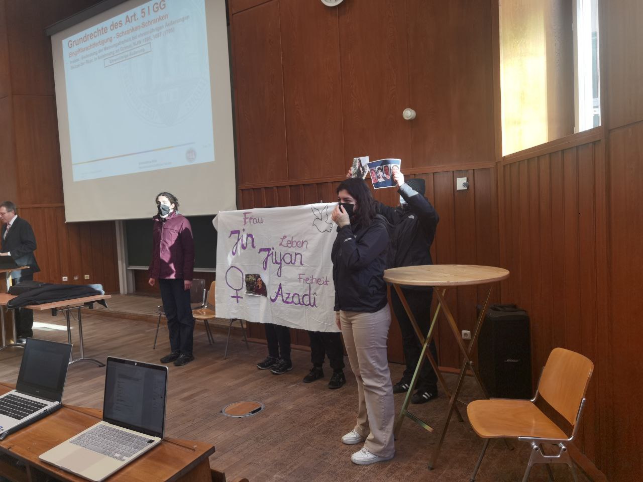 Genç kadınlar Biyokimya ve Hukuk fakültelerinde ki dersliklerde Kurdistan ve İran’daki mevcut duruma ilişkin bir konuşmalar yaptı.