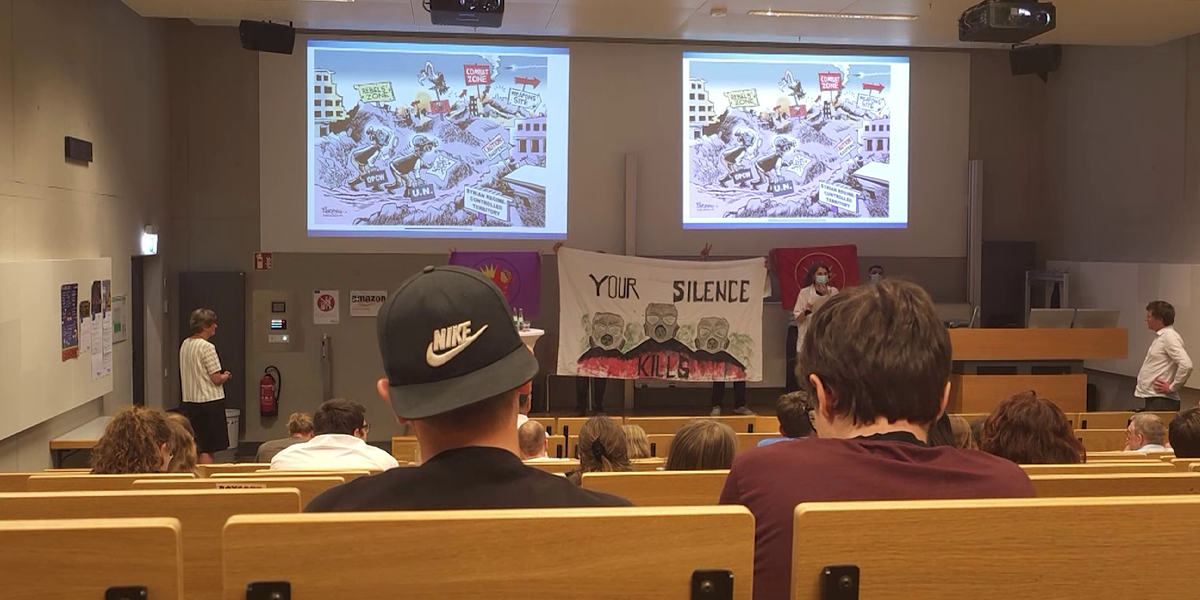 JXK ve TCŞ üyeleri 21 Haziran 2023’te Aachen Üniversitesi’nde kimyasal silahlarla ilgili bir sunum gerçekleştirdi. Konuşmacı Eski Birleşmiş Milletler Silahsızlanma Sorunları Yüksek Temsilcisi Dr. Angela Kane’di. JXK ve TCŞ Aachen, Kürdistan’da Kurdistan Özgürlük Gerillasına karşı kimyasal silah kullanımına dikkat çekmek için sunum esnasında bildiriler dağıttı ve bir konuşma gerçekleştirildi. Ardından slogan atan gençler “Sessizliğe son verin,” “Kürdistan’daki katliama son verin” ve “Enternasyonal dayanışmayı artırın” dedi. Gençlerin dağıttığı bildiriler büyük bir ilgiyle okundu. Daha sonra zehirli gazların kullanıldığını bir kez daha göstermek için binanın önünde duman yakıldı.