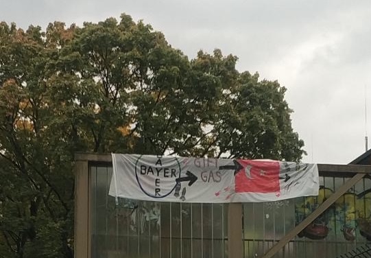 Bir diğer genç kadın grubu ise, binanın kamuhalkına yansıyan dış köprü kısmında bir pankart açtılar. Pankart üzerinde bir görsel çizim ile BAYER’nin kimyasal silah üretimi ve bunun faşist TC devletine olan desteğini yansıtdılar.