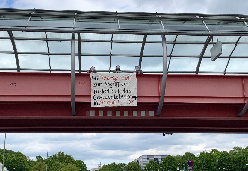 BİELEFELD – Kürdistanlı Genç Kadınlar (JXK) Bielefeld aktivisti genç kadınlar faşist Türk devletinin Mexmûr ve Zînî Wertê alanlarına yönelik saldıralarına ve Qendîl’i işgal planına dikkat çekmek için pankart eylemi yaptı.