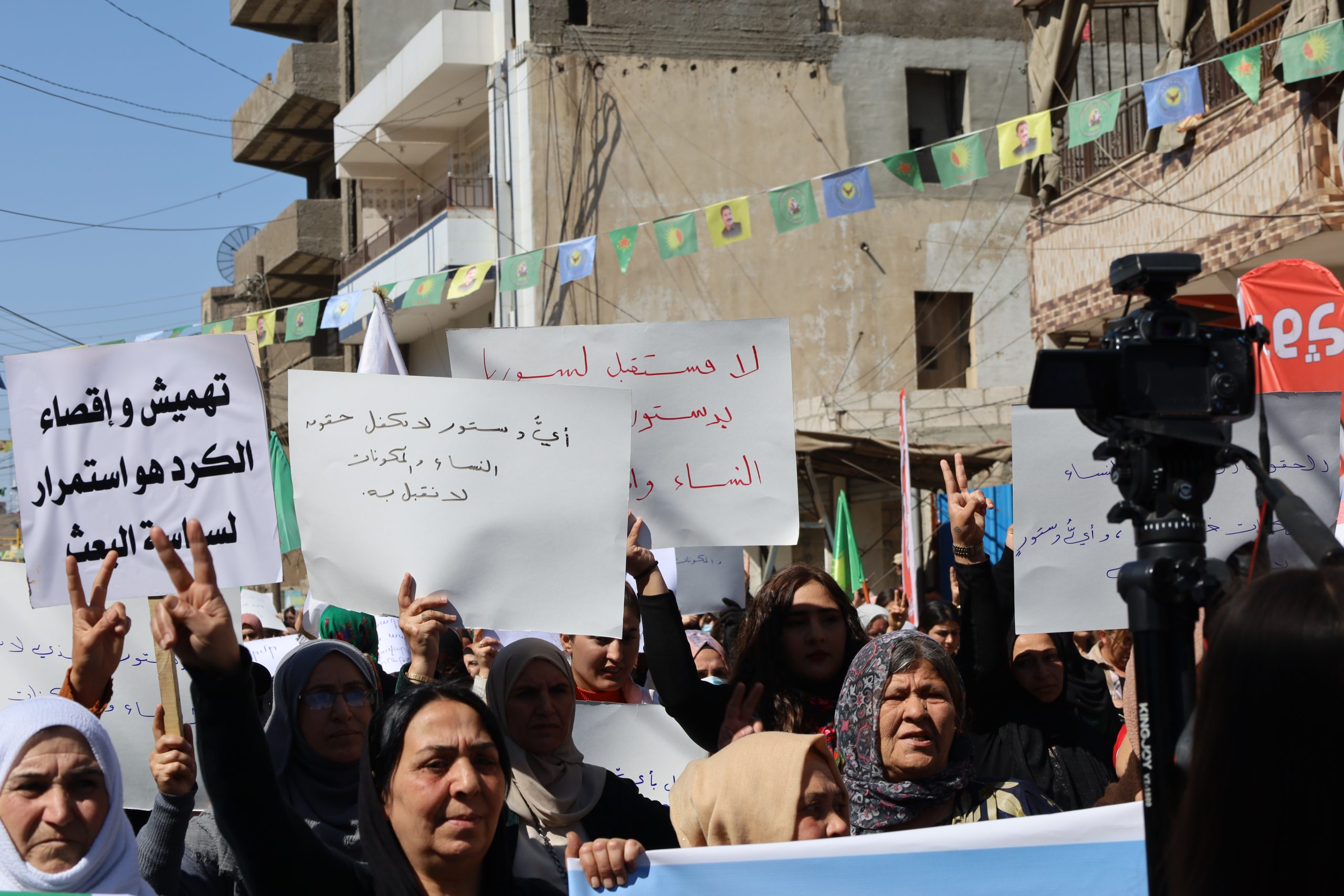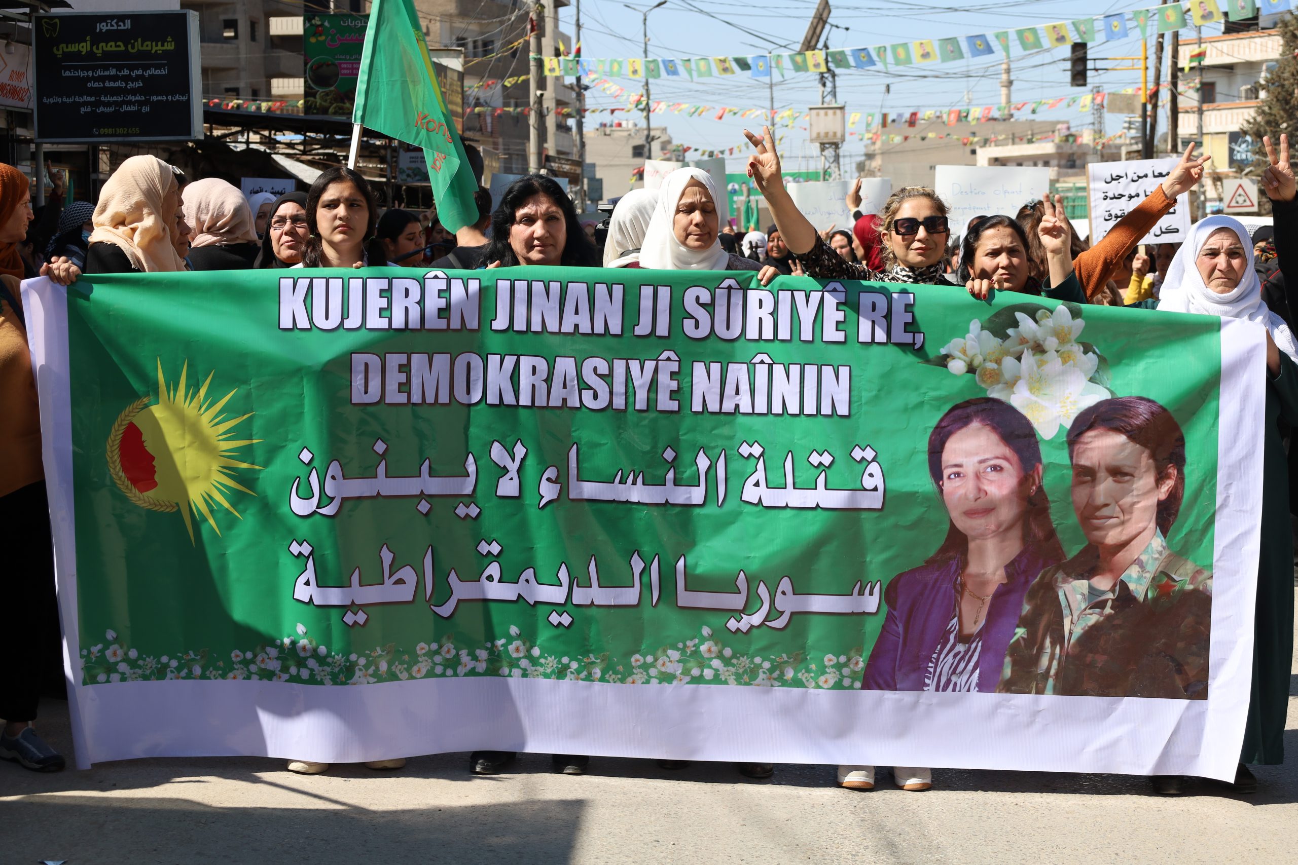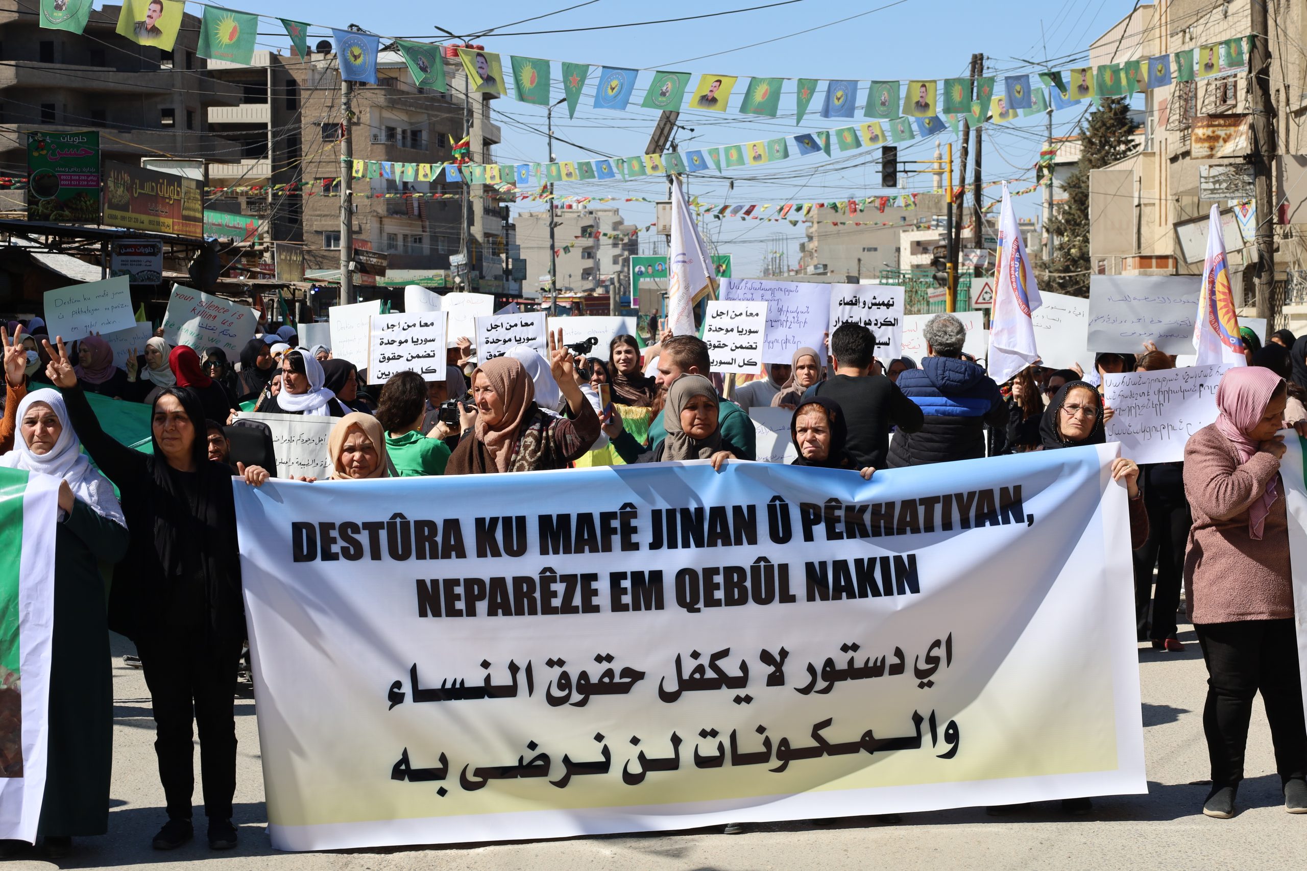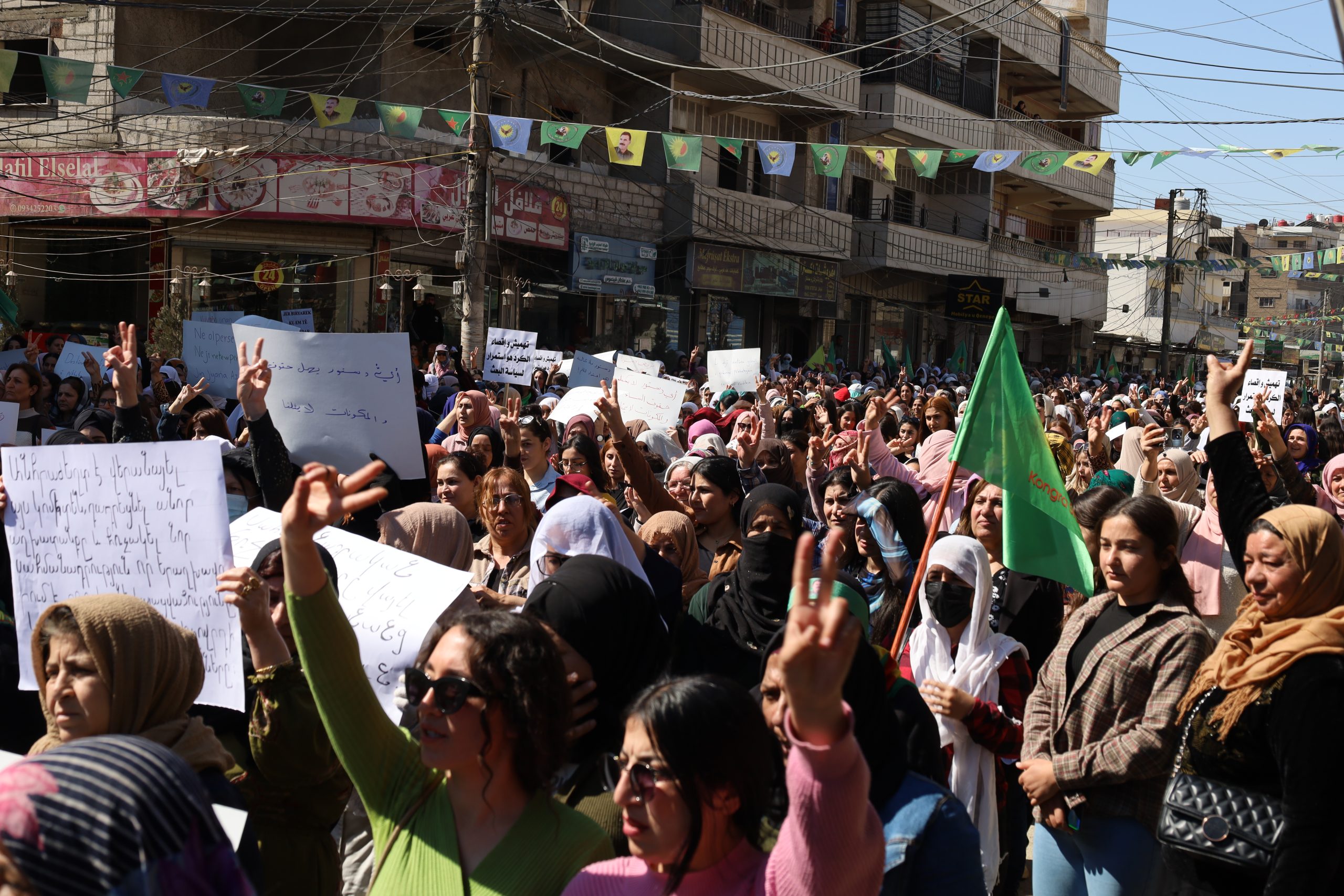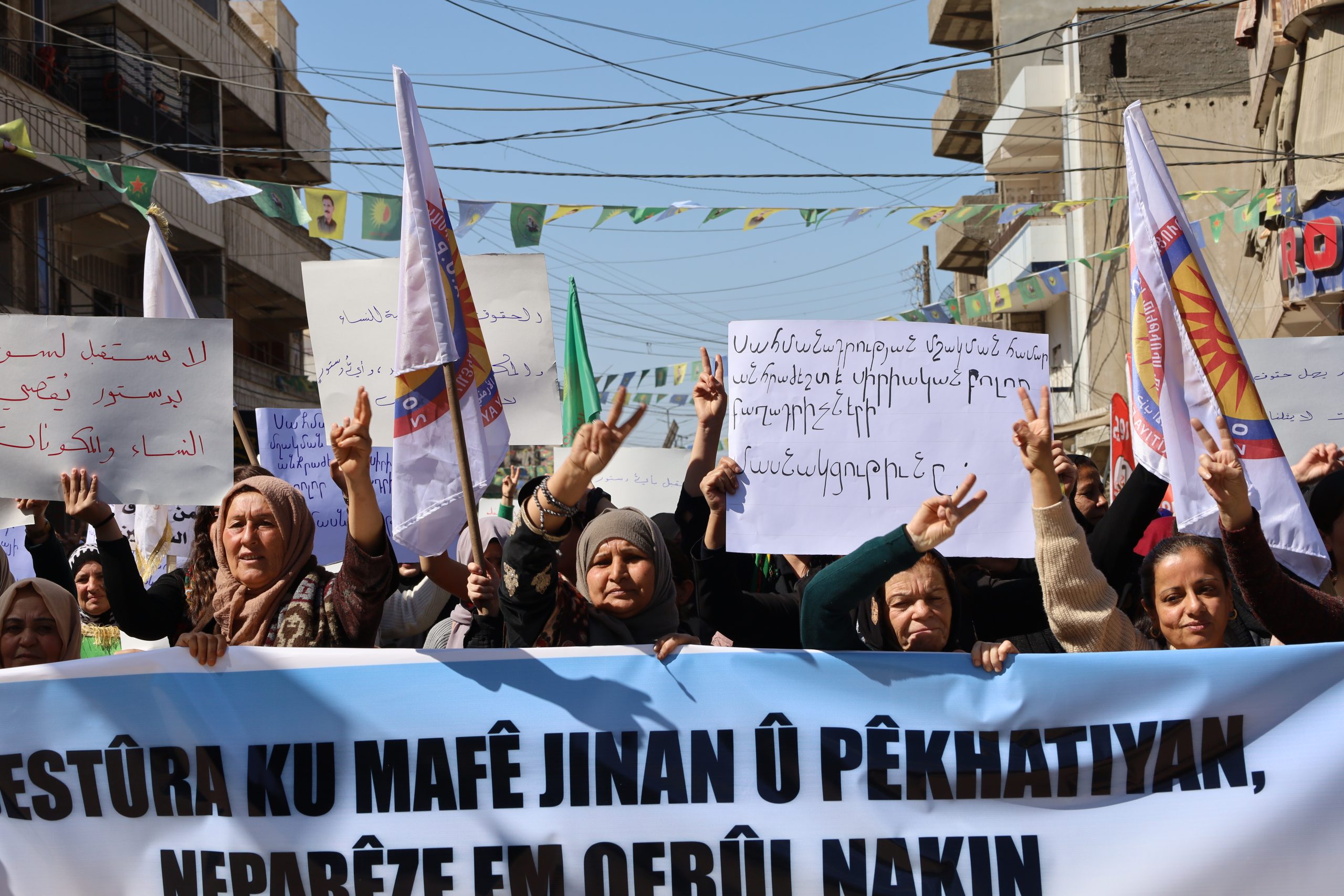 QAMIŞLO- Kongra Star ve Genç Kadınlar Birliği öncülüğünde, halkların ve kadınların haklarını yok sayan Şam iktidarı tarafından çıkarılan geçici anayasa taslağını, Suriye’nin kıyı kentlerindeki Alevi katliamlarını protesto etmek ve Suriyeli kadınların haklarının güvenceye alınması çağrısıyla Qamişlo’da kitlesel yürüyüş organize etti.