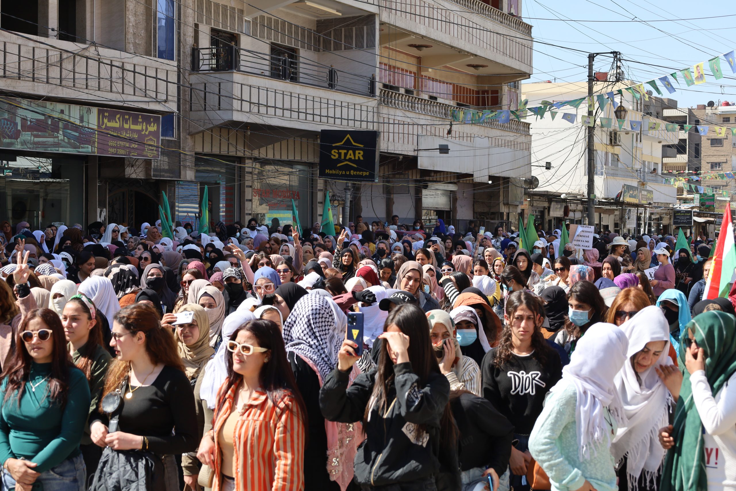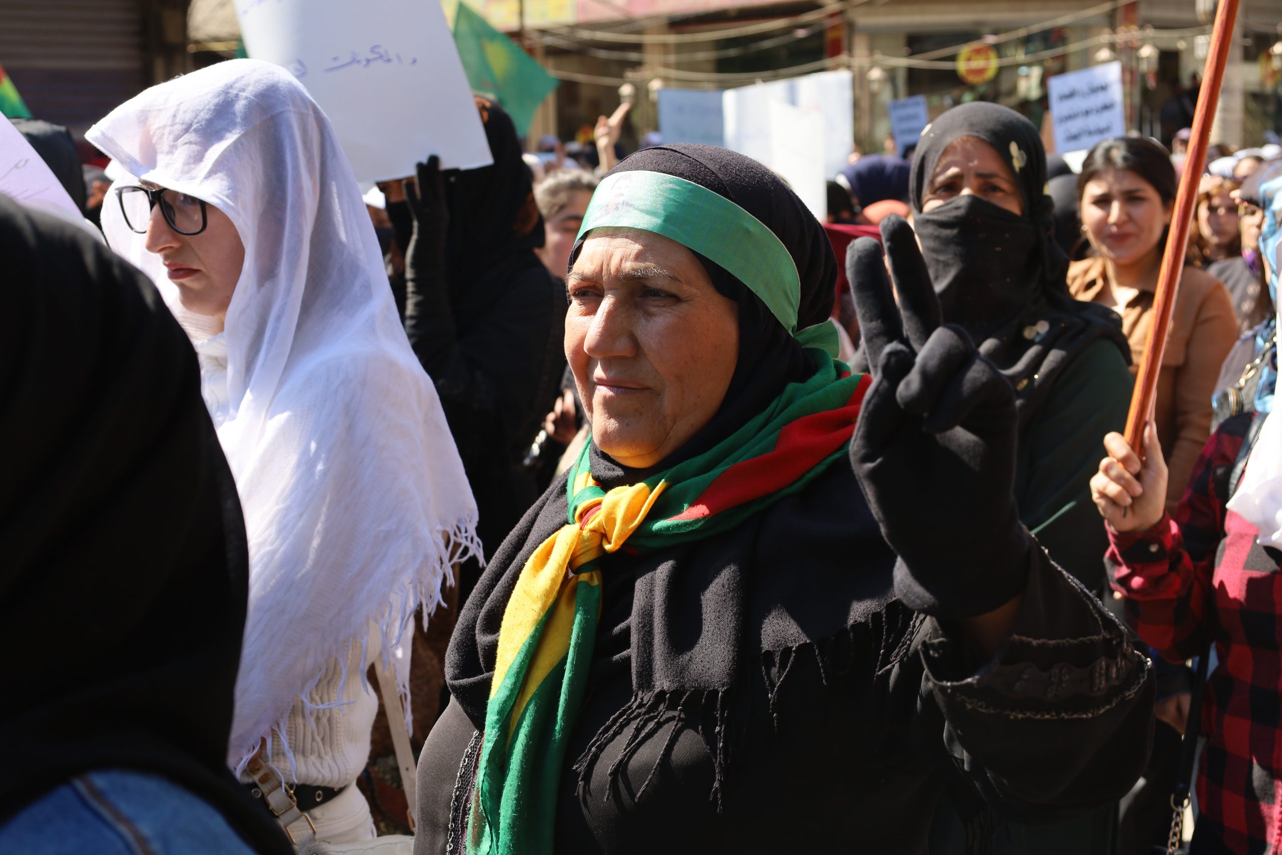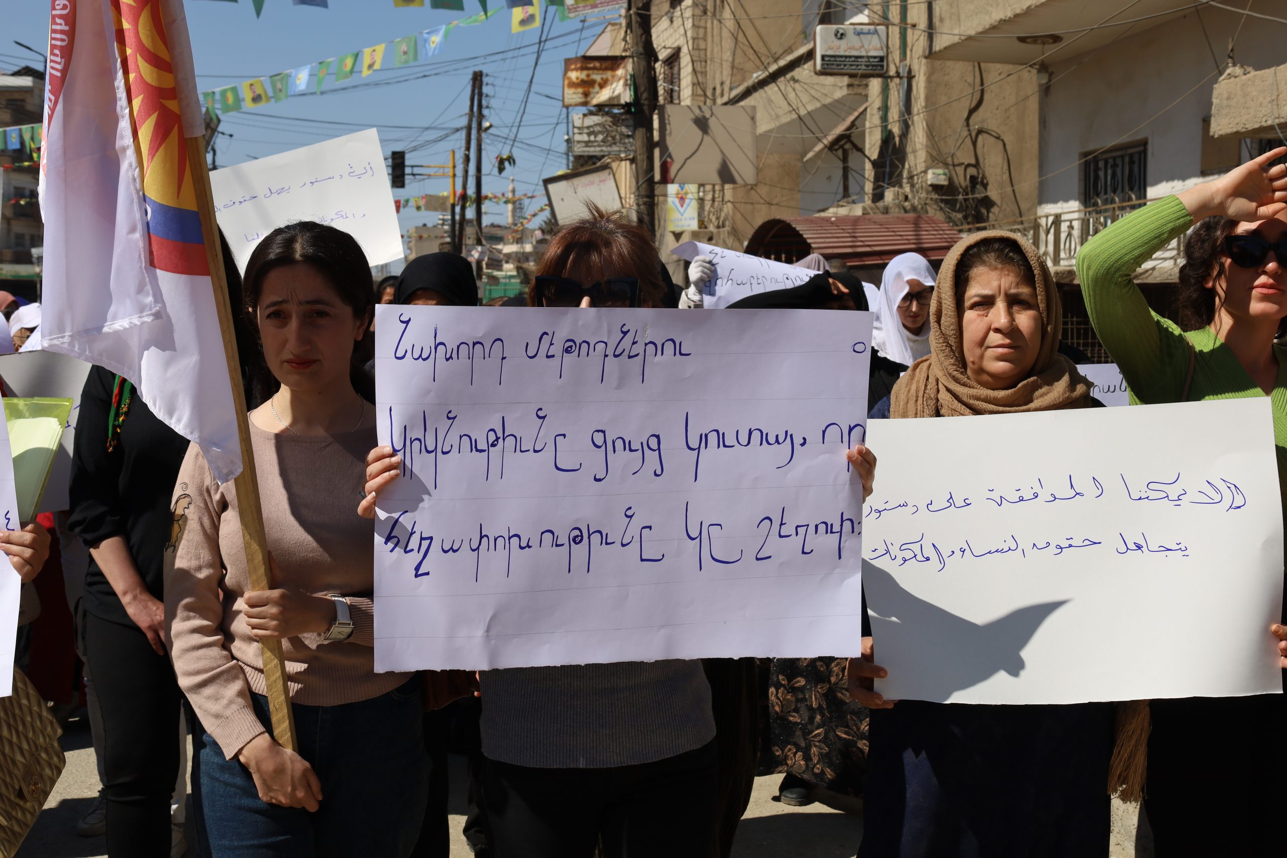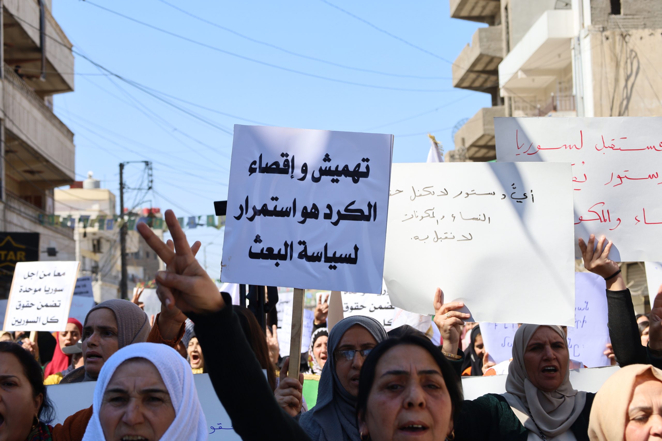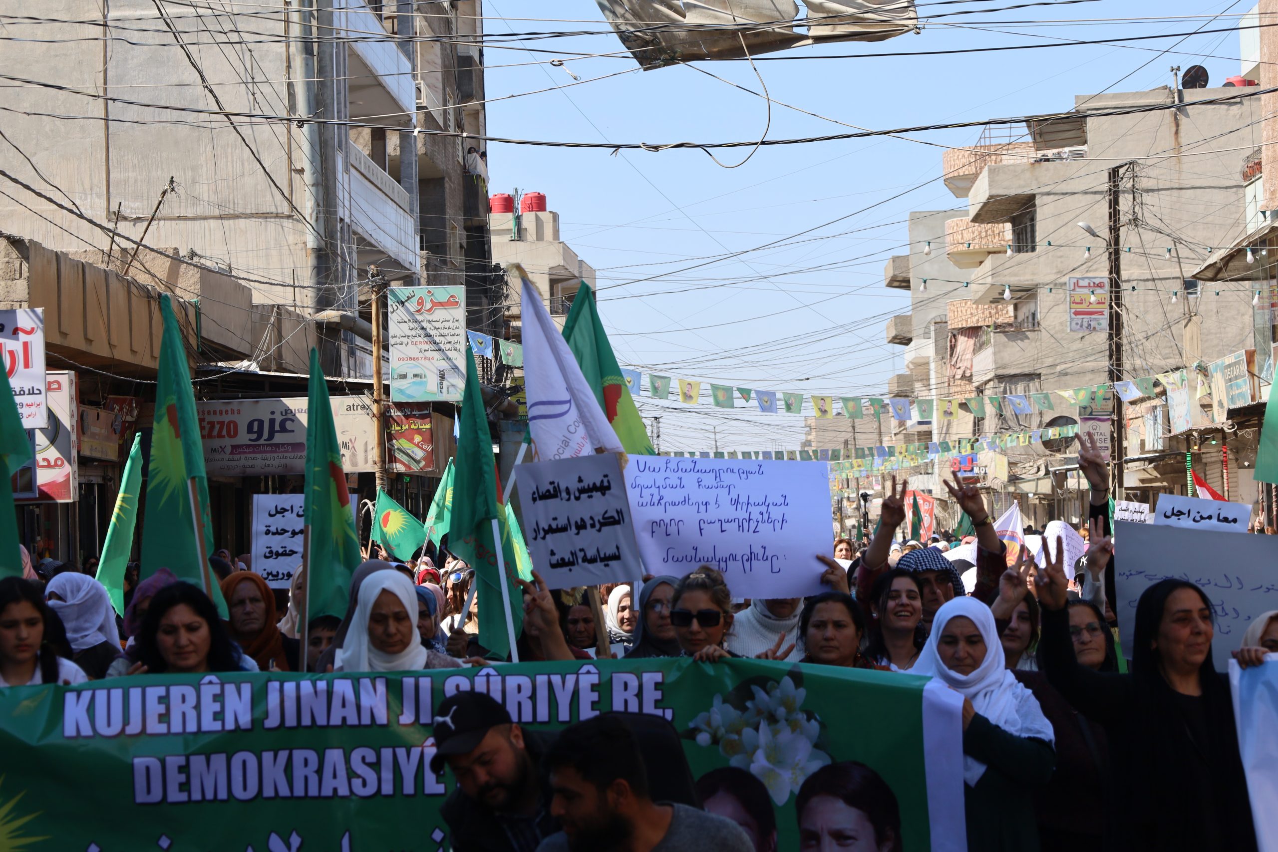 QAMIŞLO- Kongra Star ve Genç Kadınlar Birliği öncülüğünde, halkların ve kadınların haklarını yok sayan Şam iktidarı tarafından çıkarılan geçici anayasa taslağını, Suriye’nin kıyı kentlerindeki Alevi katliamlarını protesto etmek ve Suriyeli kadınların haklarının güvenceye alınması çağrısıyla Qamişlo’da kitlesel yürüyüş organize etti.