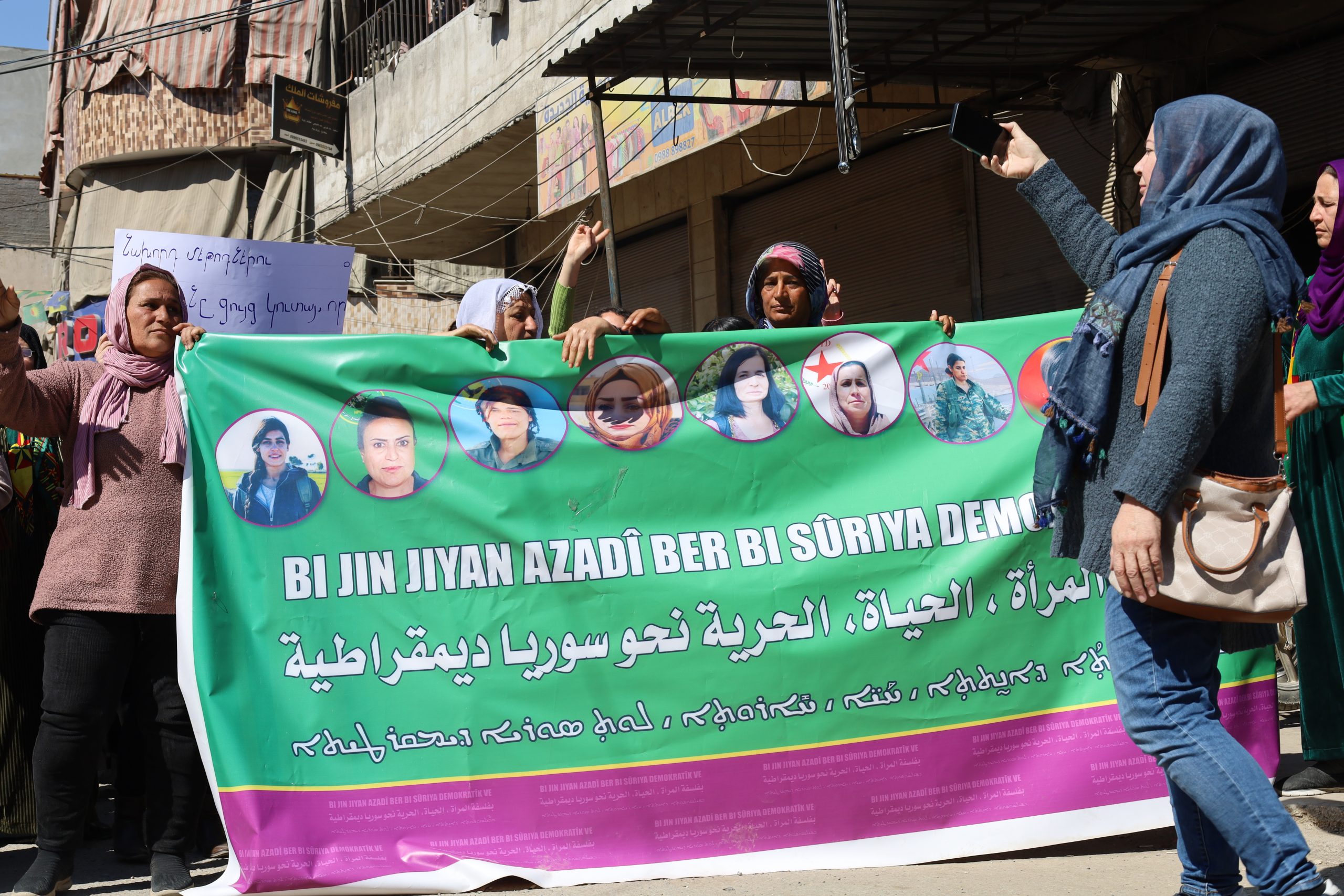 Mitingde konuşma yapan Kongra Star Sözcüsü Rîhan Loqo, Alevilere yönelik katliamları kınadı. Uluslararası toplumun kadınlara yönelik şiddet, tecavüz ve katliamlara karşı sessiz kaldığına dikkat çeken Rîhan Loqo, “Kuzey ve Doğu Suriyeli kadınlar olarak cesaretimizle oradaki kadınlara desteğimizi sunuyoruz. Onlara, yalnız olmadıklarını, yanlarında olduğumuzu söylüyoruz” dedi.