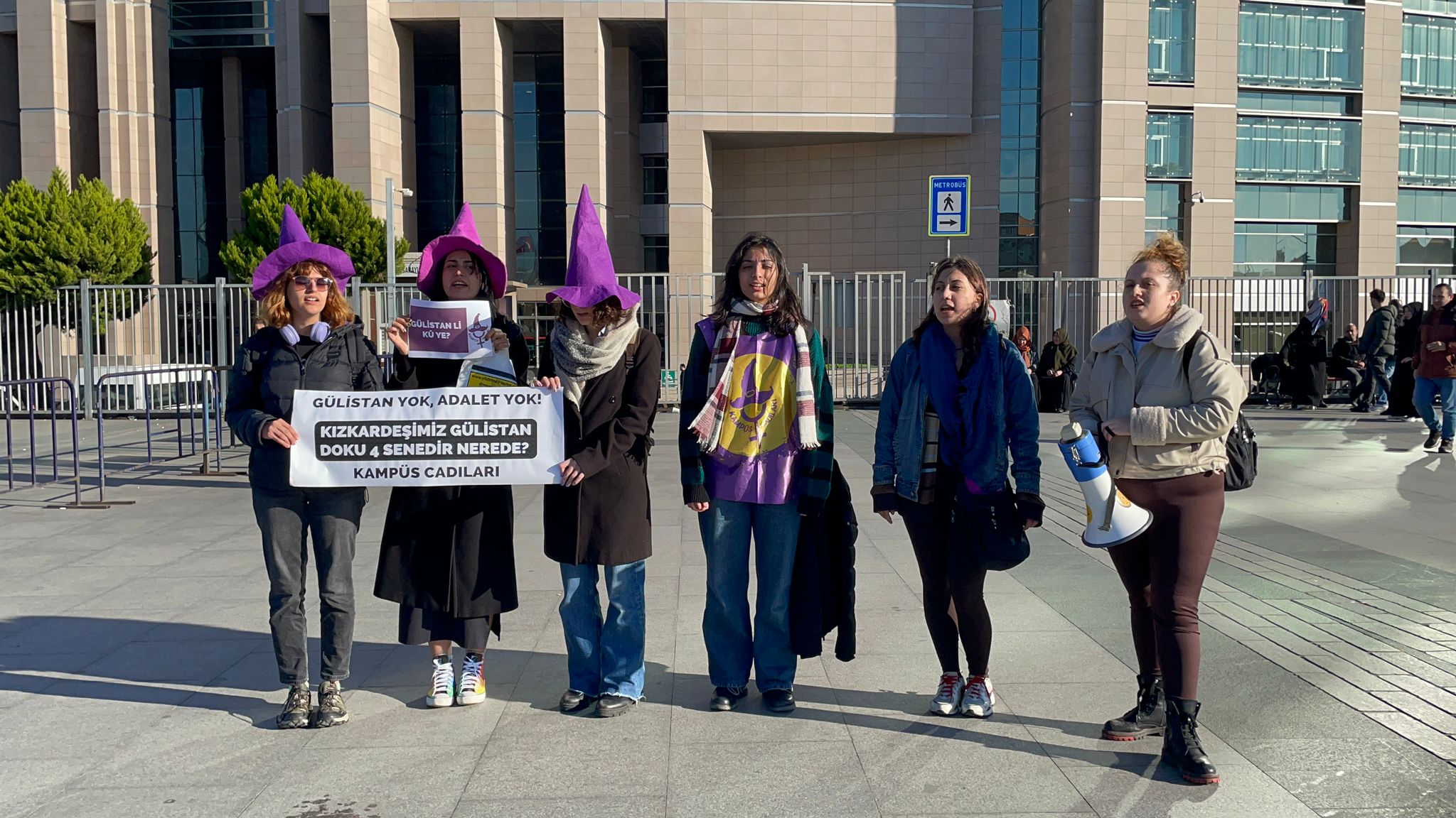 Gülistan kaybolduğundan beri her yıl olduğu gibi ülkenin farklı yerlerinde Gülistan için sokaklardayız. Kampüs Cadıları olarak bugün Çağlayan adliyesi önünde olmamızın bir sebebi de yıllardır Zaynal Abarakov’a ve Engin Yücer’e ceza vermekten imtina eden erkek adaletin karşısında olduğumuzu bir kez daha hatırlatmak içindir. Gülistan için adalet yerini bulana kadar kampüsleri, sokakları, meydanları öfkemizle, erkek adaleti yerle bir edecek gücü toplayarak donatacağız!