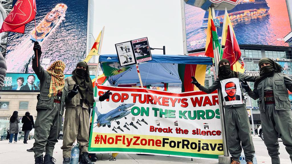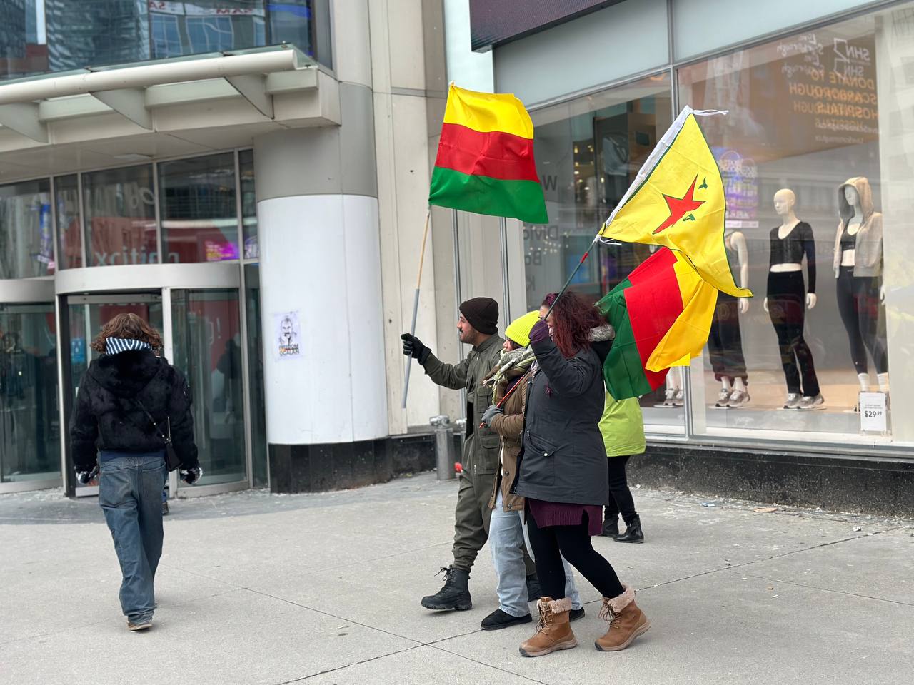 TORONTO – Kanada’nın Toronto şehrinde yaşayan TCŞ üyesi gençler, faşist TC devletinin Rojava’ya yönelik saldırısını protesto etmek amacıyla şehrin önemli noktalarında bir araya gelerek bilgilendirme standı kurdu. Sabah saatlerinde başlayan eylem, şehrin önemli yerlerine dağılarak devam etti ve akşam saatlerine kadar sürdü.