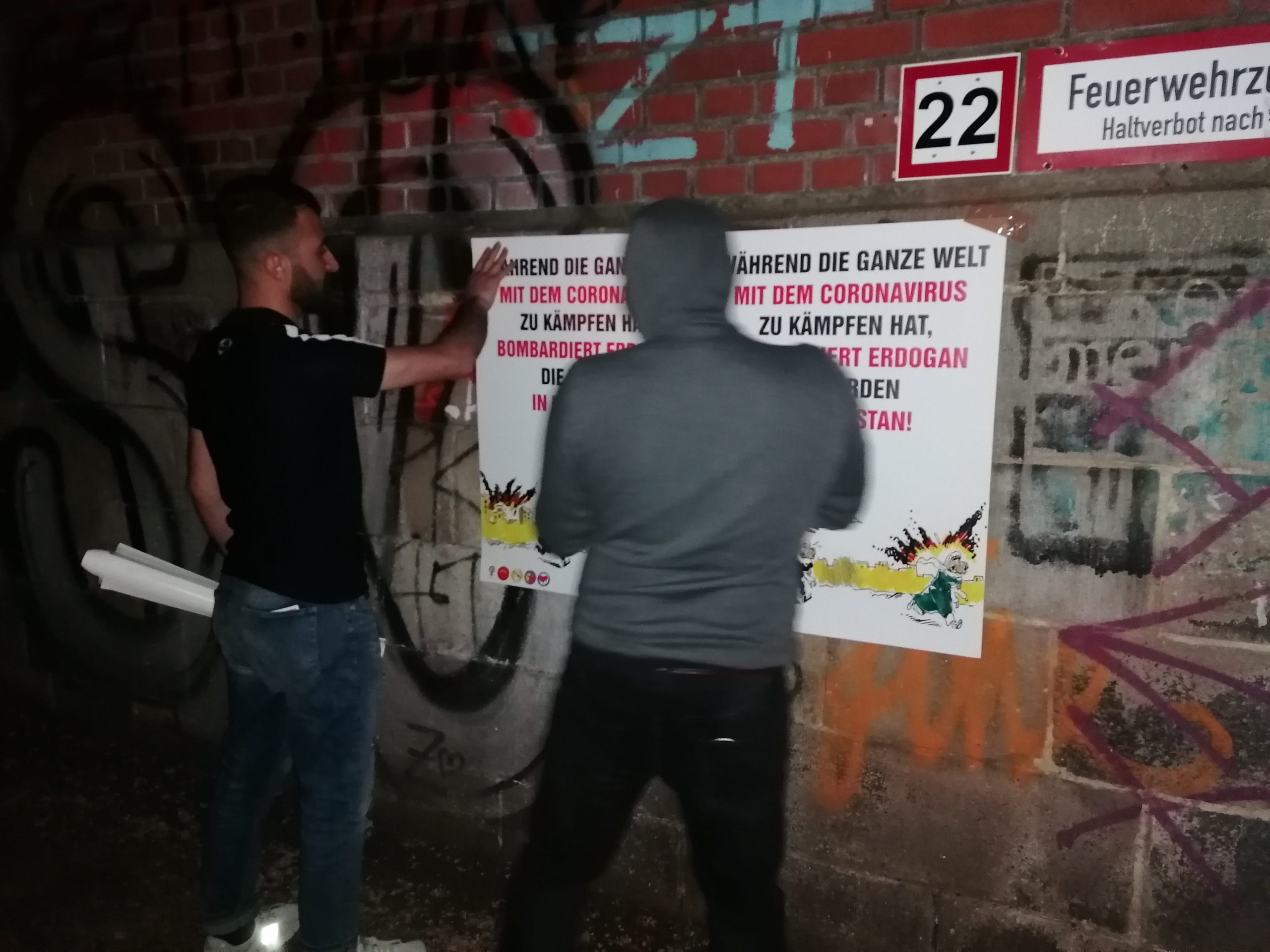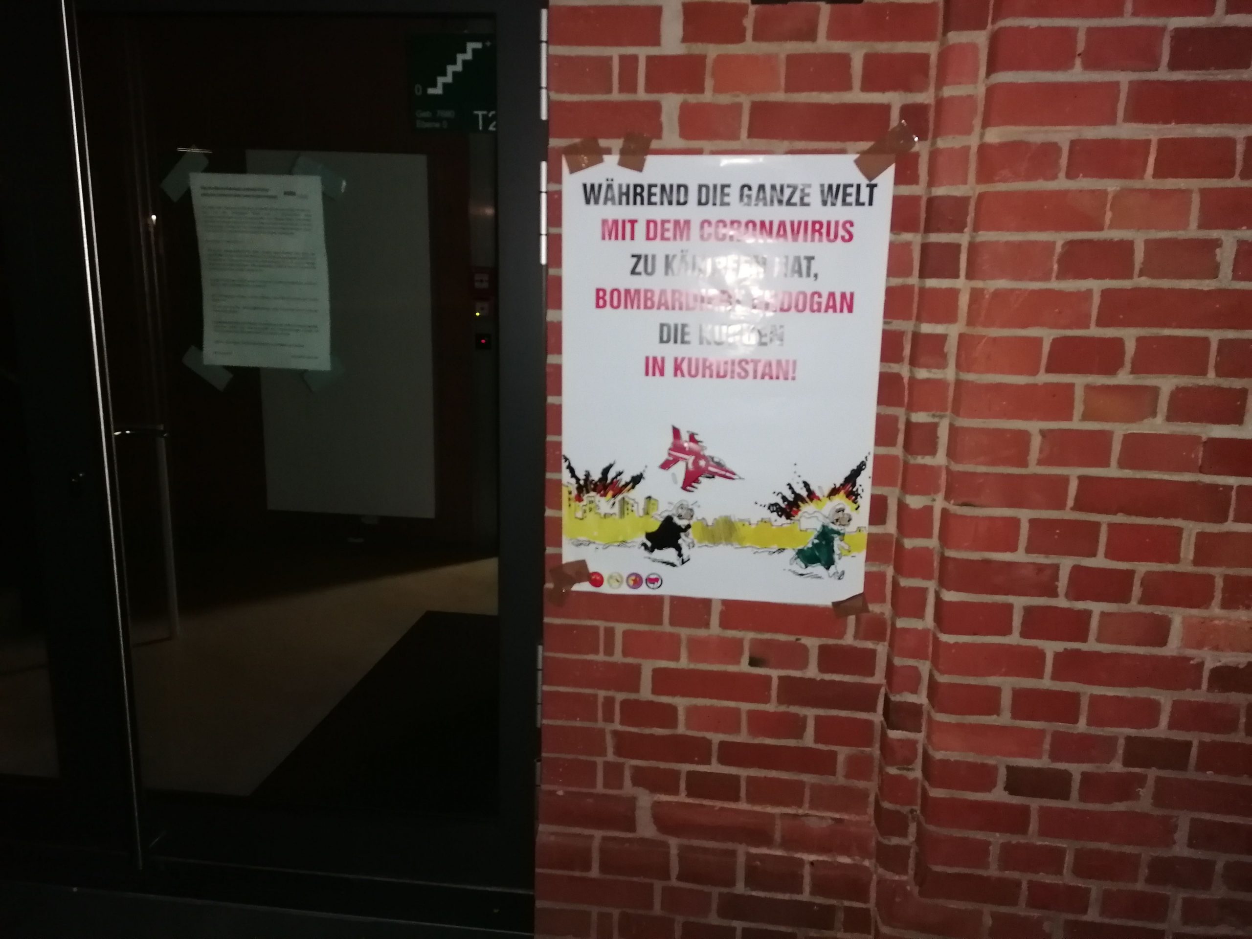 Gençler tarafından şehir merkezinde ve üniversite içerisinde birçok yere üzerinde Almanca, “Tüm dünya Koronavirüsü ile mücadele ederken, Erdoğan Kürdistan’da Kürtleri bombalıyor” yazan afişleri astı.