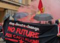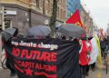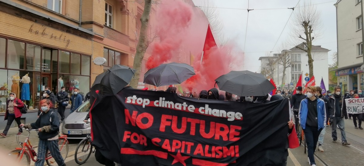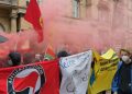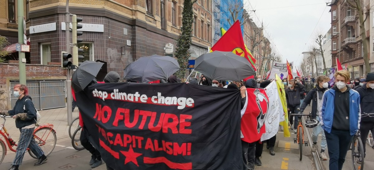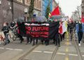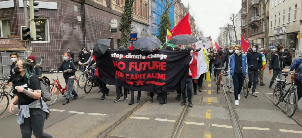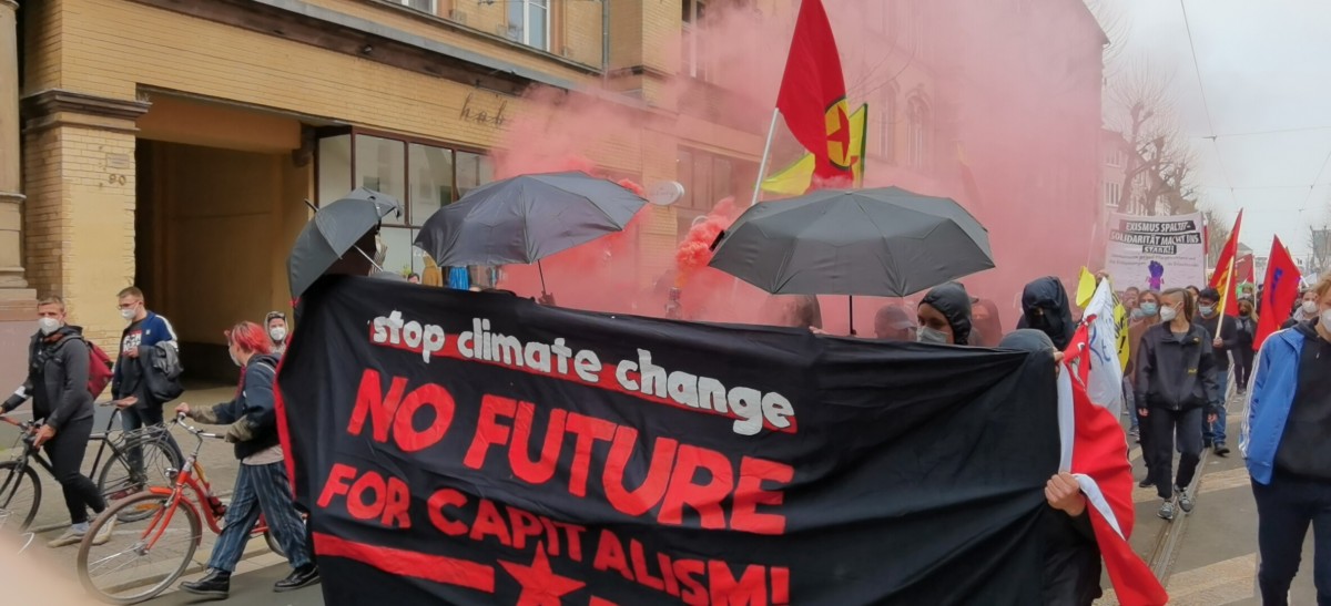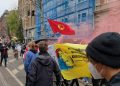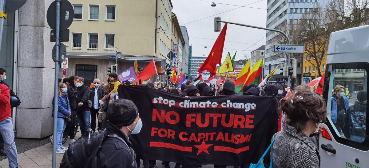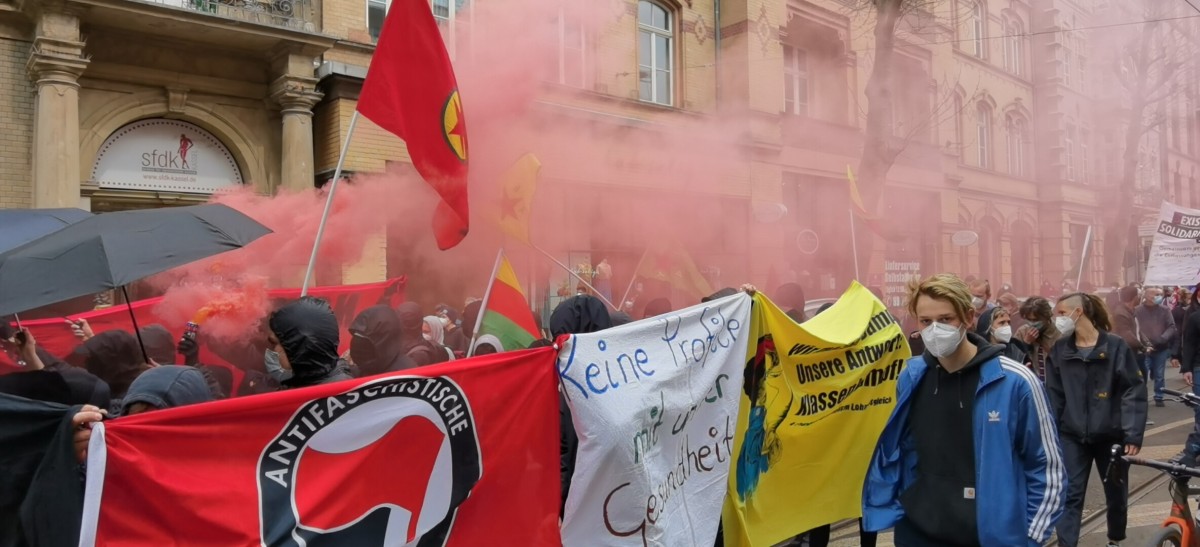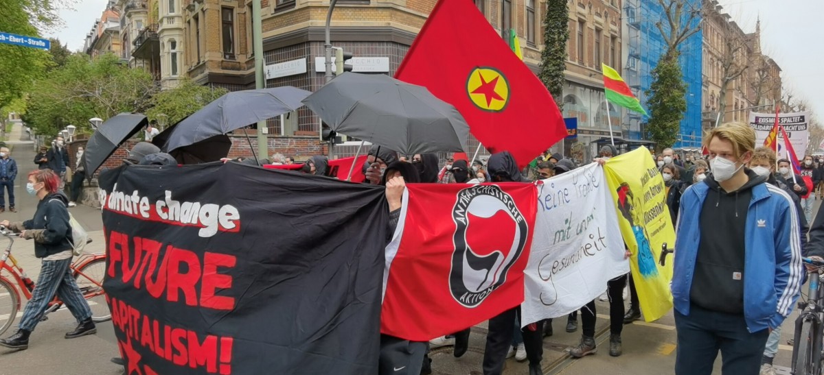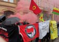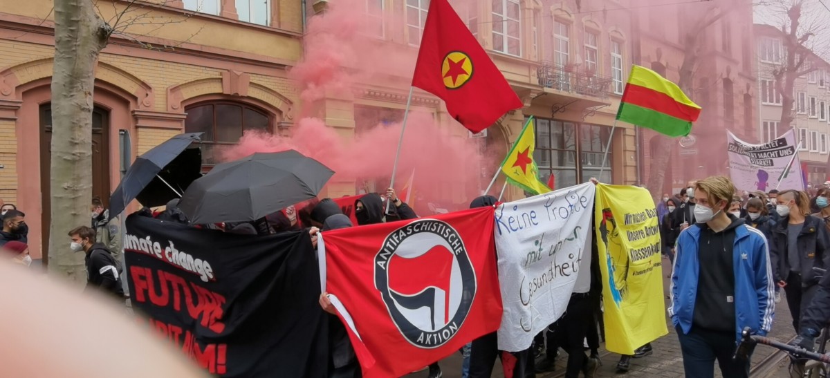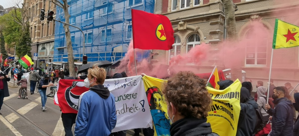 Eylemde YPG ve Antifa bayraklarının yanı sıra Almanya’da keyfi kanunlarla yasaklanan PKK bayrağı da taşındı. Gençler renkli dumanlarla eylemlerine görsellik kattılar.