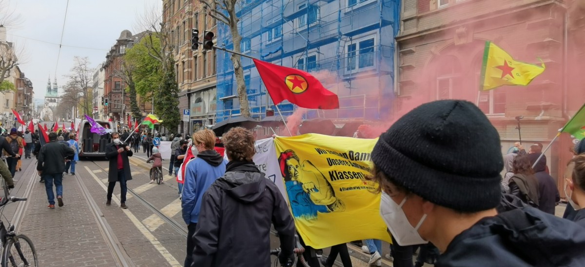 Yürüyüş boyunca sık sık “Bijî Serok APO”, “Bijî Berxwedana Gerîla”, “Es Lebe 1 May” ve “Hoch die Internationale Solidarität” sloganları atıldı.