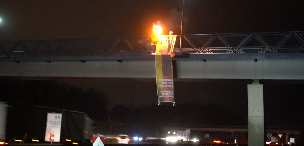 Gençler, Almanya’nın Kassel kentinde A7 otoyolundaki bir köprüye üzerinde Almanca, “Tecride, Faşizme, İşgale Son” yazılı pankart astı. Pankart uzun süre köprüde asılı kaldı.
