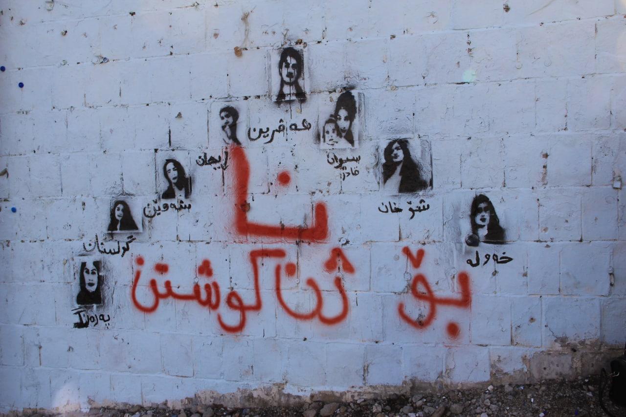 SILÊMANÎYÊ- Jinên Ciwanên Tekoşer Silêmanîyê sokaklarında ‘Em Dibêjin NA’ hamlesi  ve 25 Kasım Kadına Yönelik Şiddetle Uluslararası Mücadele Günü kapsamında 4 parça Kurdistan’a erk zihniyet tarafından katledilen kadınların resimlerini duvarlara çizdiler.