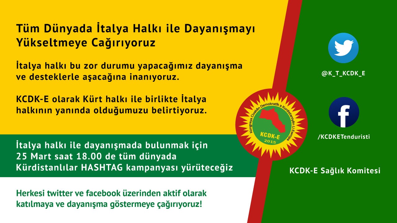 KCDK-E olarak tüm toplum merkezlerine, bileşenlerimize, halkımıza, dostlarımıza tüm insanlığa çağrımız 25 Mart saat 18.00’da İtalya halkı için yapacağımız Hashtag kampanyasına katılmalarıdır.”