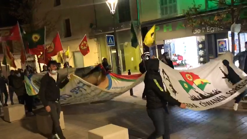 “Tecride, İşgale, Faşizme Son – Bi Hev Re Serhildan” hamlesi kapsamında düzenlenen eylem saat 19’da Marignane belediyesi önünde başladı. Gençler yürüyüşte, Halklar Önderi Abdullah Öcalan’ın resminin olduğu ve üzerinde birçok dilde “Öcalan’a Özgürlük” yazan pankartını açtı.