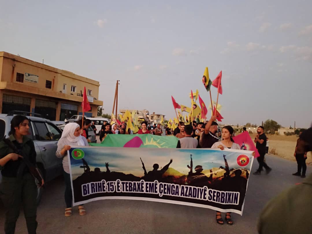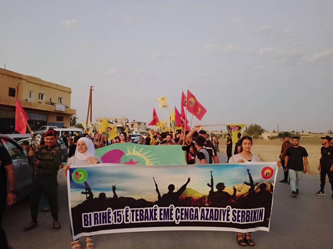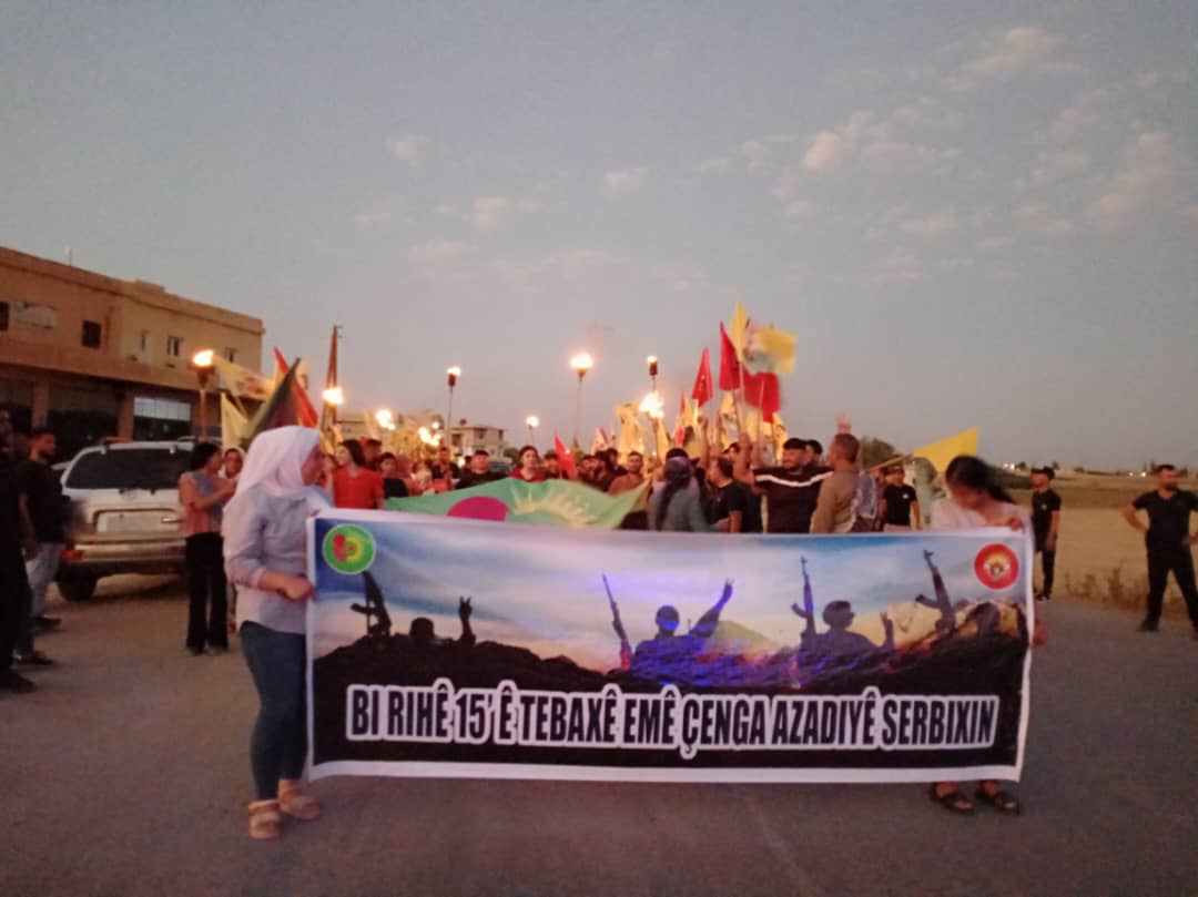 Gençler “15 Ağustos Ruhuyla Özgürlük Savaşını Kazanalım” yazılı pankart eşliğinde yol boyunca “Bijî Serok APO” “Bê Serok Jiyan Nabe” “Tolhiladan” sloganları atarak yürüdü.