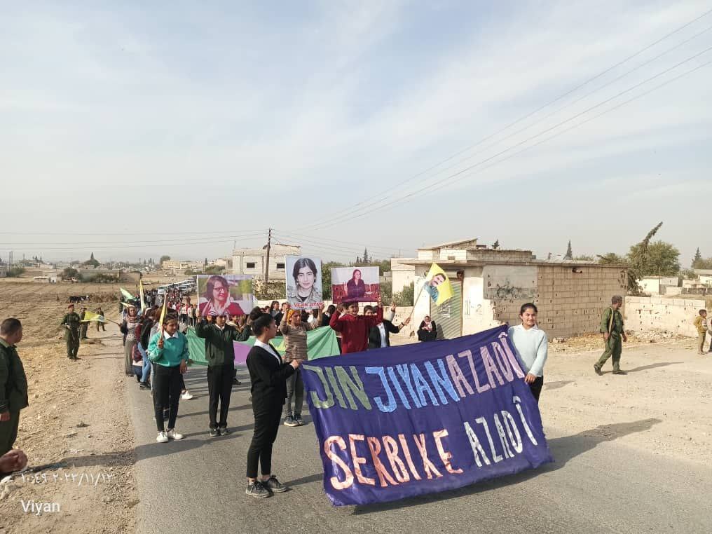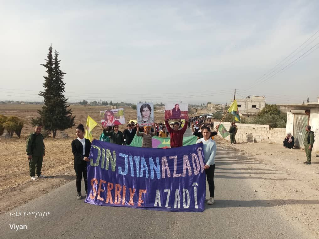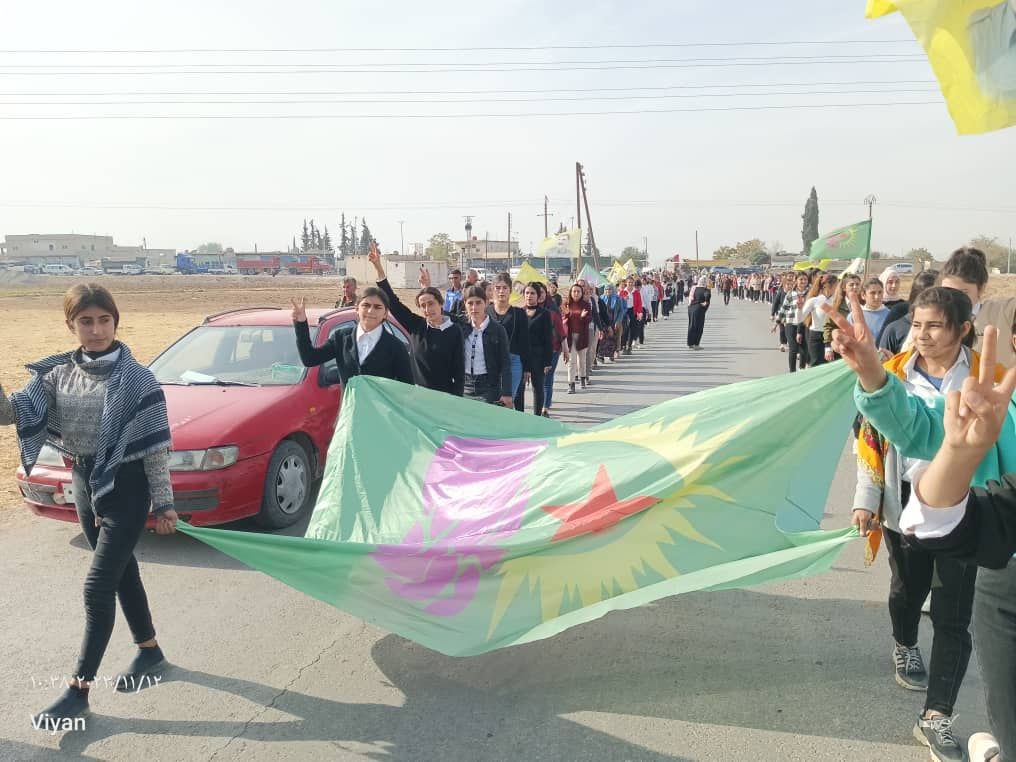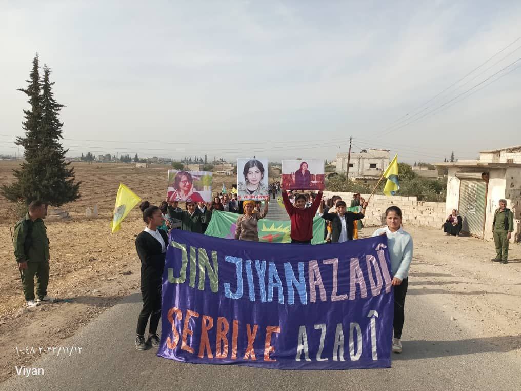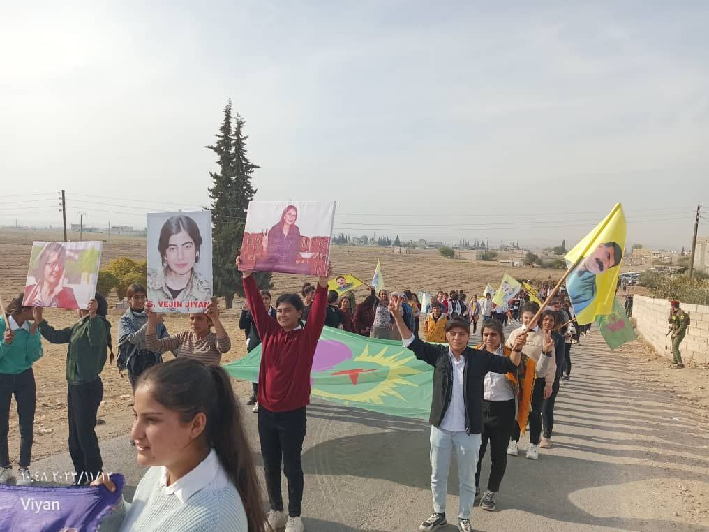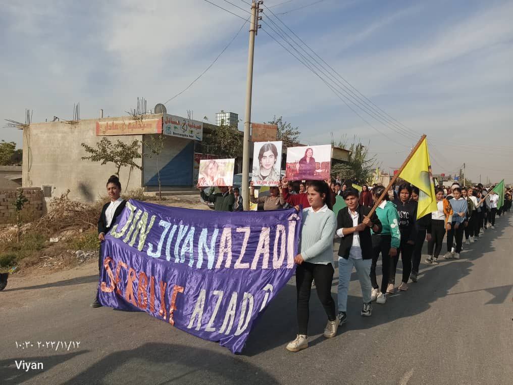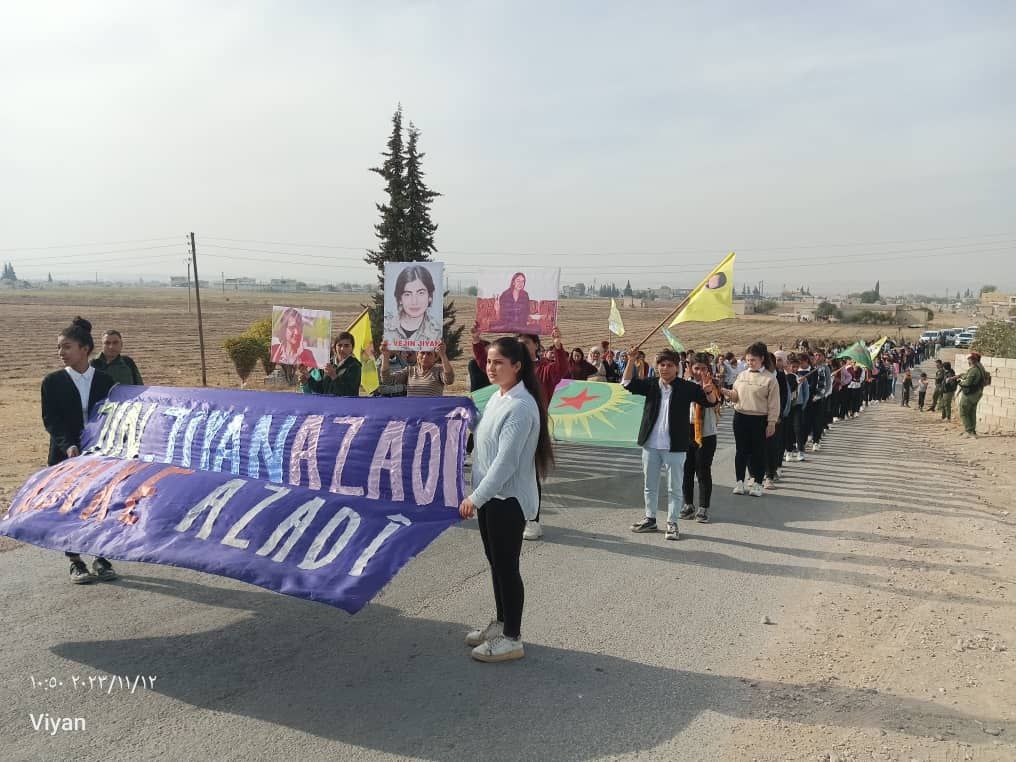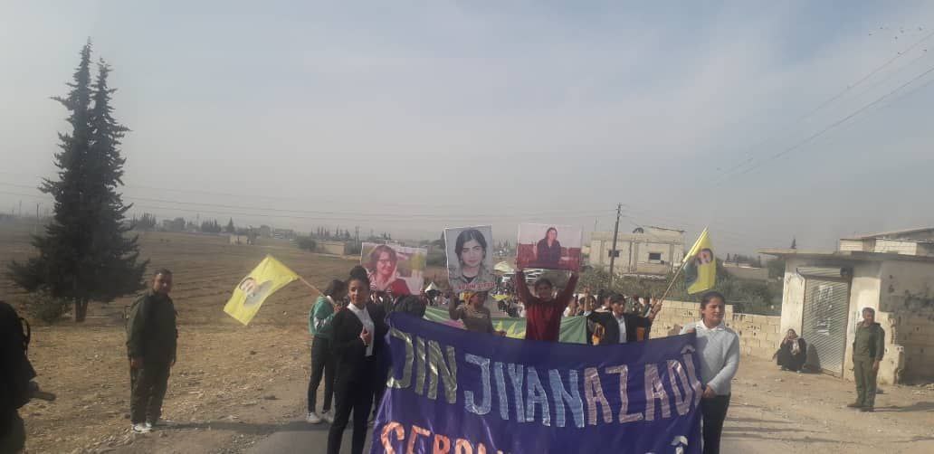 Yapılan saldırılardan sonra Derîk, Kobanê, Minbic, Reqka, Derazor’da ve bir çok farklı noktada saldırıya karşı yürüyüşler ve basın açıklamaları gerçekleşmişti. Bu temelde bugün de Kobanê Yekitiya Jinên Ciwan tarafından yapılan saldırıyı kınamak amaçlı Kobanê’nin Qene ilçesinde kitlesel bir yürüyüş düzenlendi. Yürüyüşe çok sayıda genç kadın ve Kobanê halkı katıldı. Yürüyüşte “Jin Jiyan Azadî Serbixe Azadî pankartı taşınırken sıkça “Biji Berxweda Ciwana” “Biji Berxwedan İmrali” sloganları atıldı.