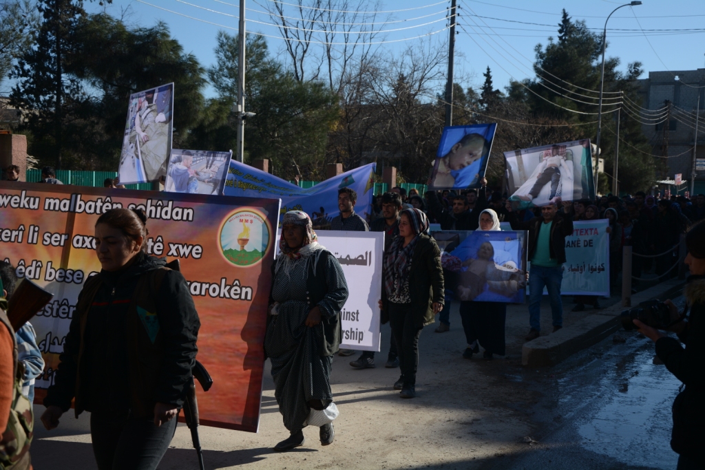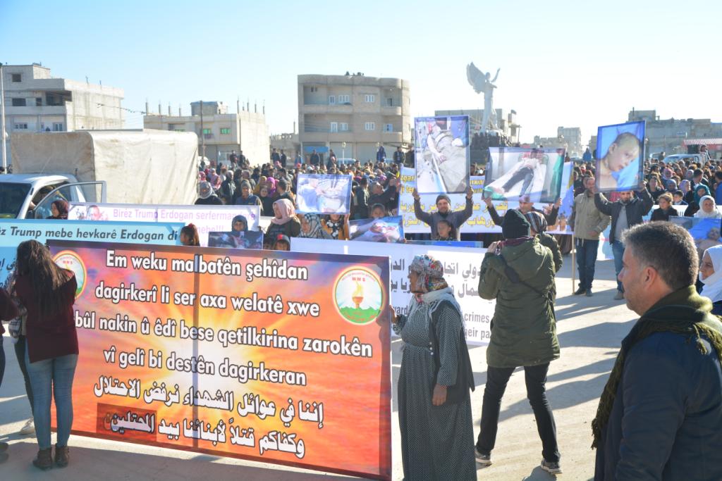KOBANÊ – Kobanê’de Özgür Kadın Meydanı’nda toplanan binlerce kişi, Türk devletinin işgal saldırılarını protesto etmek için yürüdü. Yürüyüşe siyasi partiler, sivil ve resmi birçok kurum destek verdi. Yürüyüşte üzerinde “Sayın Trump katledilmemizde Erdoğan’a ortak olmayın” ve “Türk devleti yasaklı silahlarla bütün dünyanın gözü önünde sivilleri katletti” yazılı pankartlar taşındı.