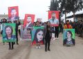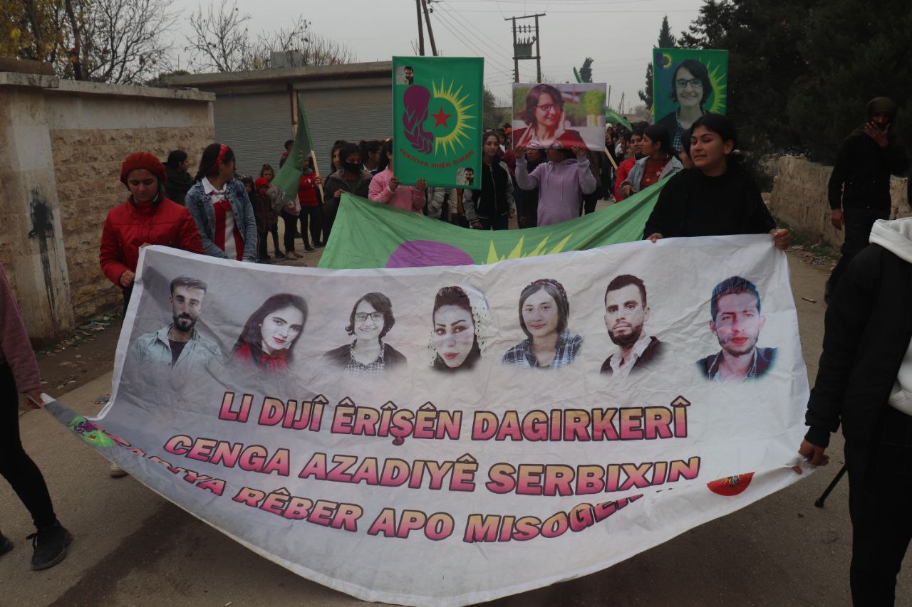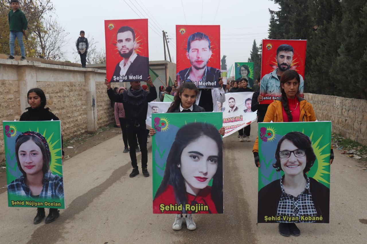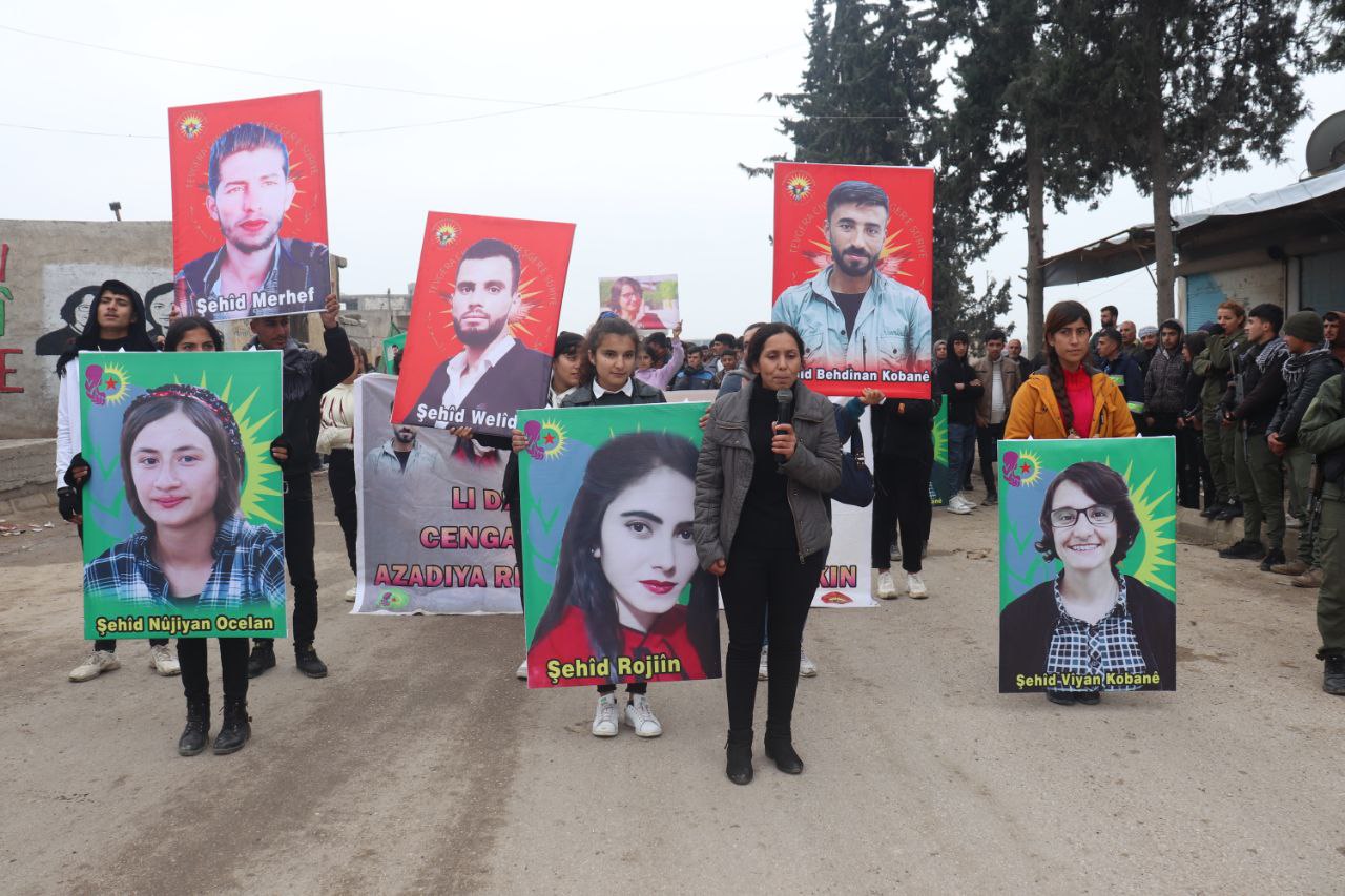 KOBANÊ – Bugün Kobanê şehrinin Qenê ilçesine bağlı işgalci Türk devletinin gençlik merkezine yönelik saldırılarında altı gençlik üyesinin katledilmesinin ikinci yıl dönümü için onlarca genç kadın yürüyüş yaptı. İşgalci Türk devletinin 2 yıl önce Kobanê’de düzenlediği hava saldırısında Gençlik Birliği üyeleri Viyan Kobanê, Nujiyan Öcalan ve Rojin Ahmed İsa ile Suriye Devrimci Gençlik Hareketi üyeleri Walid Mihemed Menal, Murhef Khalil İbrahim ve Masoud İbrahim şehit oldular.