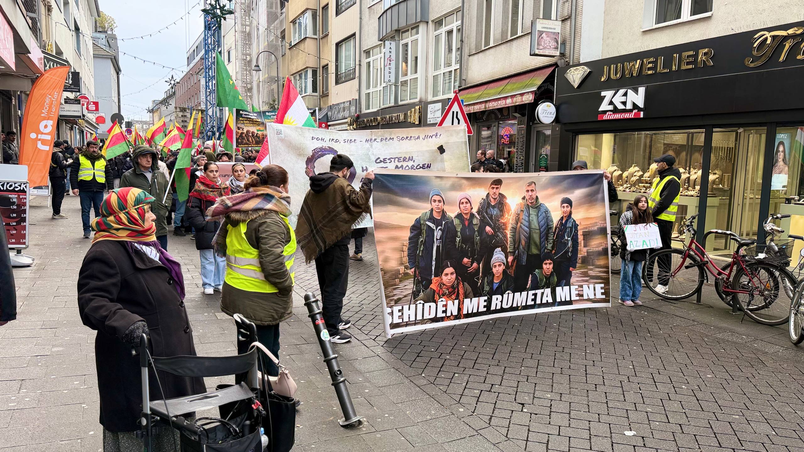 Türk devleti, HTŞ ve DAİŞ çetelerinin Rojava’ya yönelik saldırılarına karşı binlerce Kürdistanlı Köln’de bir araya geldi. Köln Merkez Tren İstasyonu’nda toplanan kitle, “Terörist Erdoğan – Colani” sloganları eşliğinde Ebertplatz Meydanı’na yürüdü.