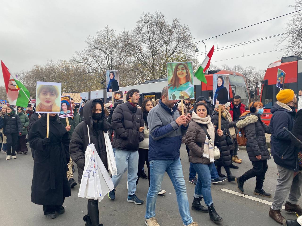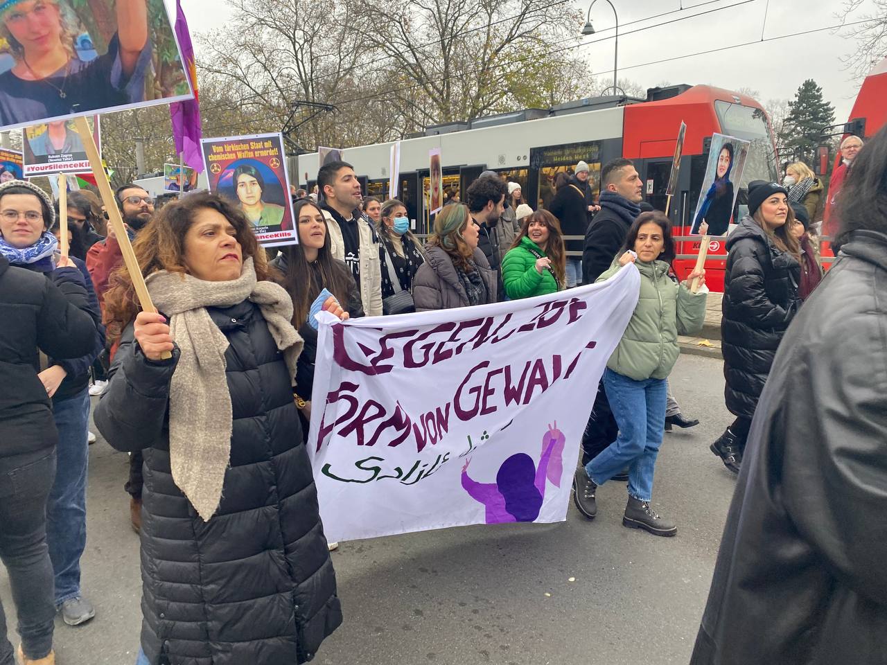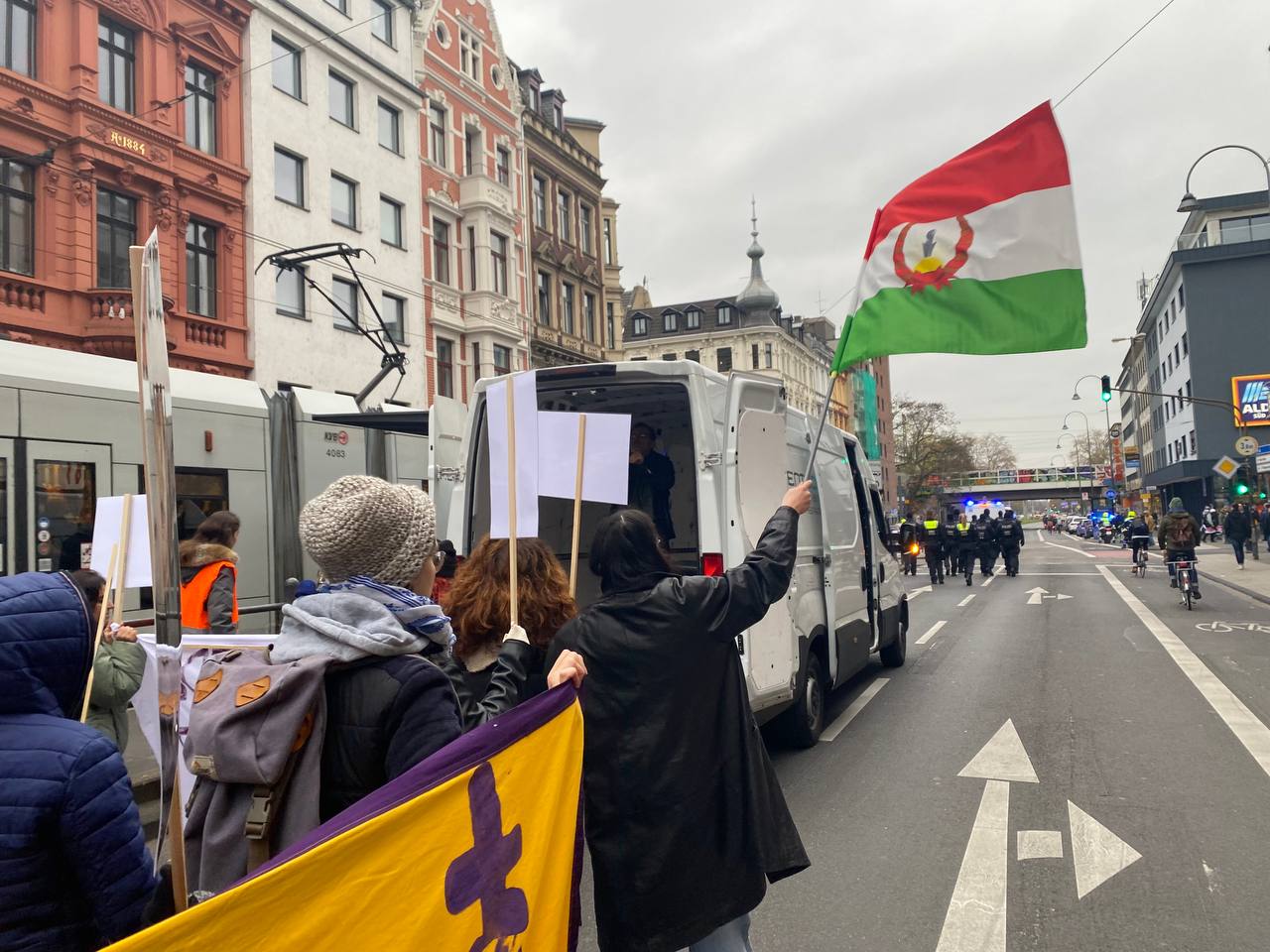 Eylem boyunca sık sık Almanca, Kürtçe ve Farsça dillerinde sloganlar atıldı. Yürüyüş sloganlar eşliğinde son buldu.