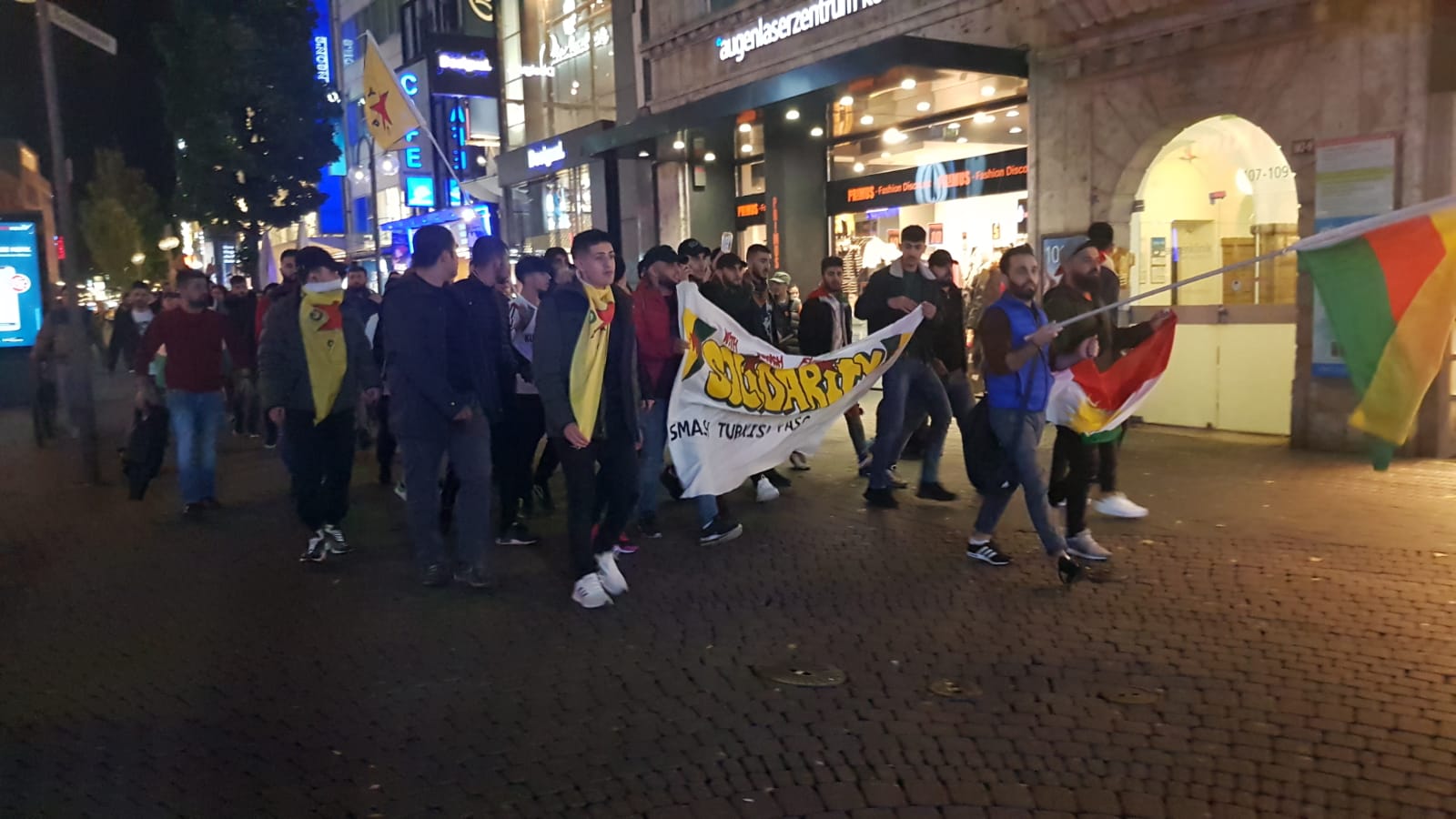 Tevgera Ciwanên Şoreşger’in çağrısıyla Köln çarşı merkezinde toplanan Kürdistanlı ve enternasyonal gençler, spontane bir yürüyüş gerçekleştirdi. Halklar Önderi Abdullah Öcalan’ın posteri ve YPG, YPJ bayraklarıyla yürüyüşe başlayan gençler, marşlar ve sloganlarla Türk devletinin işgali ve Alman devletinin işbirliğini protesto ettiler.