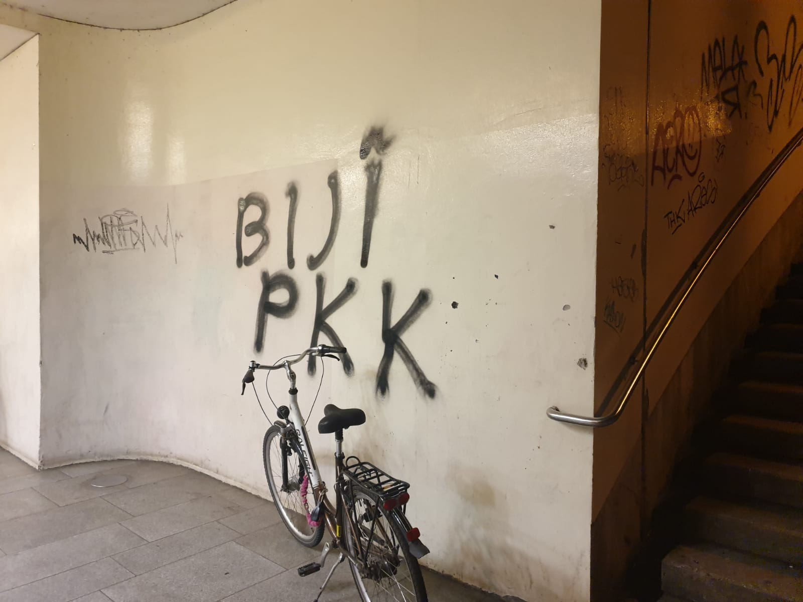KÖLN – Almanya’nın Köln şehrinde yaşayan Kürt gençleri, şehrin çeşitli yerlerine yaptıkları yazılamalarla sömürgeci Türk devletinin işgal saldırılarını protesto etti. Köln şehrinin en işlek tren istasyonlarında yapılan yazılamalarda Türk sömürgeciliğinin başta Rojava’ya yönelik işgal tehditlerine dikkat çekildi.