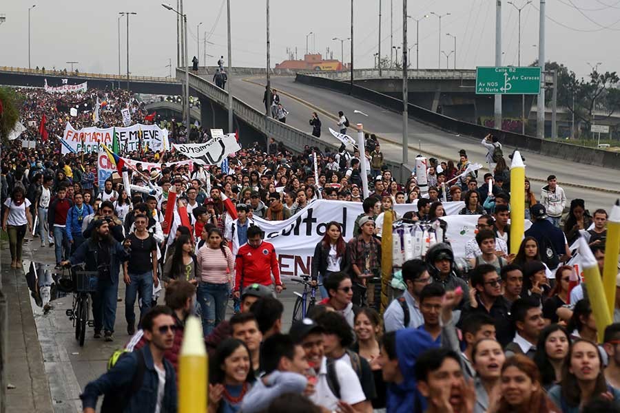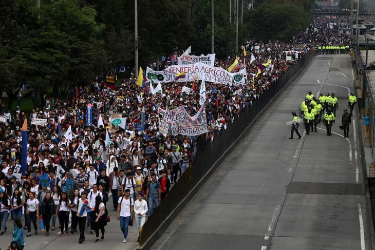 Bogota’daki Nacional, Pedagogica ve Distrital gibi önemli kamu üniversitelerinin yanı sıra diğer yükseköğretim kurumlarından da öğrenci gruplarının ve akademisyenlerin düzenlediği yürüyüşe 14 bine yakın kişi katıldı.