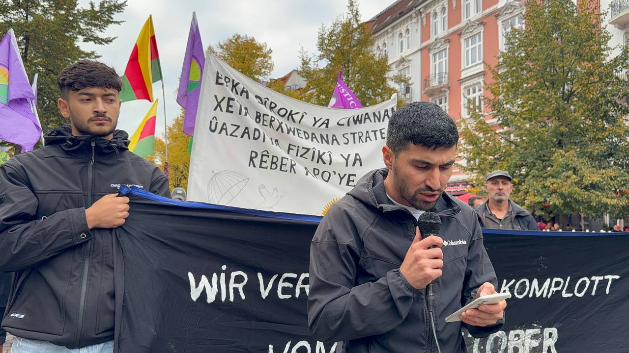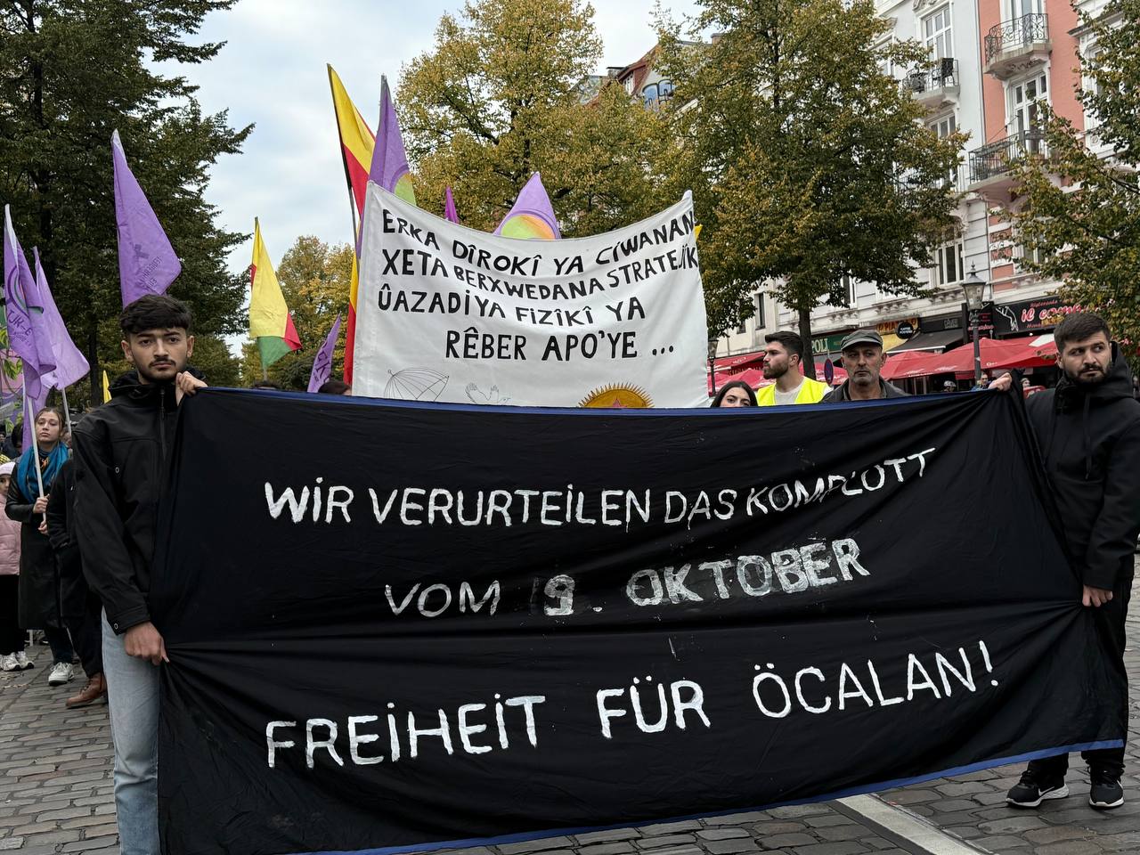 Yürüyüşün bitiş kısmında, Kürdistan Devrim Şehitleri adına yapılan bir dakikalık saygı duruşu’ nun ardından, TCŞ Hamburg adına yapılan basın açıklamasında ; ” TCŞ Hamburg Gençliği olarak Şehit Erdal Şahin, Şehit Rojhat Zilan, Şehit Rojger Helin ve Şehit Asya Ali şahsında Ekim ayı Şehitleri ve bütün Kürdistan Devrim Şehitlerini saygıyla anıyoruz. Bildiğiniz gibi bugün burada, Önder Apo şahsında tüm barışsever halklara karşı girişilen uluslararası komployu kınamak için bulunuyoruz. Uluslararası güçler, Ortadoğu’ya müdahale edip, tıpkı Gazze çatışması gibi vahşi bir savaş başlatarak bu planlarını gerçekleştirmek istiyorlardı. Önder Apo ve yoldaşları başlattıkları mücadele ile engel oluyordu. Bu nedenle uluslararası komplo 9 Ekim 1998’de başladı. Ardından Önder Apo 15 Şubat’ta fiziken esir alındı” dendi.