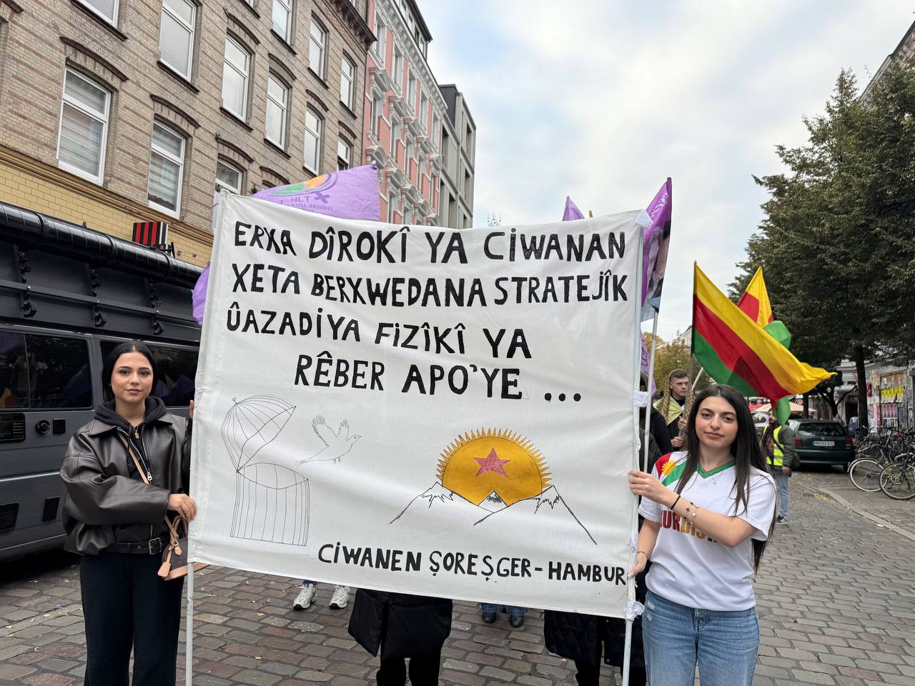 Yürüyüşe başlayan Gençler “Bê Serok Jîyan Nabe” “Bijî Serok APO” sloganları atarak Hamburg sokaklarında ilerledi.