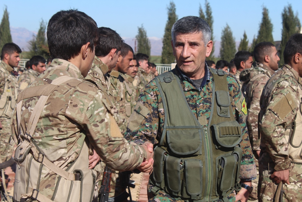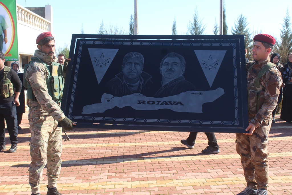 Şehit Xebat Dêrik’in ailesi adına, üzerinde onun fotoğrafının bulunduğu bir tablo YPG’li komutanlara takdim edildi.