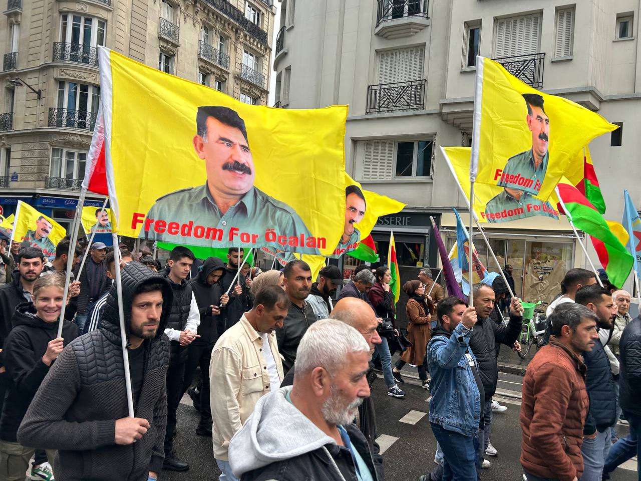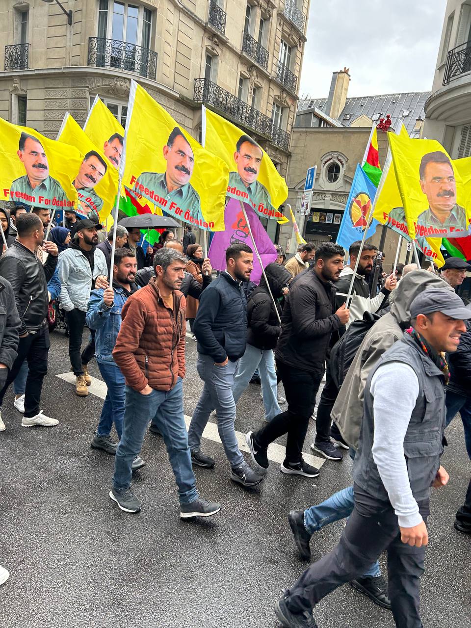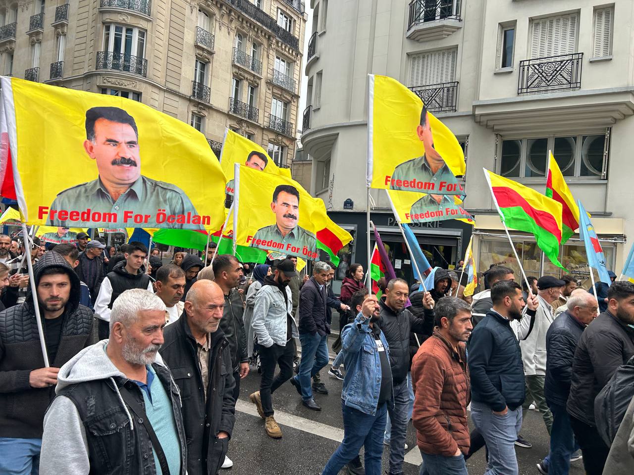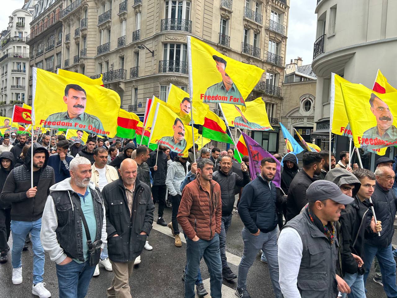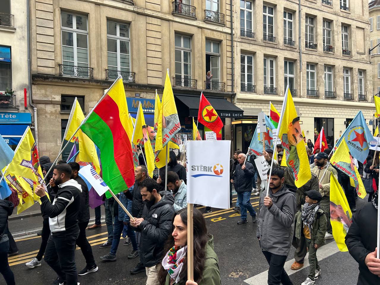 Önder APO bayrakları, Medya Haber ve Stêrk Tv kanal logolarının broşürlerini taşıyan kalabalık kitle, sloganlar eşliğinde Belçika polisinin Özgür basına yönelik korsanvari saldırılarını protesto etti.