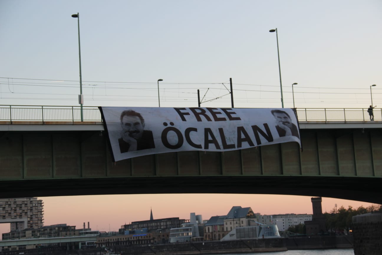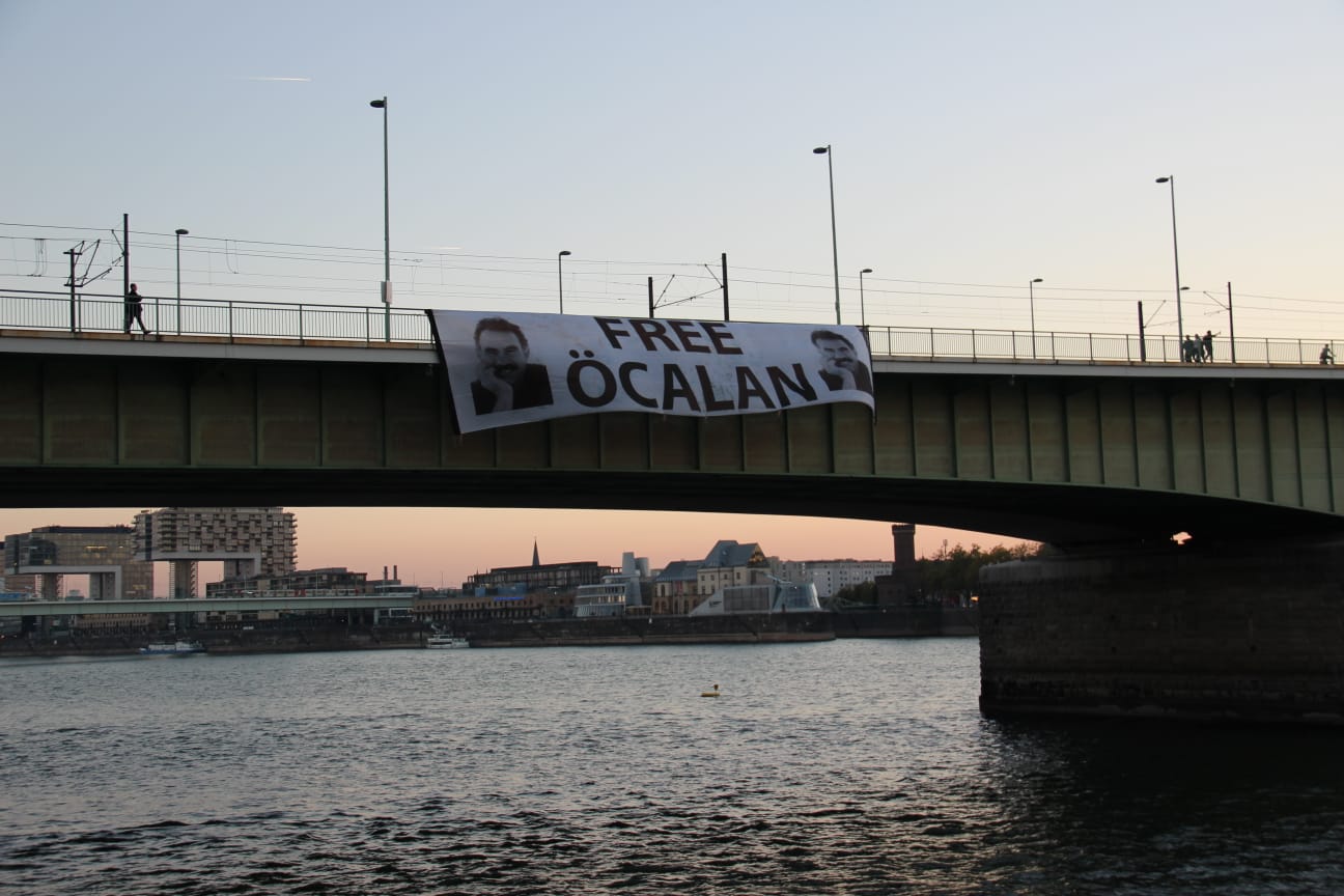 KÖLN – Almanya’nın Köln kent merkezinde bulunan Deutz köprününe Kürdistanlı genç kadınlar tarafından, Halklar Önderi Abdullah Öcalan’ın üzerindeki ağırlaştırılmış tecride dikkat çekmek için ve 9 Ekim uluslararası komplonun 20. yılını kınamak amacıyla pankart eylemi gerçekleştirildi. 30 metrelik pankartın üzerinde Halklar Önderi Öcalan’ın resmin olduğu ve  “Free Öcalan” yazılı dev pankart asıldı.