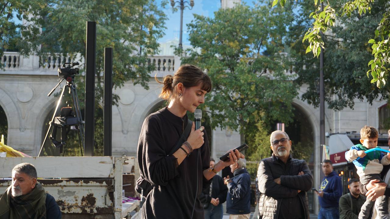 Châtelet Meydanı’na varıldığında, kitle Kürdistan devrim şehitleri anısına bir dakikalık saygı duruşunda bulundu. Saygı duruşunun ardından çeşitli konuşmalar yapıldı. Avrupa Kürt Demokratik Toplum Kongresi (KCDK-E) Eş Başkanı Zübeyde Zümrüt , Önder APO’nun 27 Şubatta yaptığı “Barış ve Demokratik Toplum” çağrısı ve yeniden inşa sürecinin başlamasında Avrupada ki eylemlerin büyük rol oynadığını bu nedenle 8 Kasım’da Köln’de yapılacak olan büyük yürüyüşe katılım çağrı yaptı.