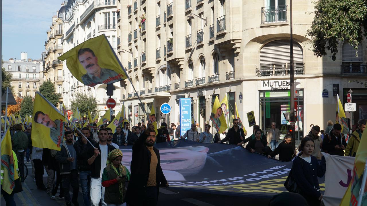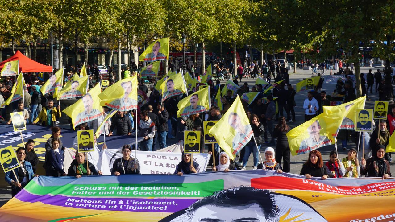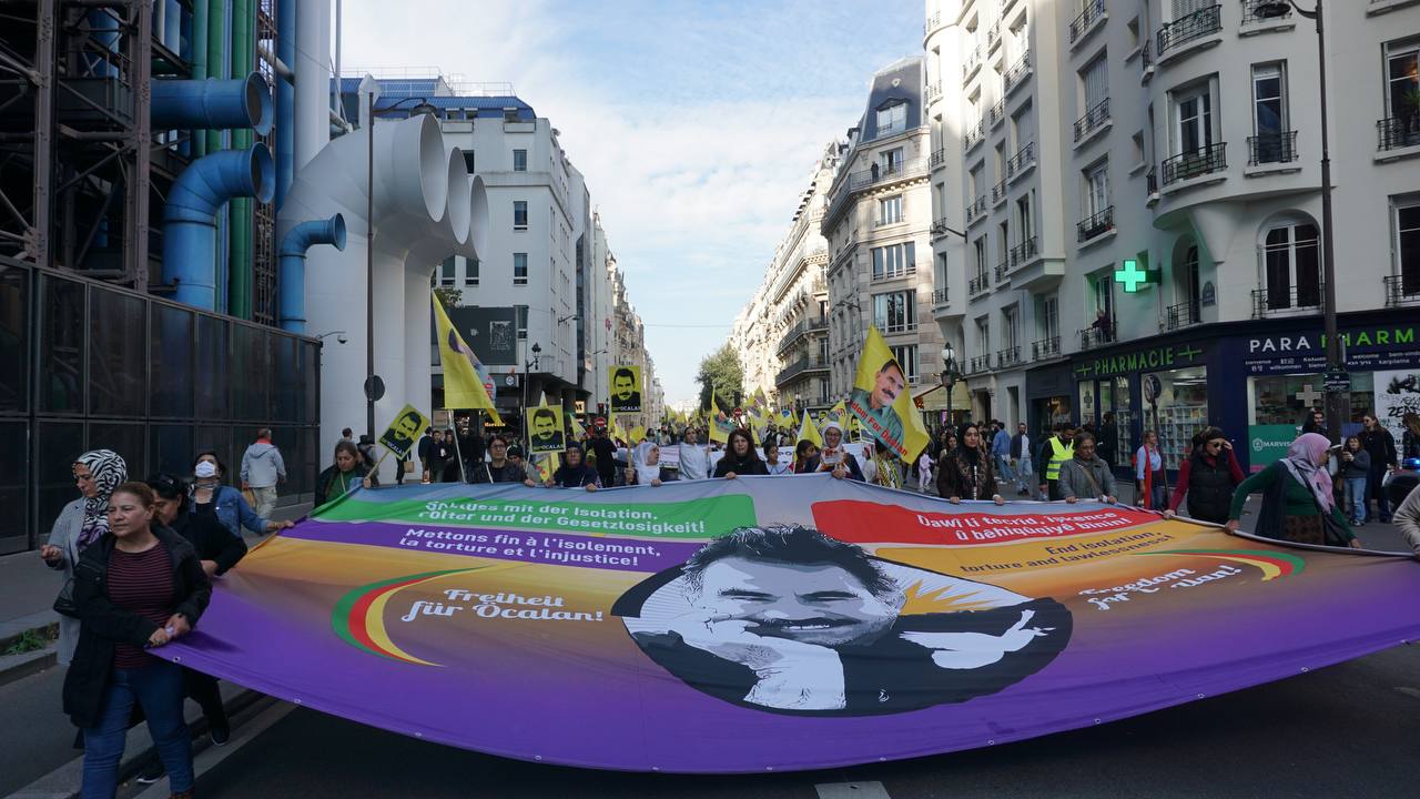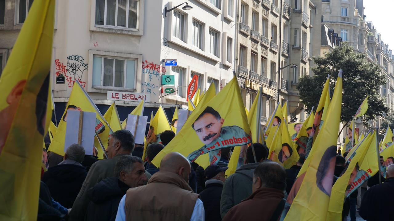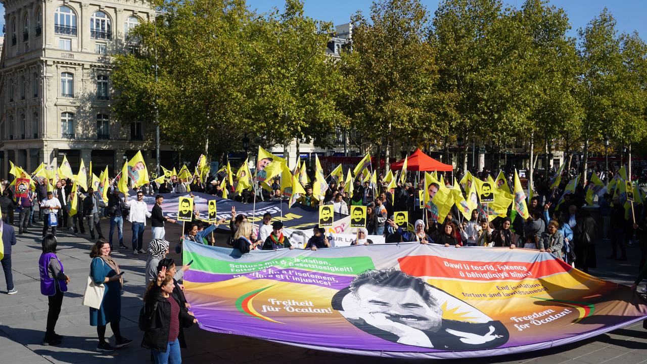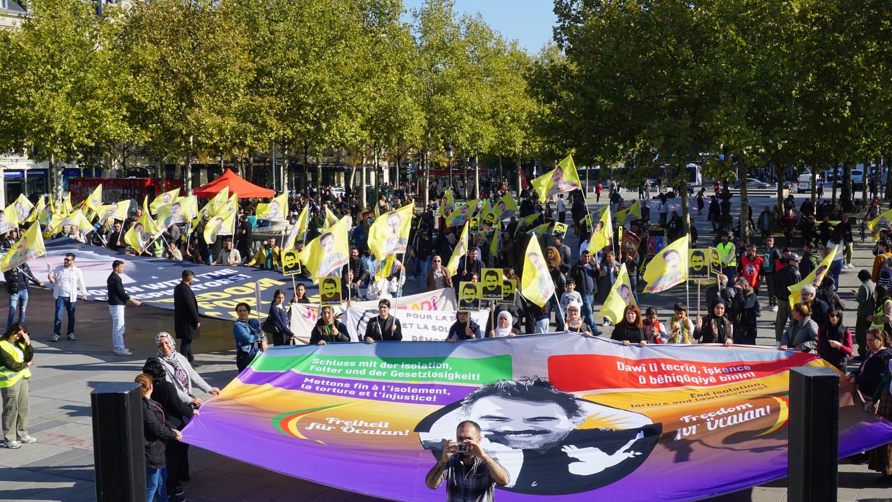 Sokaklarda “Bijî Serok Apo”, “Jin, Jiyan, Azadî” “Ciwan fedaiyên Rêber APO’ye” “libèrez Öcalan ve “Solution politique pour le Kurdistan” sloganları yankılandı.