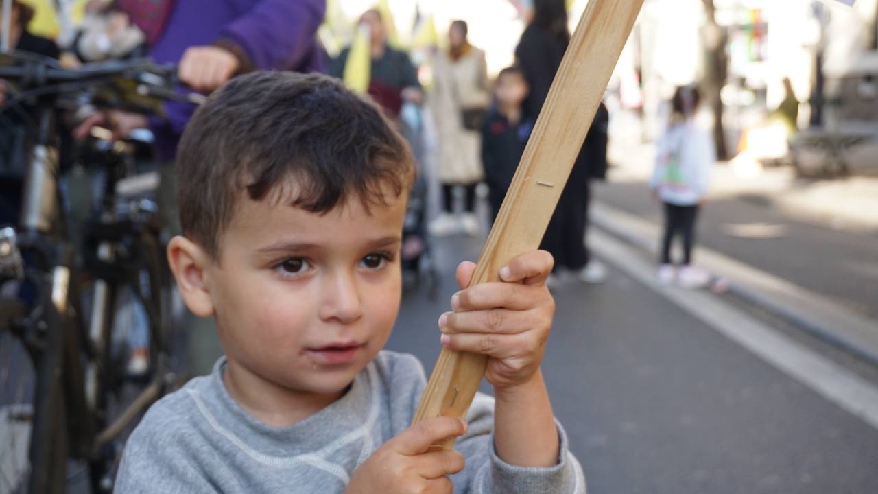 Eylemde ayrıca Avrupa Enternasyonal Gençliği’nin bildirisi okundu. Bildiride, Enternasyonelist Gençliğin, Kürt halkının özgürlük mücadelesiyle omuz omuza olduğunu, tecride ve komplocu güçlere karşı ortak direnişi büyüteceği ifade edildi.
