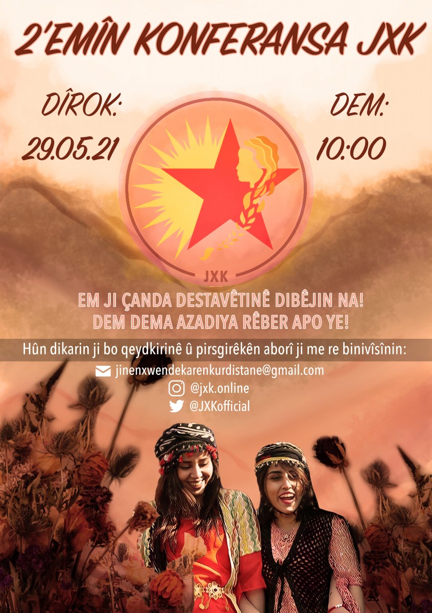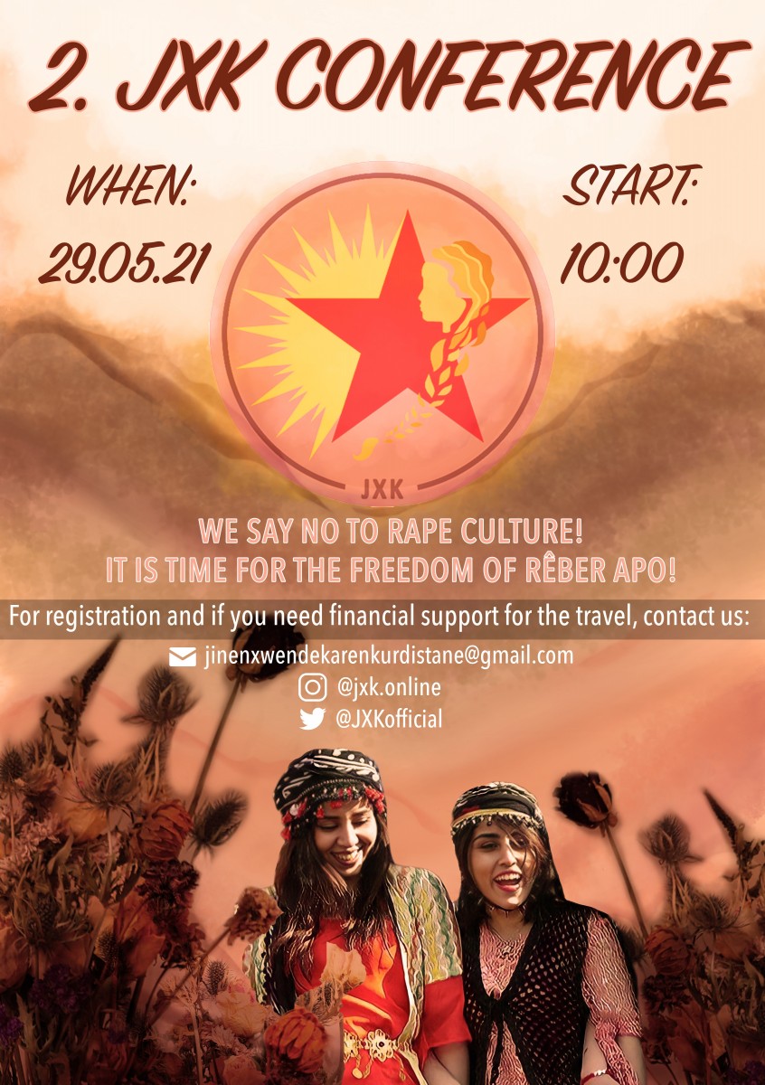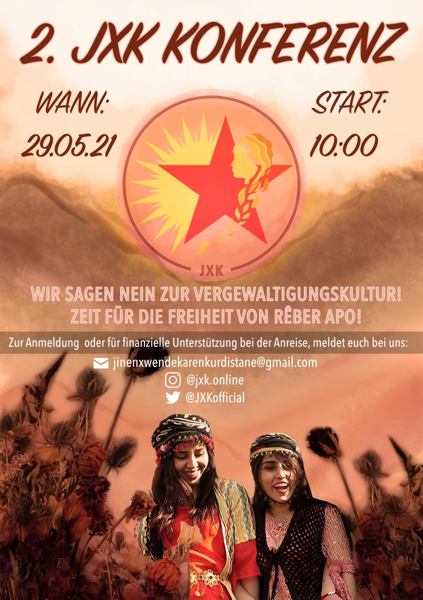 Mevcut durum ve aciliyet göz önüne alındığında, son iki yılı tartışmak, değerlendirmek ve mücadelemiz için yeni yöntemler bulmak için bir araya gelme ihtiyacı görüyoruz. Bu nedenle Avrupa çapında 2. JXK konferansımızı düzenliyoruz. Kürt ve Enternasyonalist genç kadınlar olarak kimliğimizi vurgulamak ve zamanımızın sorularına cevaplar bulmak için kendimizi nasıl eğitip, organize edebileceğimizi birlikte tartışacağız. Ataerkillik aslında bize ne yapıyor? Cani erkek zihniyetinin karakteri nasıl değişir? Bu zamanlarda bile ona karşı nasıl örgütlenebiliriz? Bunu daha iyi ortaya çıkarmak için ne tür eylemler geliştirebiliriz? Bu nedenle sizi 29 Mayıs 2021’deki 2. JXK konferansına davet ediyoruz. Özgürlük mücadelemizden bizi hiçbir şeyin alıkoymasına izin vermeyeceğiz! Geleceğimizi kendimiz inşa edeceğiz! Bu nedenle tecavüz kültürüne “HAYIR” diyoruz! Tecride karşı “HAYIR” diyoruz! Rêber APO’nun özgürlüğünün zamanı geldi!