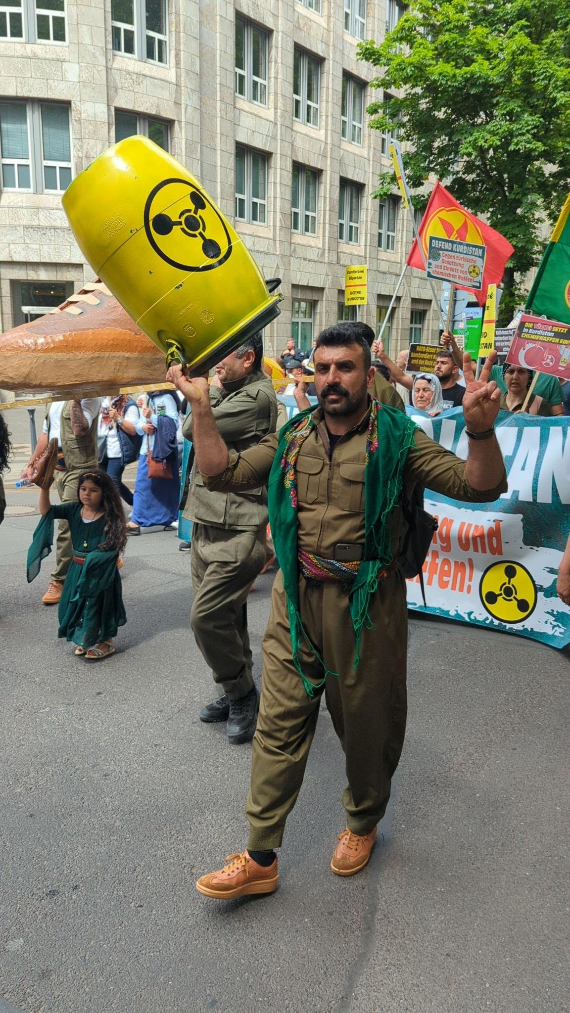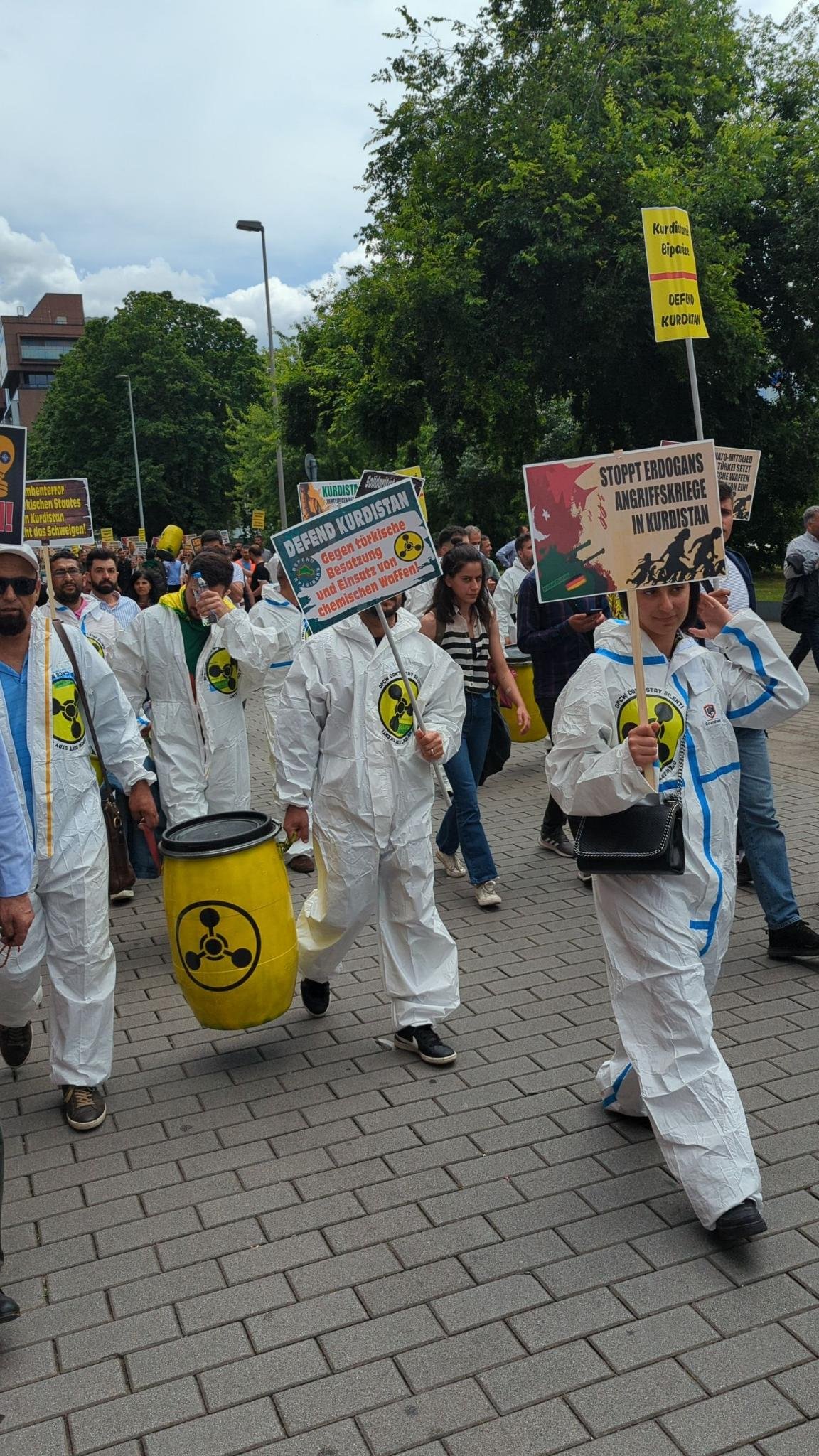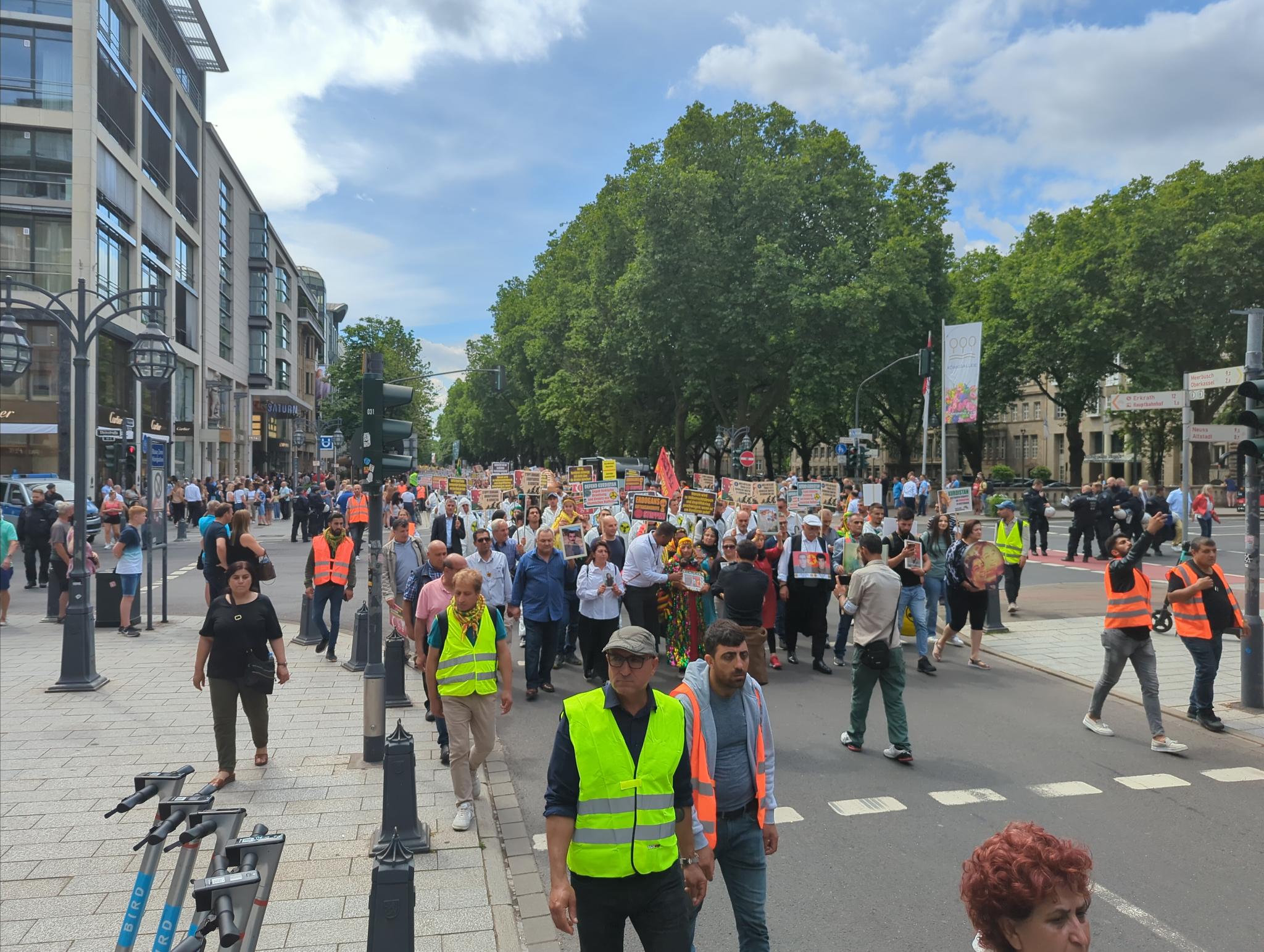 KCK, PKK, YPG bayrakları İle Kürt Halk Önderi Abdullah Öcalan posteri açılan yürüyüşte, Gerilla kıyafeti ve mekaplarla gerilla mücadelesi sahiplendi. Ayrıca “NATO-Mitglied Türkei setzt chemische waffen in Kurdistan ein”, “Solidarität mit der kurdischen Freiheitsbewegung”, “Defend Kurdistan”, “Erdogans Giftgasangriffe stoppen”, “Defend Kurdistan gegen türkische Besetzung und Einsatz von chemische Waffen”, “Wer zu Kurdistan schweigt, soll nicht über die Ukraine sprechen!” pankartları taşındı.