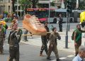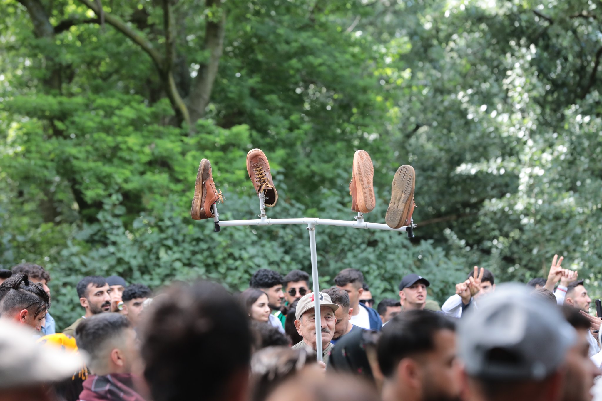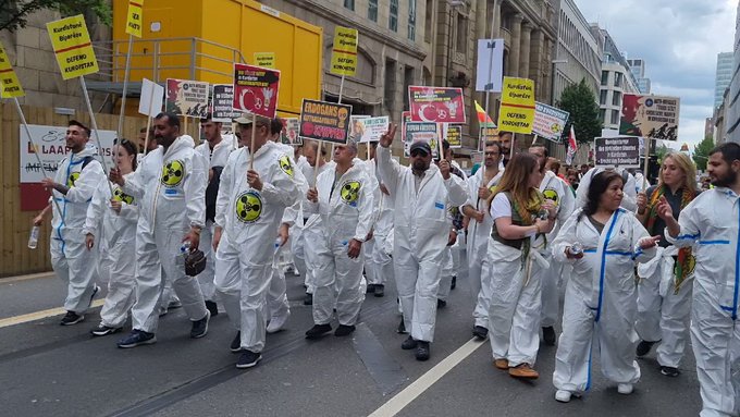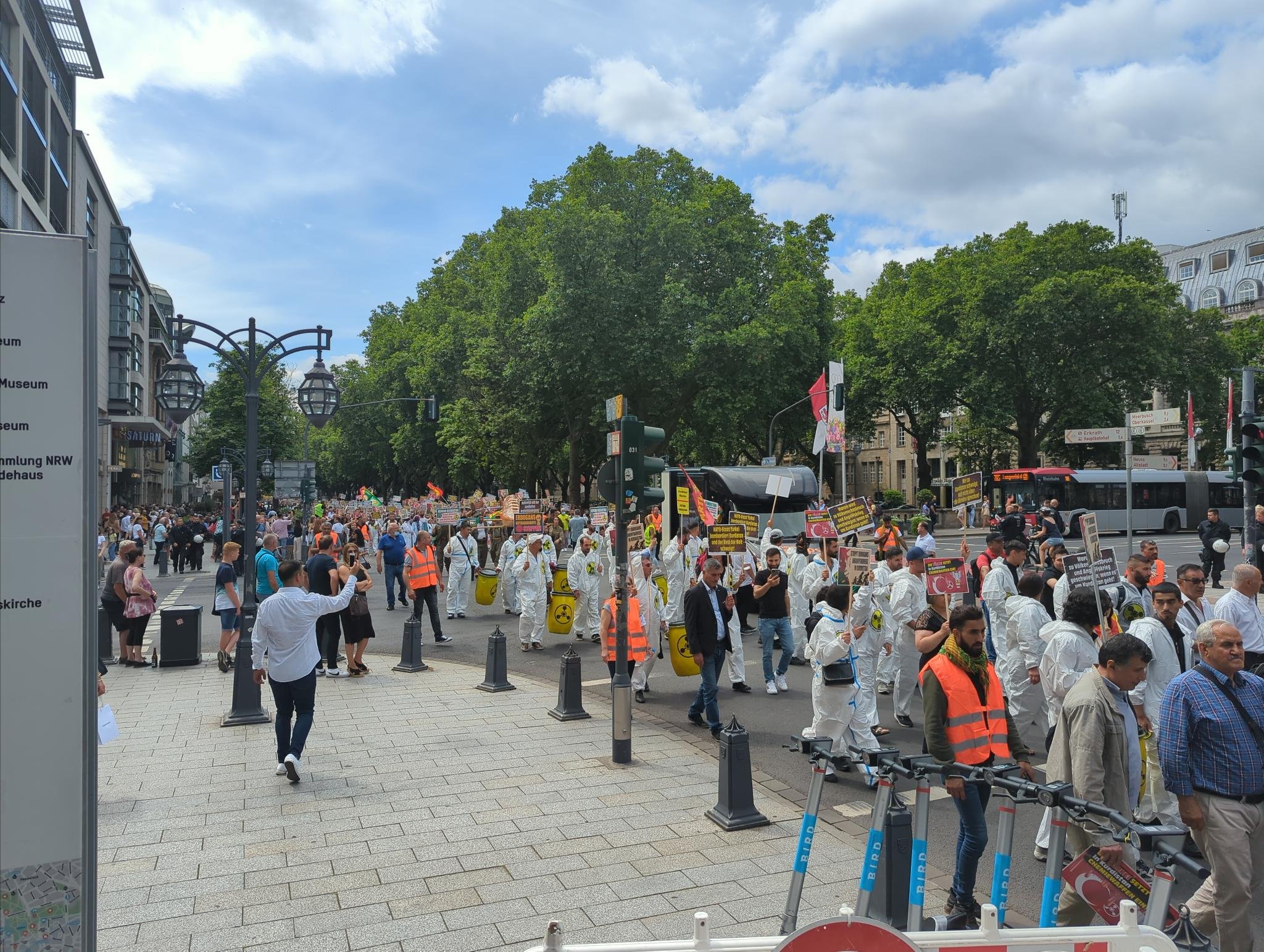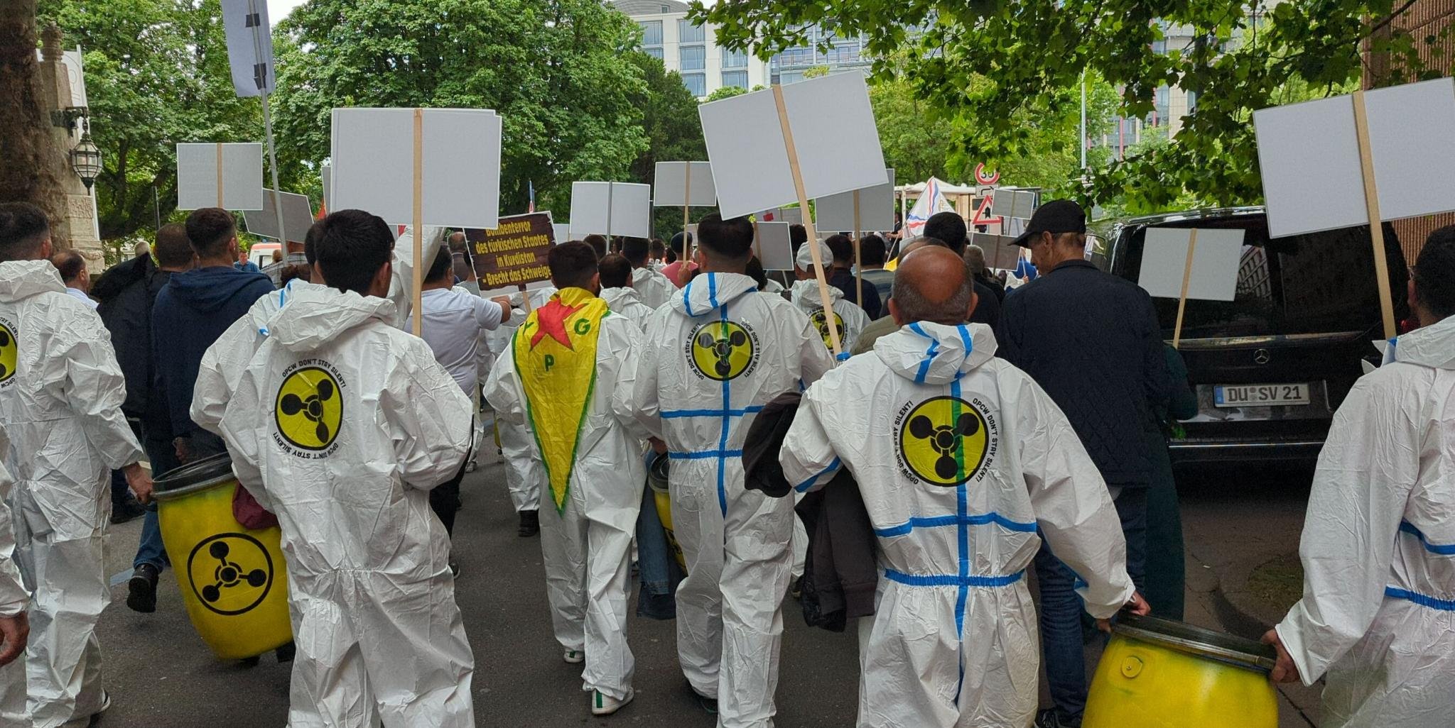 KCK, PKK, YPG bayrakları İle Kürt Halk Önderi Abdullah Öcalan posteri açılan yürüyüşte, Gerilla kıyafeti ve mekaplarla gerilla mücadelesi sahiplendi. Ayrıca “NATO-Mitglied Türkei setzt chemische waffen in Kurdistan ein”, “Solidarität mit der kurdischen Freiheitsbewegung”, “Defend Kurdistan”, “Erdogans Giftgasangriffe stoppen”, “Defend Kurdistan gegen türkische Besetzung und Einsatz von chemische Waffen”, “Wer zu Kurdistan schweigt, soll nicht über die Ukraine sprechen!” pankartları taşındı.