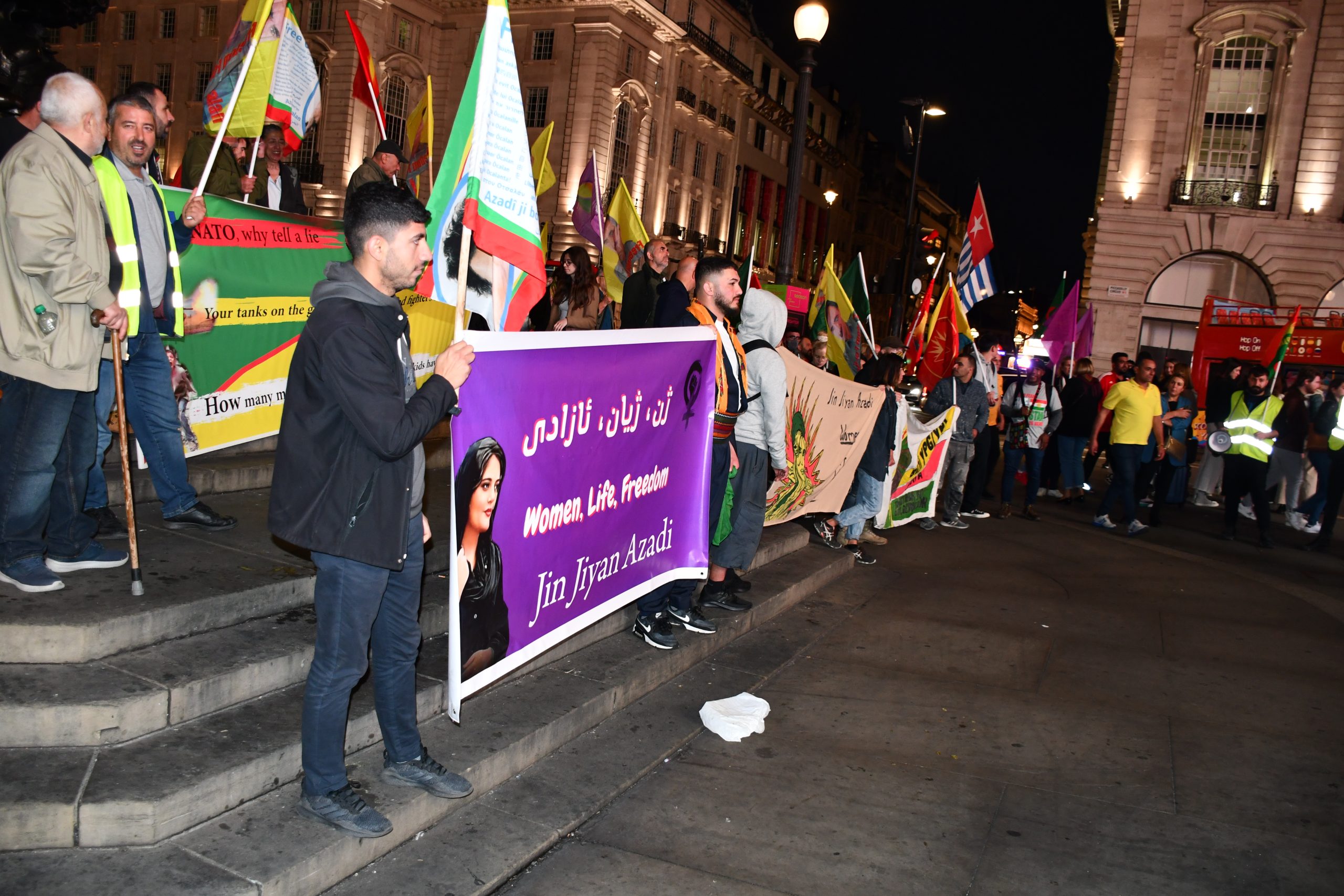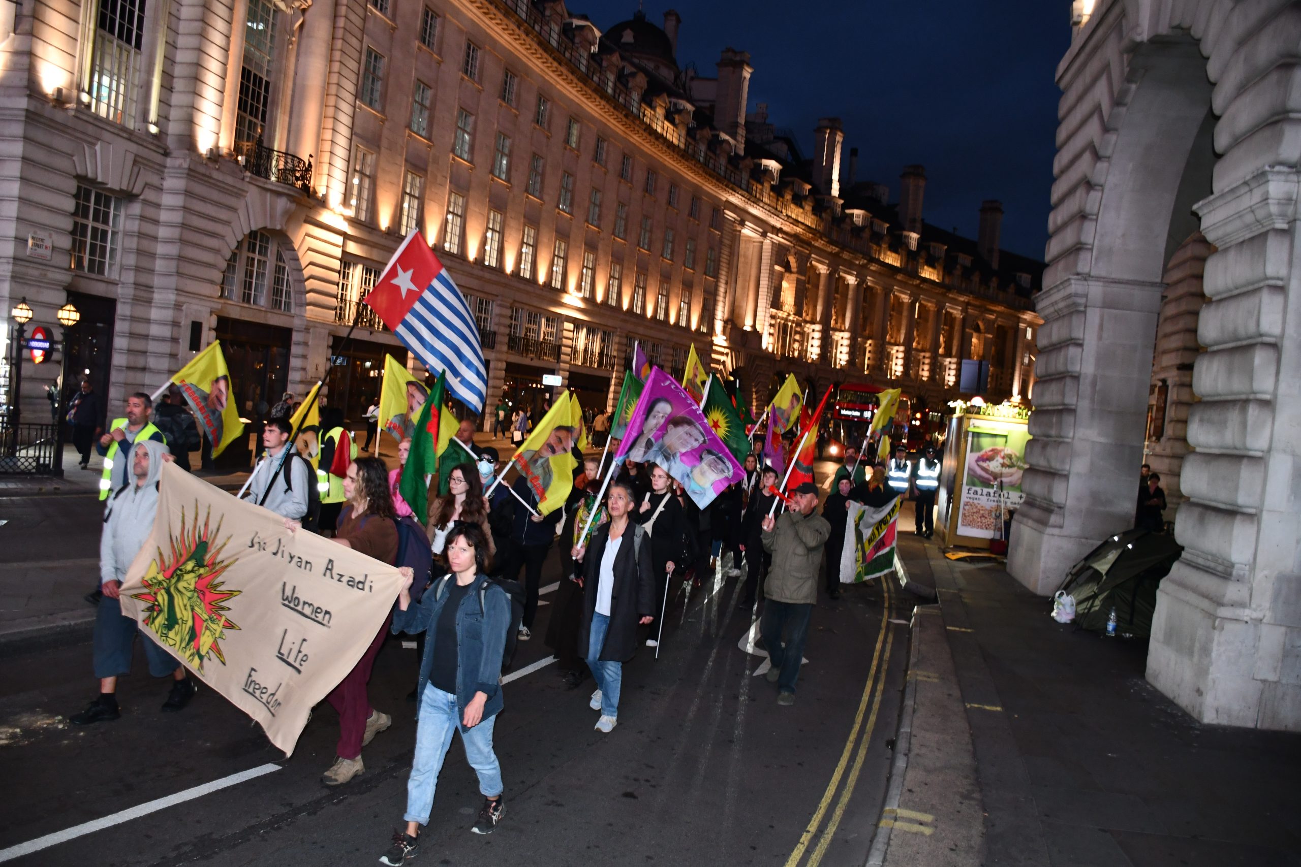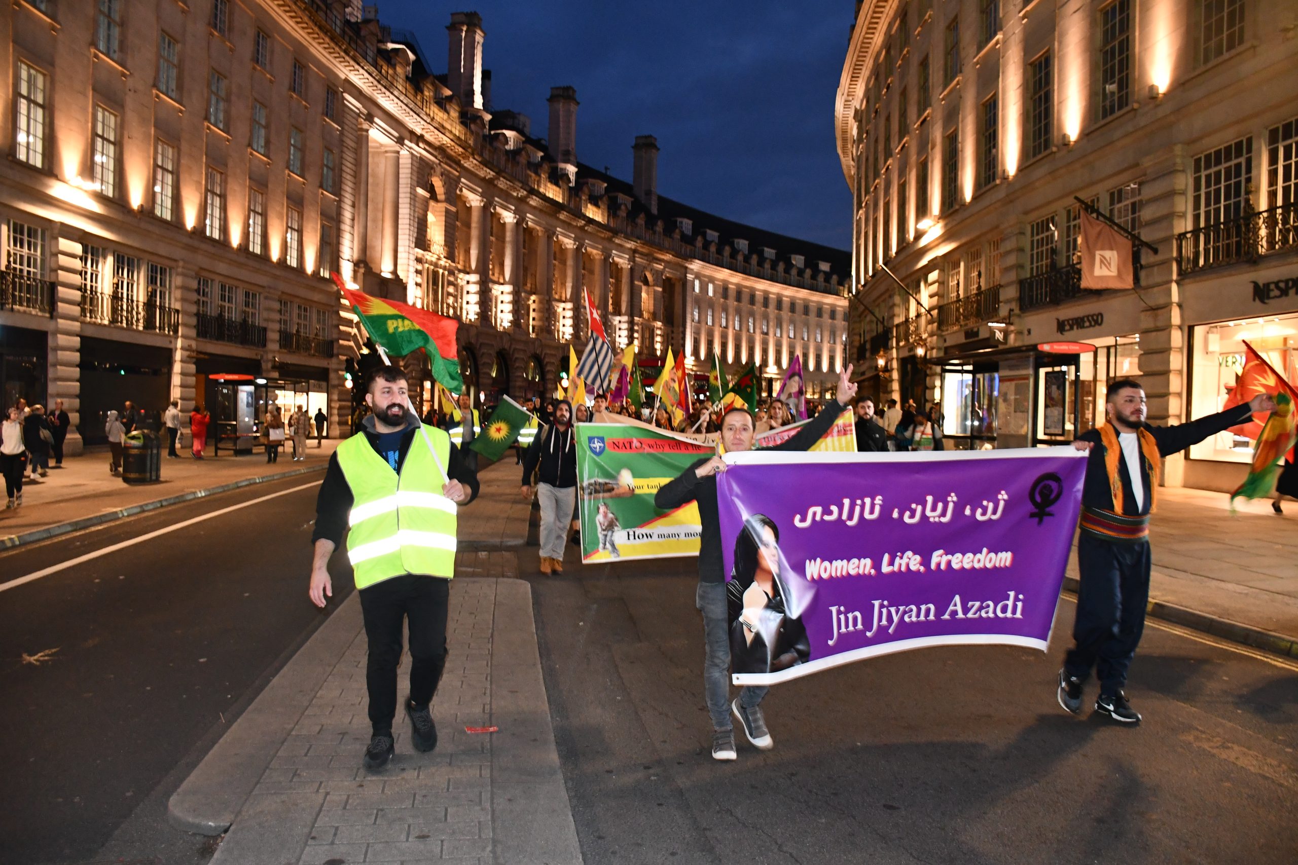 Eylem sonunda TCŞ, TekoJIN ve Londra’da enternasyonalist hareketi temsil eden Kurdistan Solidarity Network adına konuşmalar yapılırken, “Women, Life, Freedom; Jin, Jîyan, Azadî” sloganlarıyla eylem son buldu.