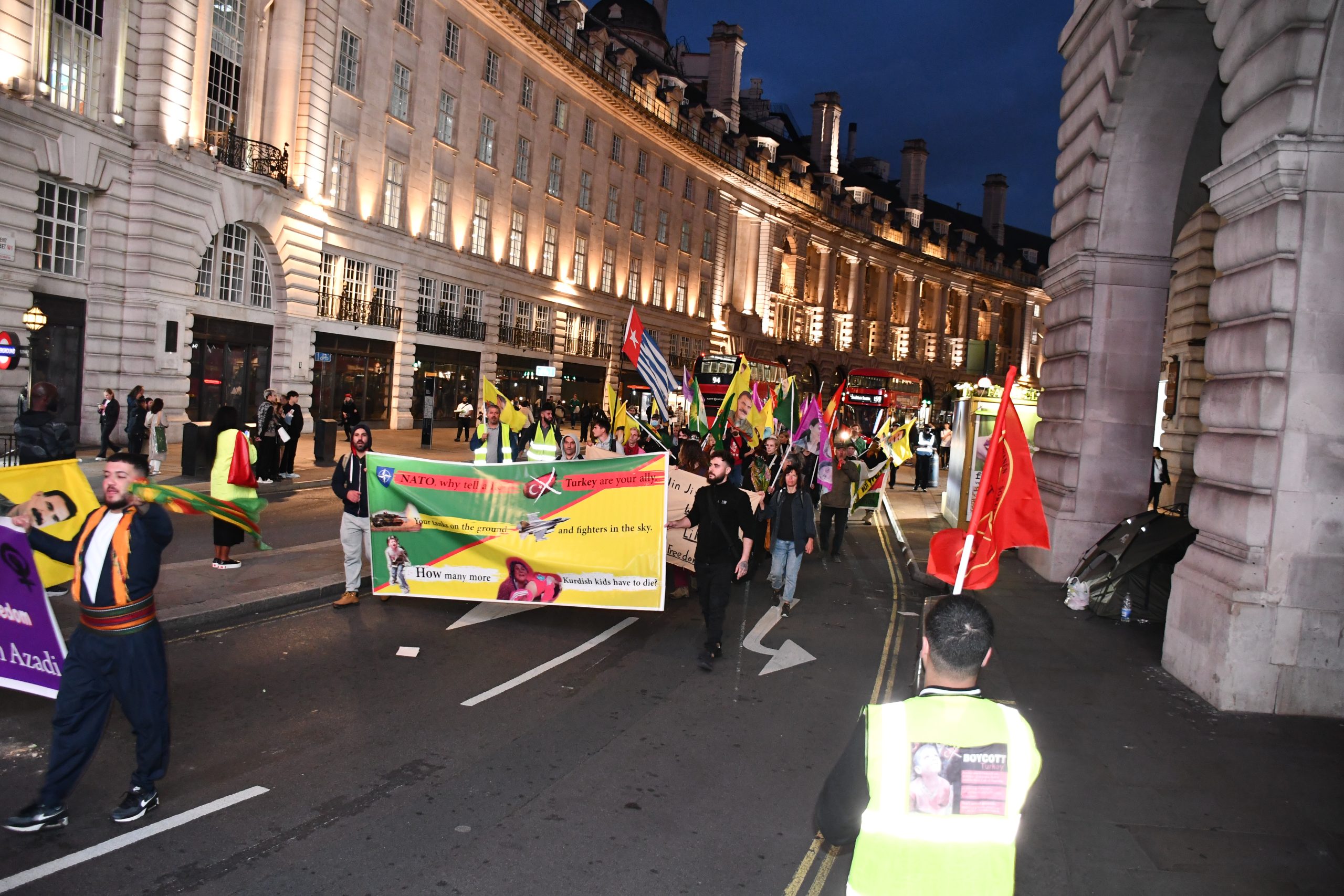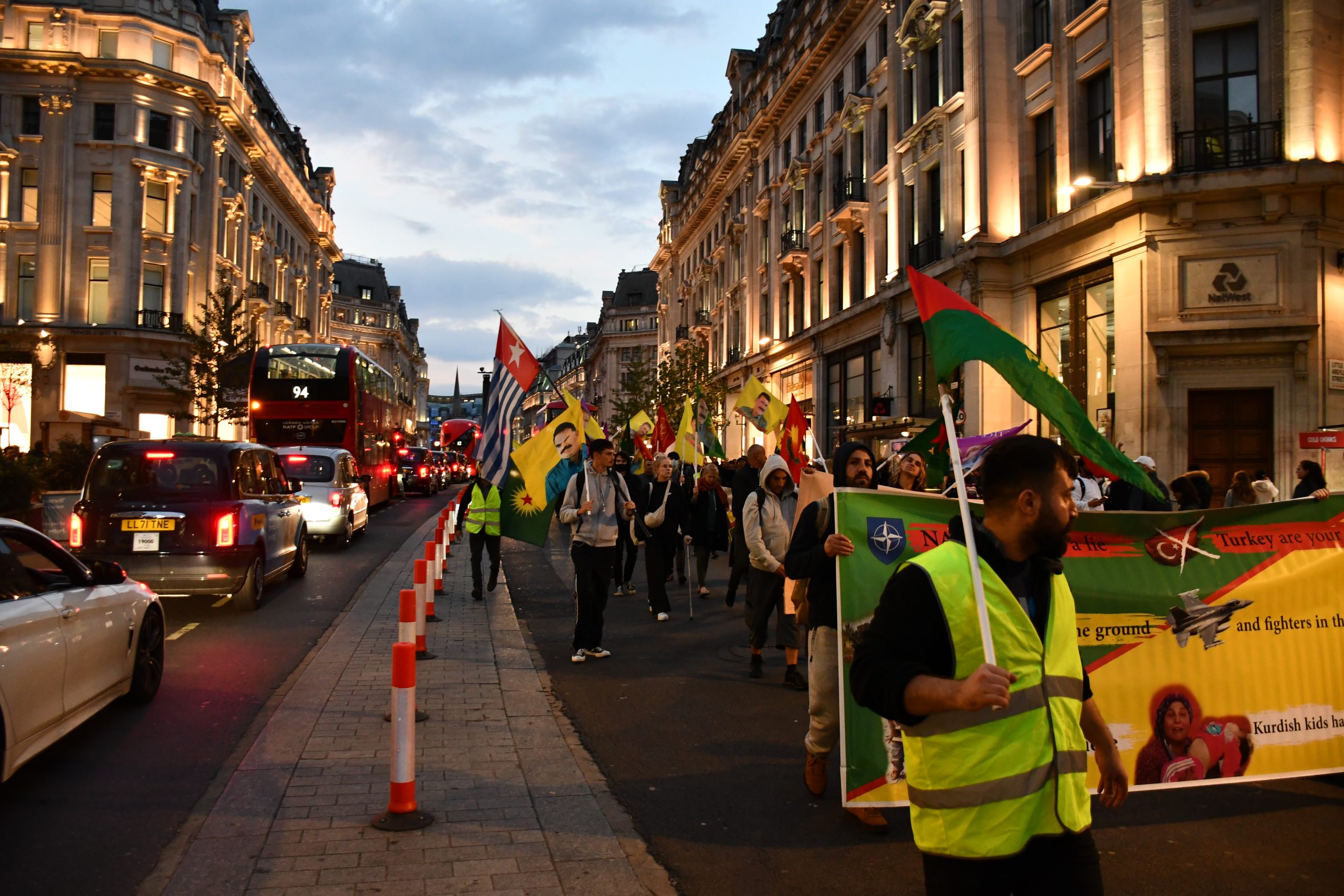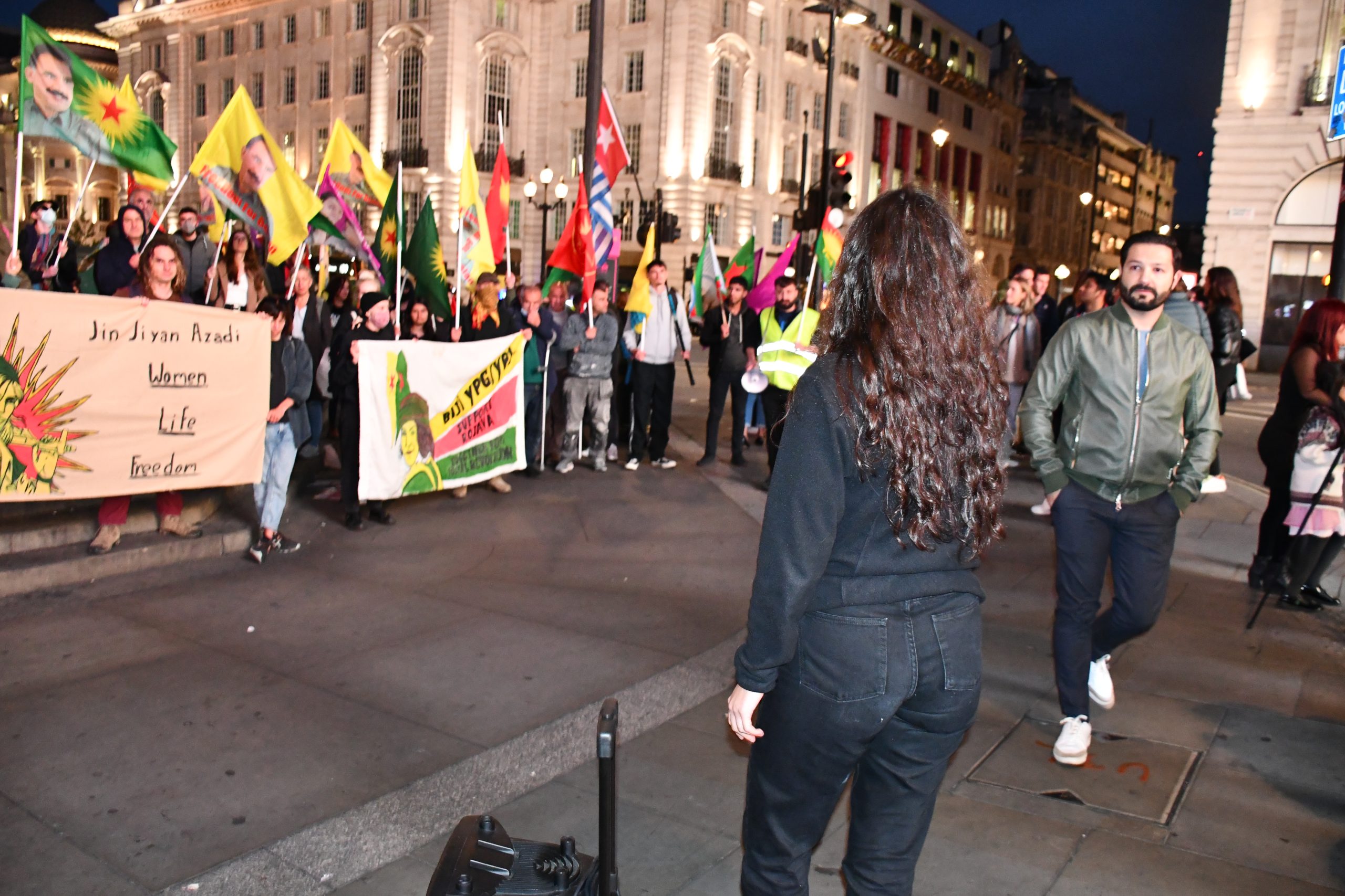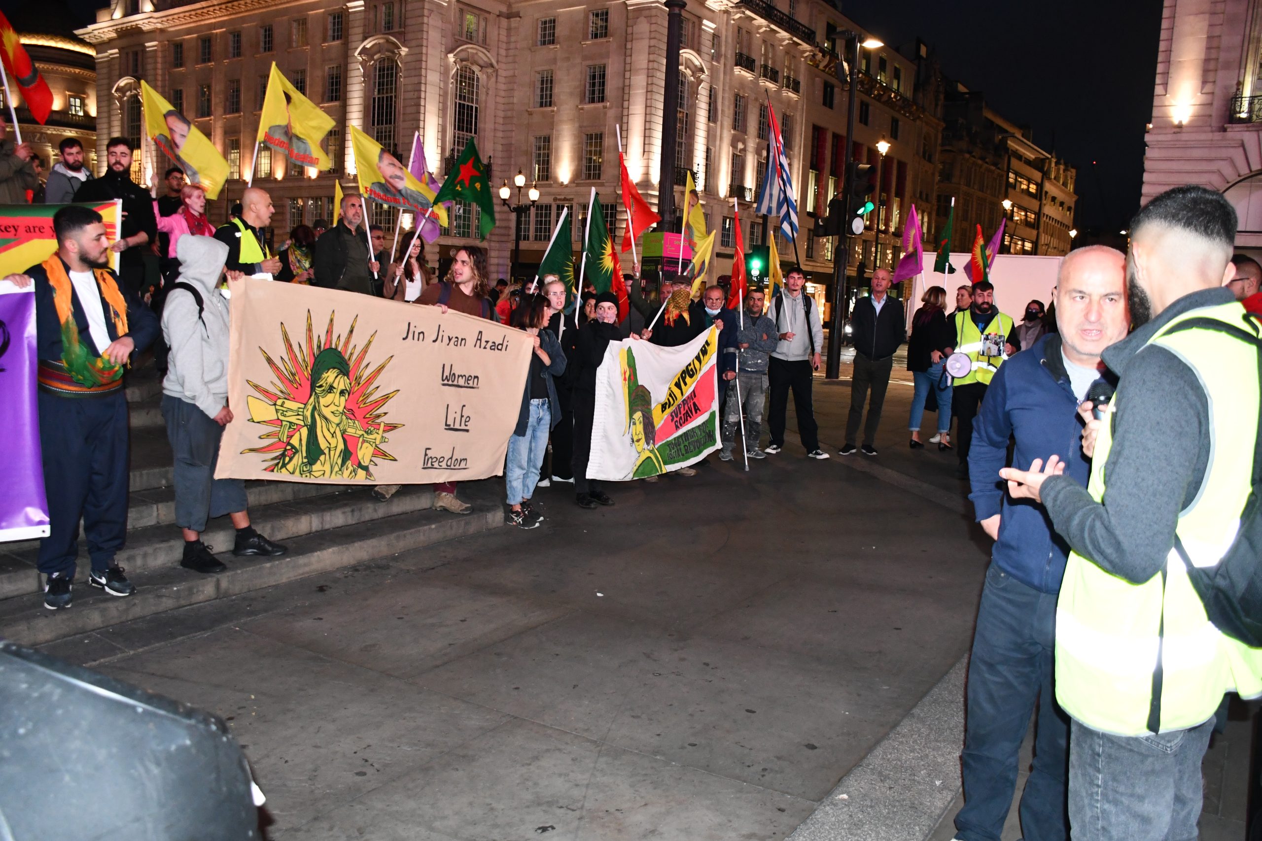 Eylem sonunda TCŞ, TekoJIN ve Londra’da enternasyonalist hareketi temsil eden Kurdistan Solidarity Network adına konuşmalar yapılırken, “Women, Life, Freedom; Jin, Jîyan, Azadî” sloganlarıyla eylem son buldu.